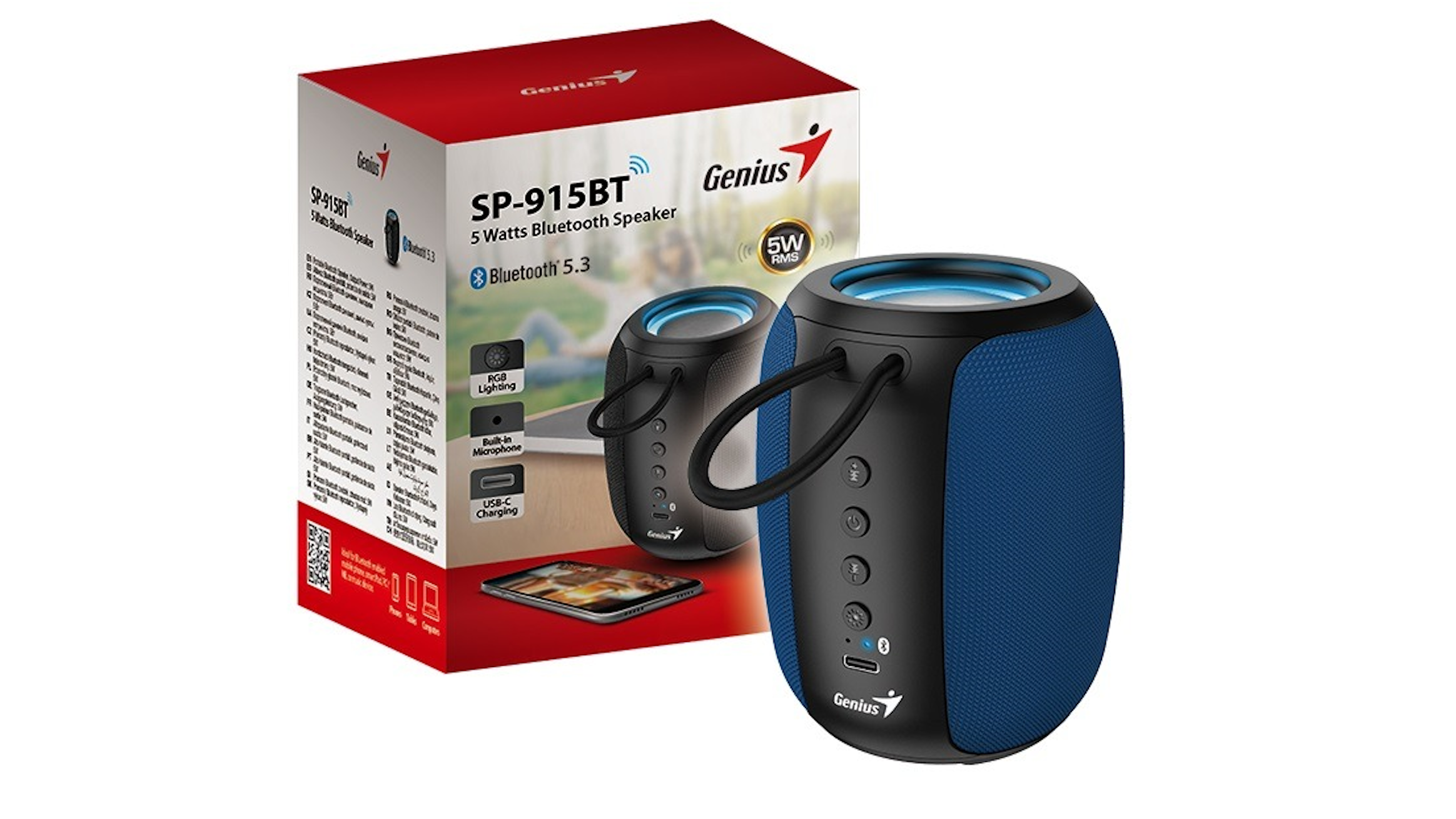 Genius SP-915BT is an one-piece compact 5-Watt Bluetooth speaker. With built-in Bluetooth and microphone, you can connect to mobile phone, tablet, and laptops to play music or talk. Or even you can ask Windows Copilot AI assistant question; no need to type. Up to 6 hours playback, and USB-C charging cable included.