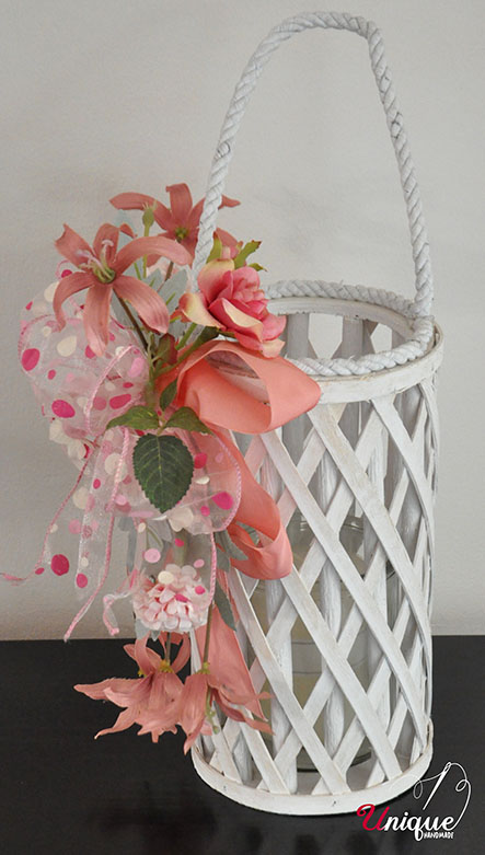 A beautiful white wooden lantern decorated whith flowers and ribbons. Features:
