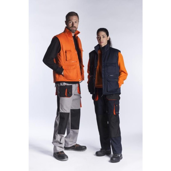 FAGEO BODY WARMER Body warmer with padding, 6 pockets and 2zipper pockets, latex on armholes for air tightness and black front buttons for a perfect fit. Shell fabric : 80% polyester + 20% cotton Lining: 100% polyester 190T Padding: polyester 180gr/m2
