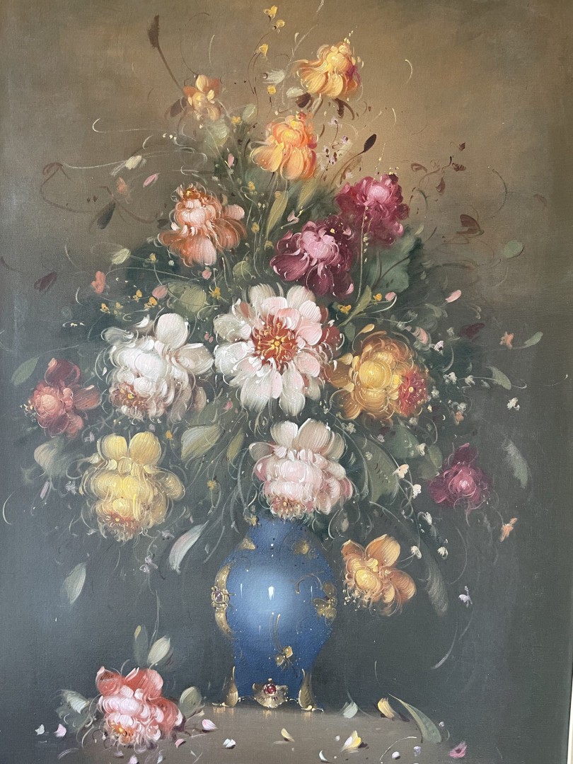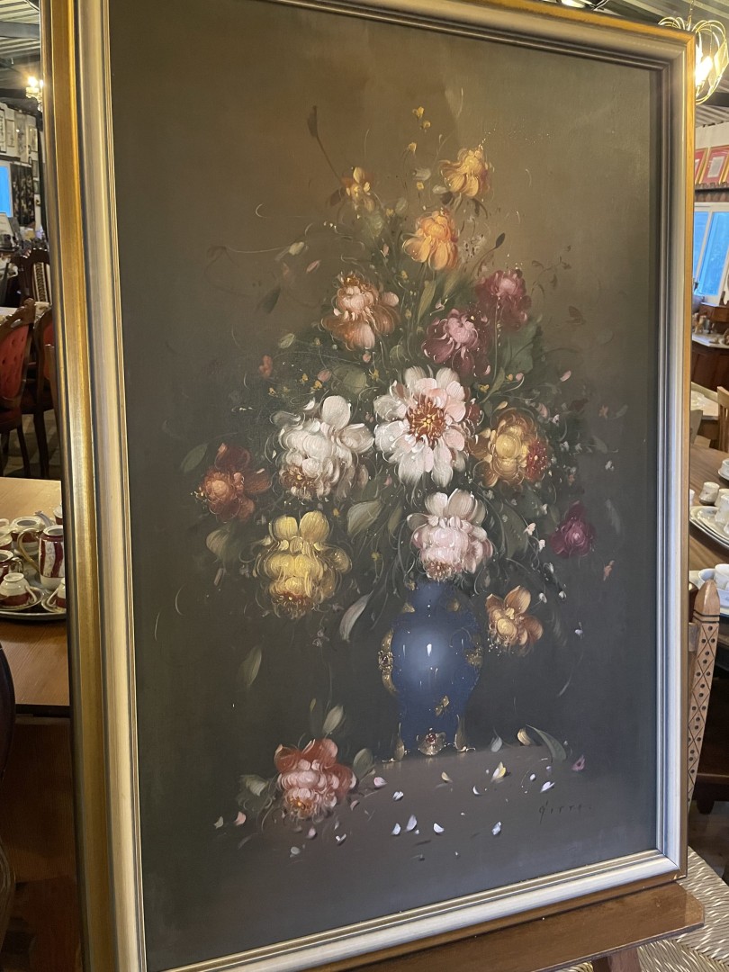 Vintage signed floral oil painting in gold frame, hand-painted with romantic brushwork. Likely from the 1960s–1970s, perfect for elegant interiors. \n \nSpecial Aspect: \n \nThe oil paint’s texture gives the petals a soft, lifelike glow—making the bouquet feel freshly gathered. This exquisite vintage floral oil painting, signed by the artist, is a breathtaking example of mid-century still life art. Featuring a richly detailed bouquet in a deep blue vase, the composition is bursting with soft pinks, deep reds, golden yellows, and ivory whites. The textured brushstrokes create a lifelike, almost three-dimensional effect that brings the flowers to life. \n \nHoused in a wide, elegant gold-tone frame, the piece exudes timeless sophistication and would make a statement in any classic or romantic interior. \n \nThis artwork, likely from the 1960s–1970s, captures the spirit of an era where quality, romance, and atmosphere were central to design. The signature at the bottom corner adds a personal touch to this unique creation. \n \nStorytelling: \n \nThis painting isn’t just decoration—it’s a quiet whisper of nature’s poetry. Each flower, captured mid-bloom, seems to be caught in a moment of time—where beauty and stillness meet. You can almost imagine the scent of the petals or the rustle of a breeze through an open window. Whether placed in a living room, hallway, or personal library, this artwork adds a touch of soul and soft grandeur to your everyday life.
