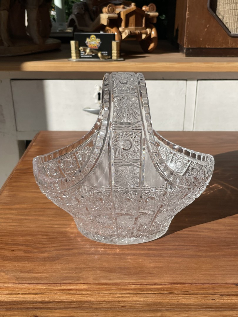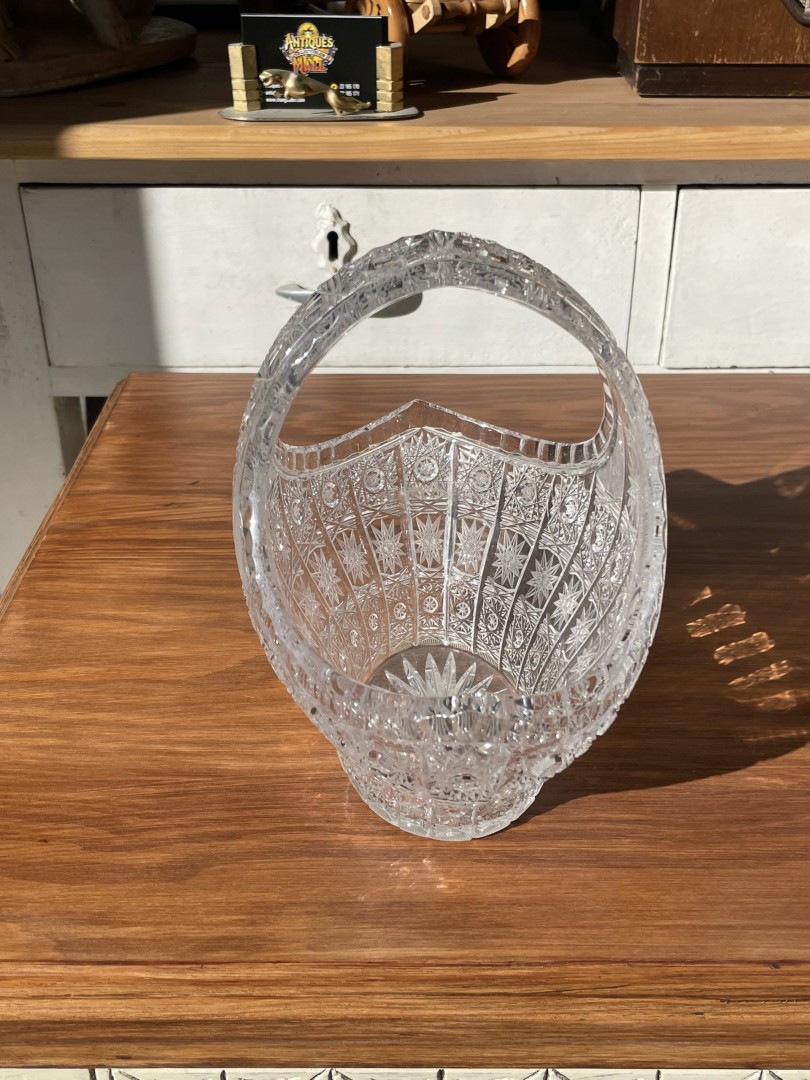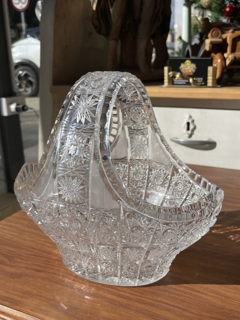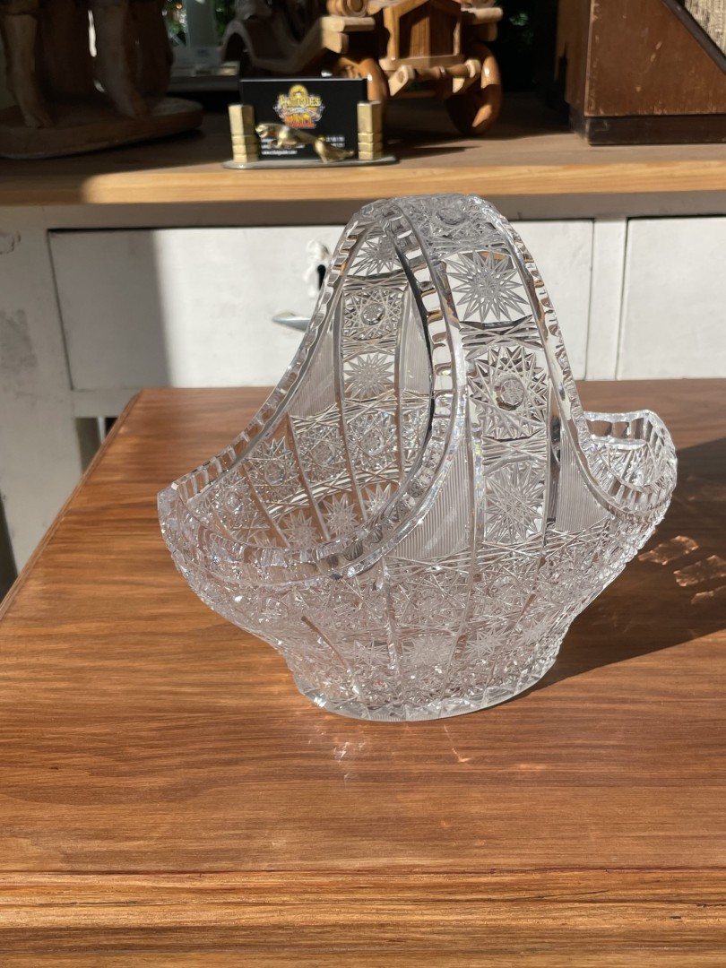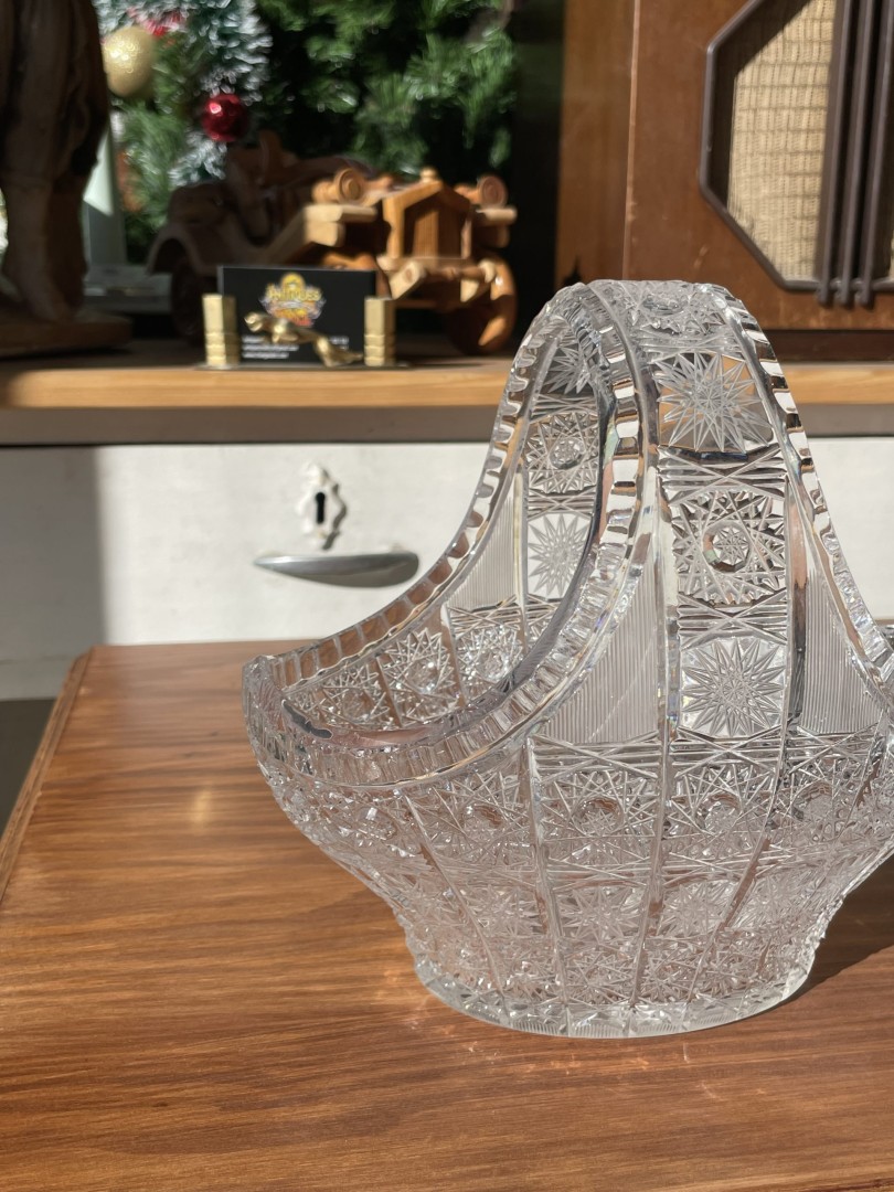 Vintage Bohemian cut crystal basket with intricate starburst patterns, mid-20th century. A luxurious decorative piece with timeless elegance. \n \nSpecial Aspect: \n \nBohemian craftsmanship and exquisite starburst cut design make this basket a rare and luxurious find. This stunning Bohemian cut crystal basket, crafted in the mid-20th century, showcases the unparalleled artistry of traditional Czech glassmakers. Featuring intricate starburst patterns and a gracefully arched handle, this basket embodies timeless elegance. Perfect as a decorative centerpiece or for holding fruits and flowers, it is a rare example of refined craftsmanship and sophisticated design. \n \nEstimated Era: \n \n1950s-1960s, Mid-Century Bohemian Crystal \n \n Storytelling: \n \nPicture this radiant Bohemian crystal basket catching the sunlight, casting sparkling reflections that fill your room with warmth and elegance. Its timeless beauty tells a story of tradition, skill, and cherished memories.