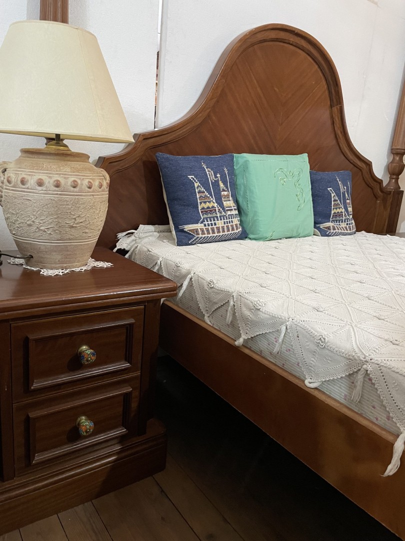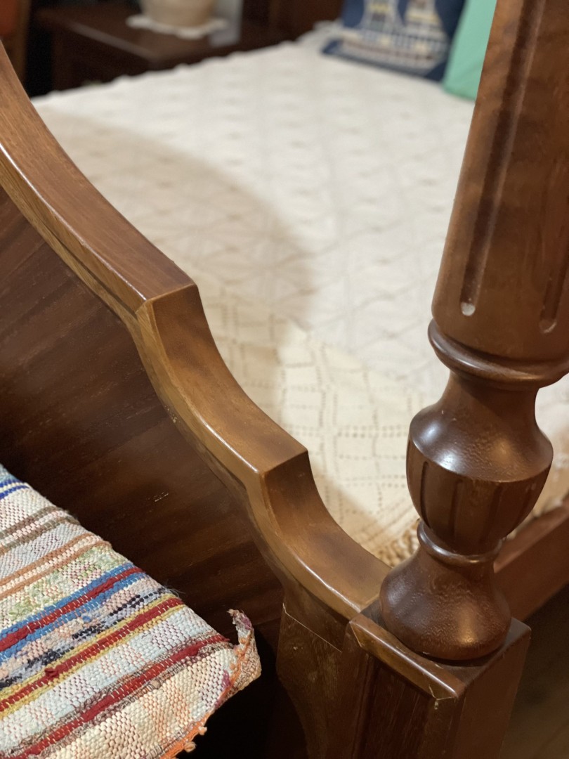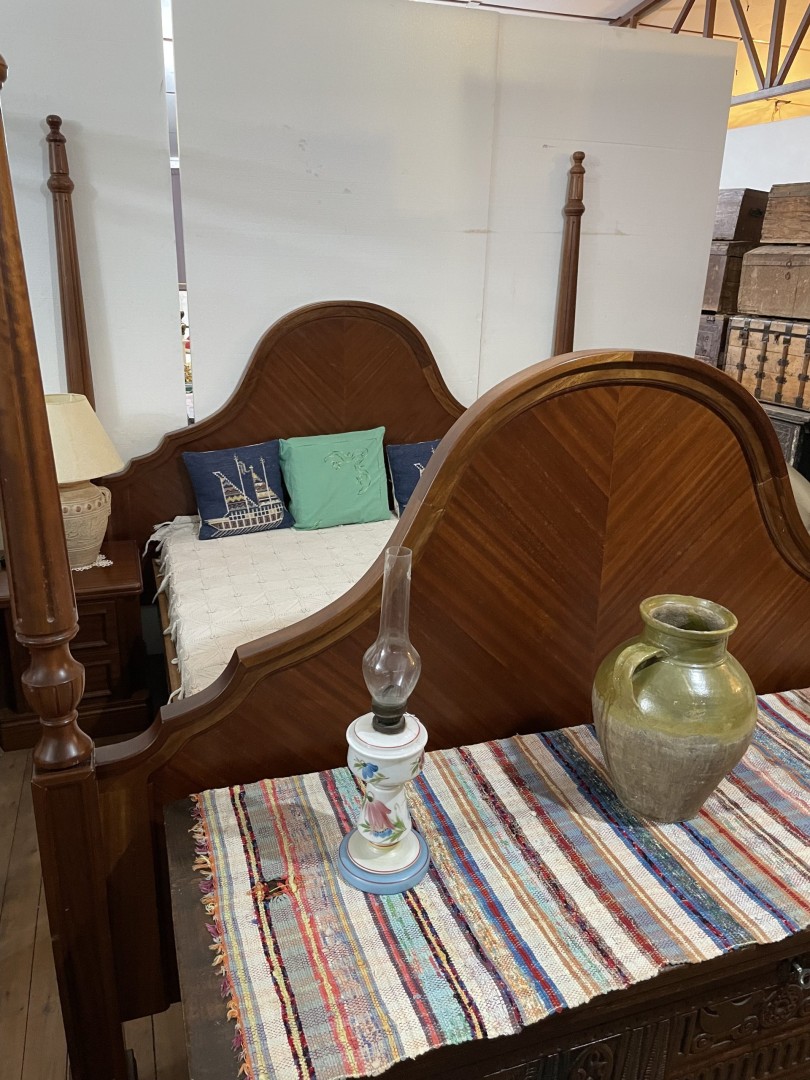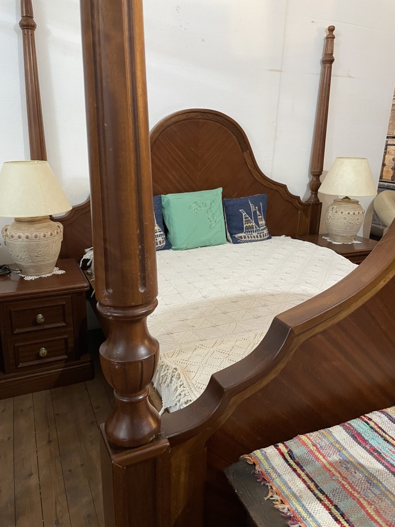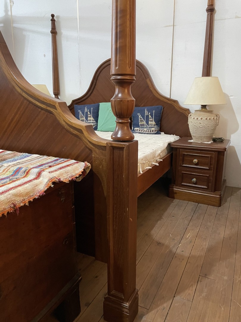 Transform your bedroom with this vintage handmade four-poster bed. Crafted from Iroko wood with elegant carved details, it’s a timeless piece of craftsmanship and comfort. \n \nSpecial Aspect: \n \nHandmade from premium Iroko wood, this bed’s graceful carvings and sturdy construction make it a unique and timeless centerpiece. This elegant vintage handmade four-poster bed is crafted from high-quality Iroko wood, known for its strength and rich, natural tones. The design features gracefully carved posts and a beautifully curved headboard, showcasing the remarkable artistry of the craftsman. This bed combines functionality with timeless style, making it a perfect centerpiece for your bedroom. Its sturdy construction and intricate detailing reflect the enduring appeal of vintage furniture. \n \nStorytelling: \n \nImagine waking up in this magnificent Iroko wood bed, surrounded by the warmth and elegance of its handcrafted design. Each curve and detail tells a story of dedication and skill, ready to bring timeless charm and comfort to your bedroom.