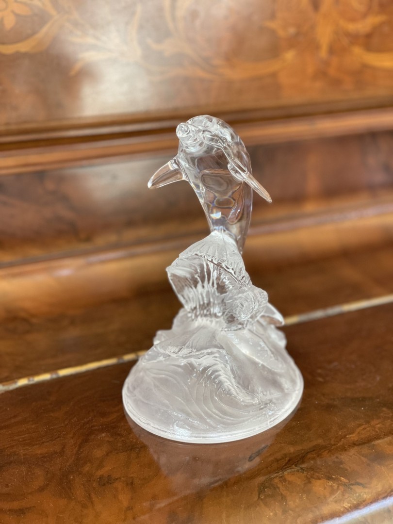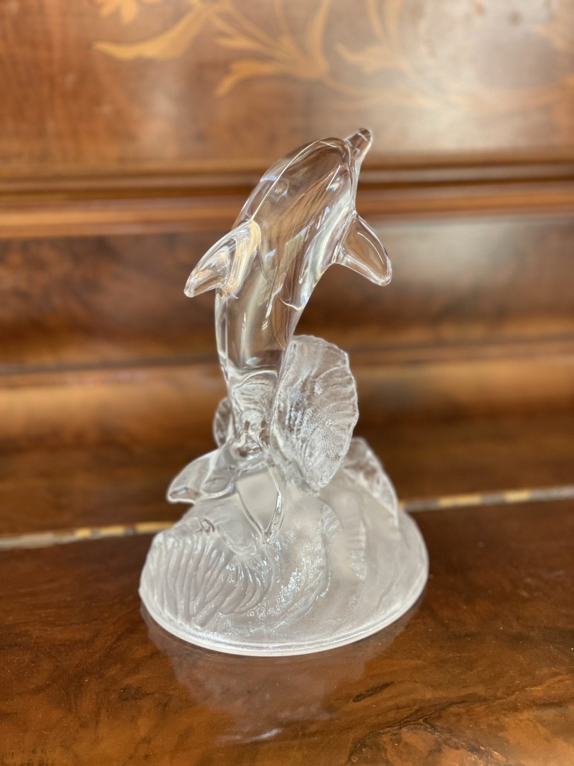Decorative vintage dolphin figurine in clear and frosted glass, showing the animal leaping over stylized waves. \n \nSpecial Aspect: \n \nThe contrast between frosted and transparent glass gives the piece an eye-catching, lifelike effect in natural light. This elegant vintage dolphin figurine captures the playful energy of the ocean in beautifully crafted frosted and clear glass. The design features a dolphin mid-leap above stylized waves, combining smooth transparency with textured details to bring movement and light into any space. A timeless decorative piece that adds a coastal or nautical touch to shelves, dressers, or display cabinets. Ideal for collectors of marine life glass art or ocean-themed home accents. \n \nEstimate Era: \n \nLikely 1980s–1990s \n \nStorytelling: \n \nThis graceful dolphin, frozen mid-leap, feels like a joyful moment captured from the sea—a symbol of freedom and fluid beauty. It’s more than décor—it’s a reminder of nature’s poetry.