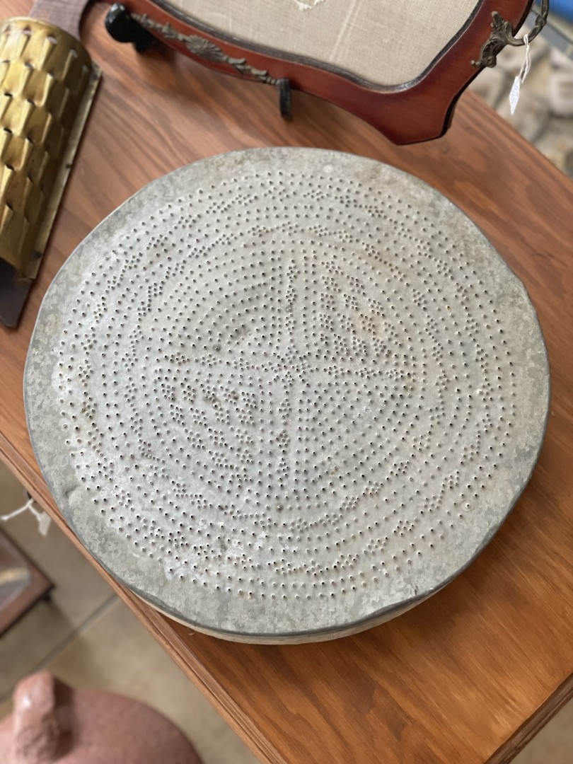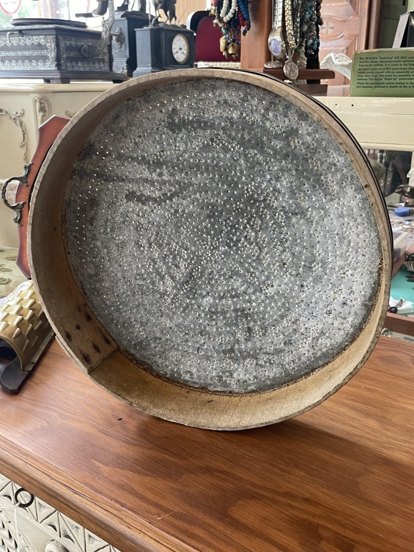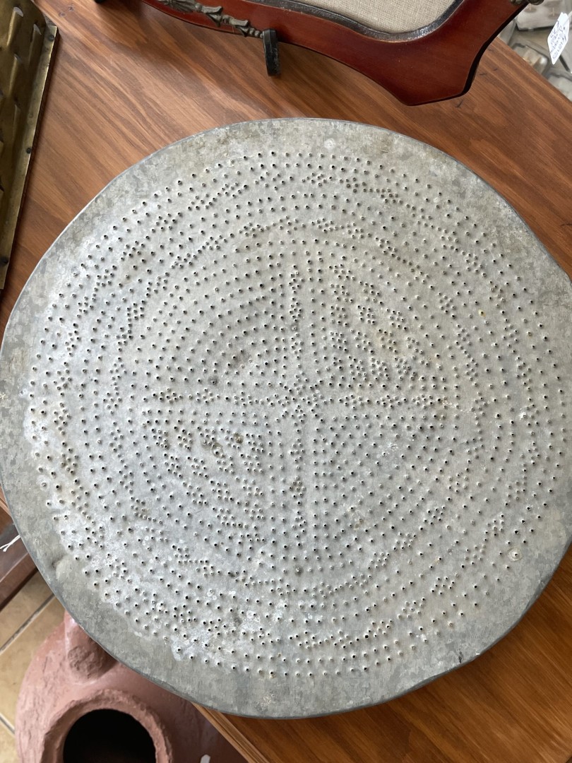 Vintage galvanized wheat from Cyprus with wooden frame, used in traditional grain processing. A unique collectible and rustic decor item. \n \n🌟 Special Aspect: \n \nThe handcrafted perforated pattern forms a spiral and cross, symbolizing both utility and folk artistry — a handmade detail rarely seen in modern items. This authentic vintage Cypriot wheat, crafted with a galvanized perforated metal surface and thick wooden frame, is a striking example of traditional Mediterranean agricultural tools. Used for centuries in Cypriot villages to sift wheat and separate grains from chaff, this piece reflects both functionality and folk craftsmanship. \n \nFeaturing a spiral pattern of tiny punctures, it’s not only a utilitarian object but a decorative piece full of heritage and rural symbolism. It makes a beautiful rustic wall display, a unique table centerpiece, or a cultural collector’s item. \n \nWhether you’re drawn to farmhouse aesthetics or Cypriot heritage, this is a rare piece that connects you to a simpler, grounded way of life. \n \n🕰️ Estimated Era: \n \nMid-20th Century (circa 1950s–1970s) \n \n💬 Storytelling: \n \nOnce used in village courtyards under the Mediterranean sun, this sieve carries stories of hardworking hands, seasonal harvests, and generations that lived close to the land. Today, it becomes a symbol of authenticity — a tangible connection to Cypriot roots and timeless tradition.