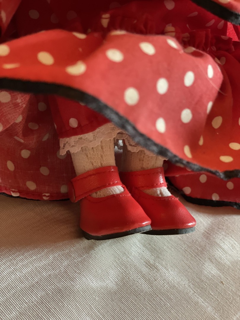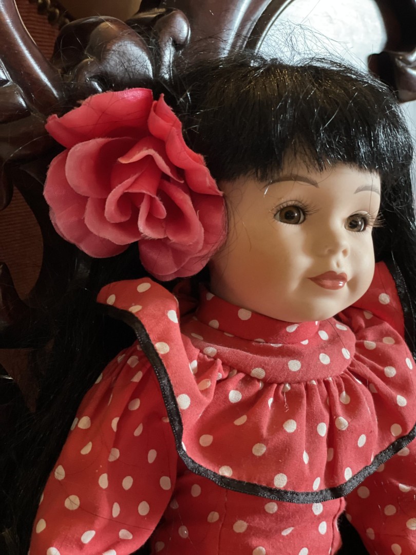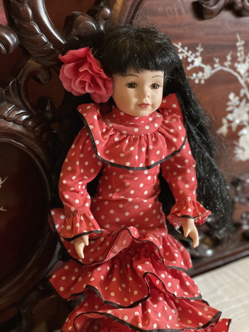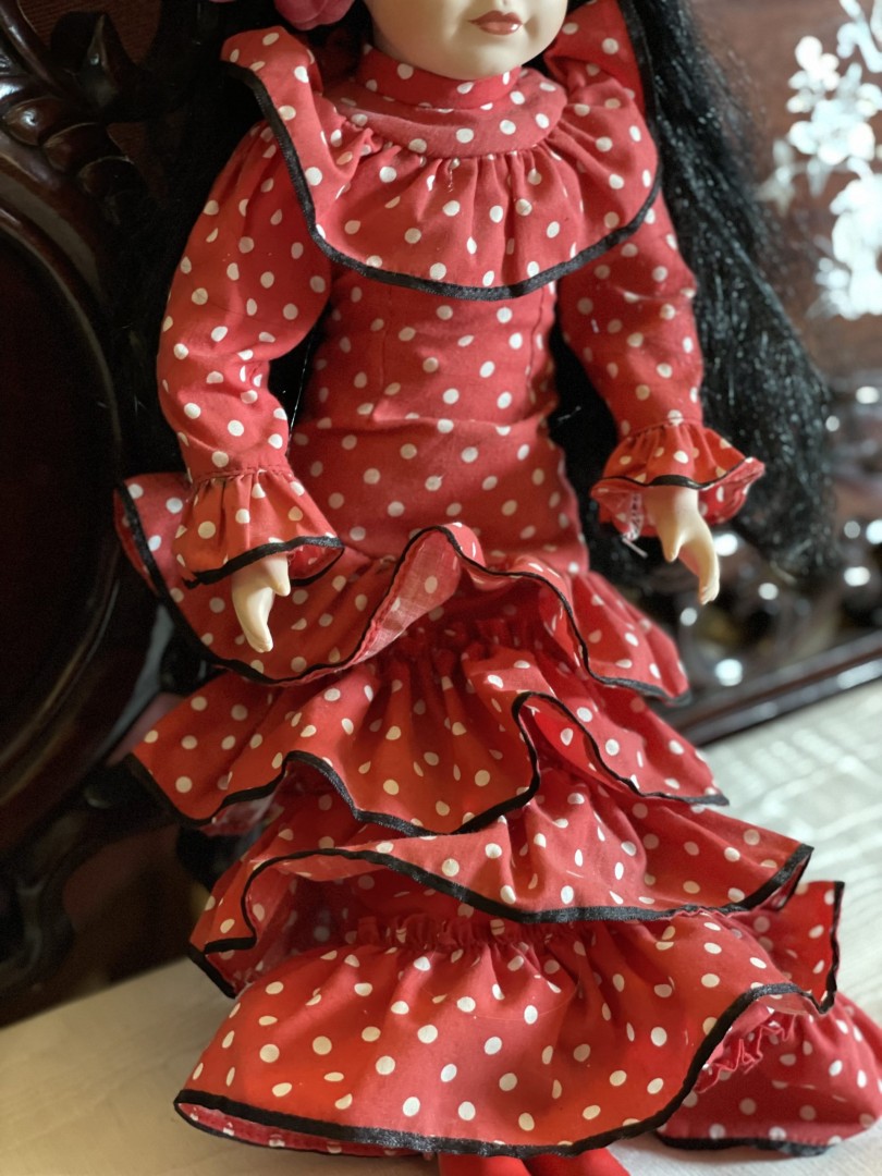 This vintage Spanish Flamenco porcelain doll (c. 1980s-1990s) radiates traditional charm with her vivid red polka-dot dress, black flowing hair, and floral hairpiece. A rare collectible for doll lovers and Flamenco admirers alike. \n \nSpecial Aspect: \n \nHer dress, meticulously crafted with layered ruffles and black trim, reflects the authentic Flamenco dancer’s attire, making her a stunning representation of Spanish culture. Step into the charm of Spanish culture with this vintage Spanish Flamenco porcelain doll, dressed in a stunning red polka-dot ruffled dress with black trim. Likely from the 1980s-1990s, this handcrafted doll captures the essence of traditional Flamenco style, featuring long flowing black hair, a delicate porcelain face, and a bold red flower tucked behind her ear. Her elegant dress, inspired by authentic Sevillana fashion, exudes passion, rhythm, and grace - making her a perfect collectible for vintage doll enthusiasts, Flamenco lovers, or Spanish culture admirers. \n \nEmotional Storytelling: \n \nImagine this beautiful doll sitting on a shelf in a sunlit Spanish home, where the echoes of Flamenco guitars fill the air. Her dress sways as if she’s about to twirl into a dance, bringing warmth, passion, and tradition into any space. Whether you ‘re reminiscing about a trip to Spain or dreaming of one, this doll tells a timeless story of movement, culture, and artistry.