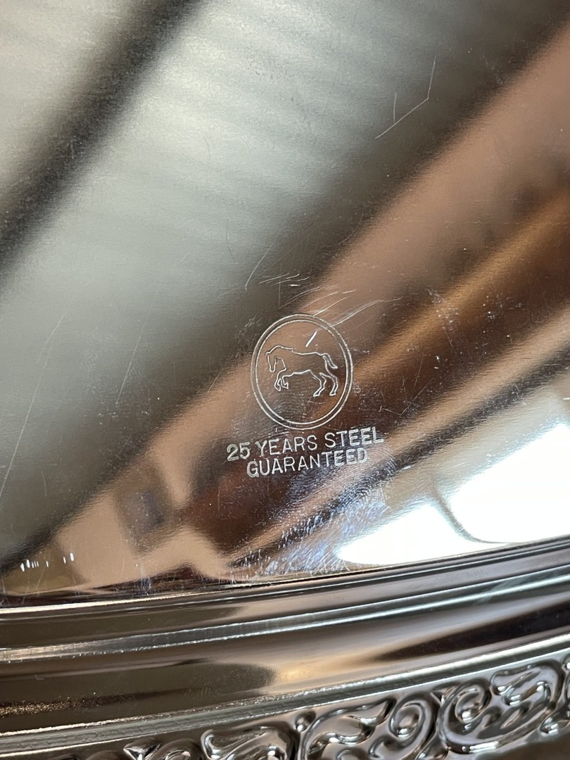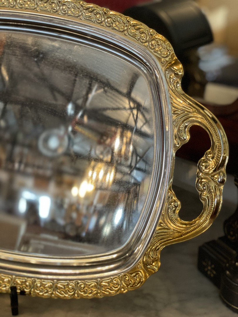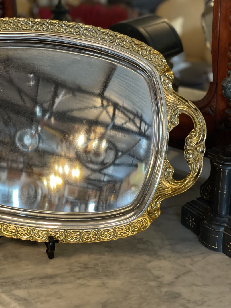 Luxurious vintage silver tray with gold ornate edges and a 25-year steel guarantee—stunning and functional. \n \nSpecial Aspect: \n \nBacked by a 25-year guarantee, this tray is as enduring in quality as it is in style. This elegant vintage serving tray features a radiant silver-toned center with an elaborate gold-gilded edge and handles, perfect for adding a touch of luxury to any gathering or interior display. Crafted from durable stainless steel and backed by a 25-year guarantee, it combines timeless beauty with lasting quality. The intricate baroque-inspired patterns along the rim reflect the ornate styling popular in late 20th-century decorative arts, making this piece likely from the 1980s–1990s. \n \nIts sturdy dual handles provide both form and function—making it ideal for both use and display. Whether serving guests, presenting a tea set, or simply elevating your décor, this tray tells a story of refined hospitality and old-world charm. \n \nEra Estimate: \n \nCirca 1980s–1990s \n \nStorytelling: \n \nImagine hosting an intimate gathering, where your refreshments are served on a tray that once graced elegant tables of the past. This is not just a serving piece—it’s a statement of taste, care, and timeless hospitality.