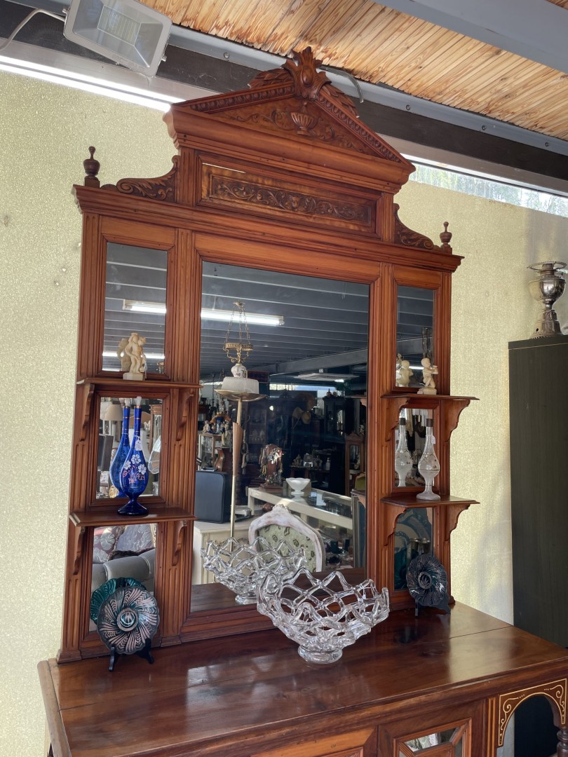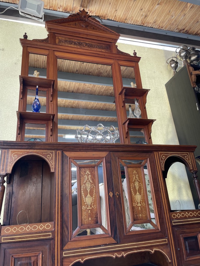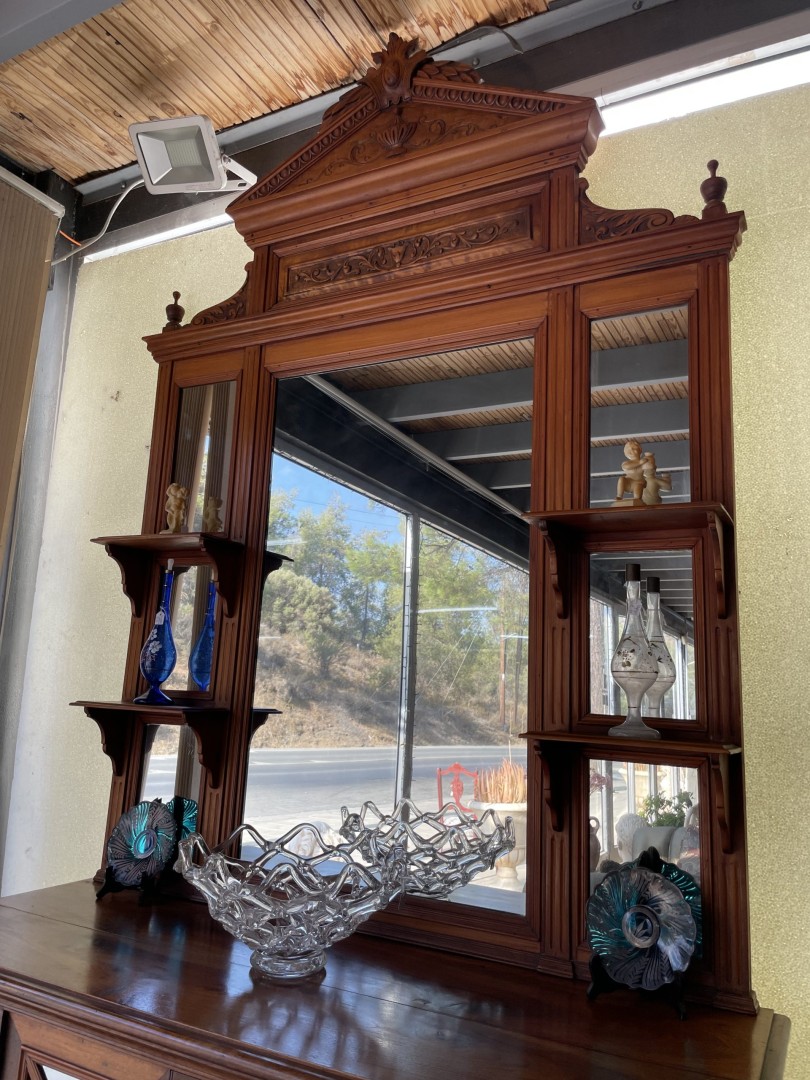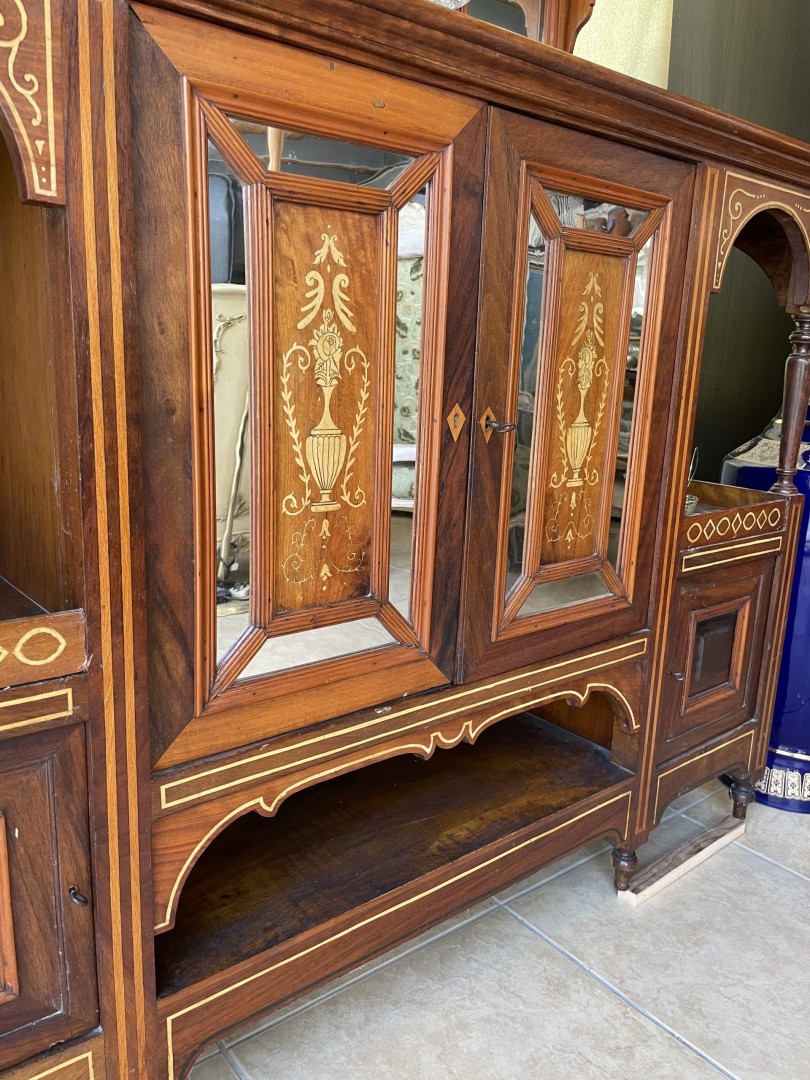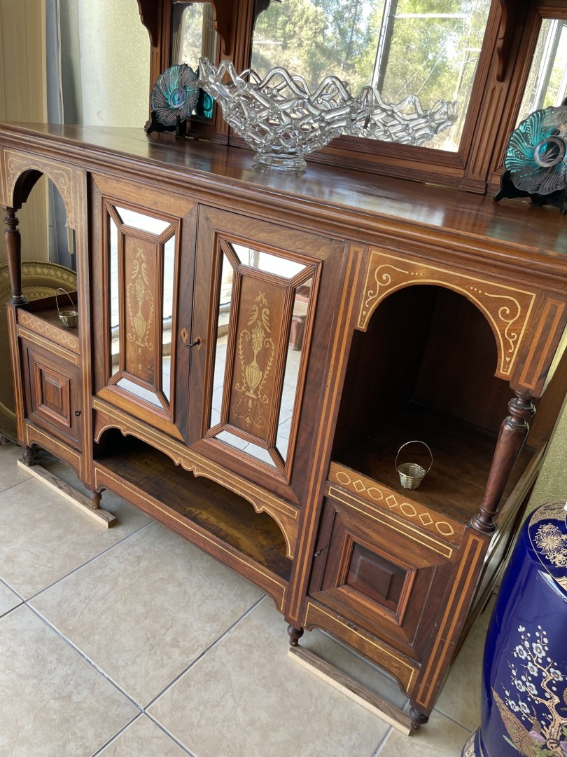 Magnificent antique sideboard with mirror, inlay, and carved detailing. A true Victorian gem from 1890–1910. \n \n🌟 Special Aspect: \n \nExceptional hand-inlaid urn motifs and ornate carved pediment crown the piece with timeless elegance. \n \n🕰️ Estimated Era: Circa 1890–1910 A rare and elegant Victorian-era sideboard buffet with built-in mirror, handcrafted in Central Europe around 1890–1910. This exquisite cabinet features finely detailed inlays with neoclassical urn motifs, hand-carved pediment, and arched side alcoves. The mirrored back panel is framed by charming mini shelves, perfect for displaying fine collectibles. Crafted from solid wood (possibly walnut), this piece is not only decorative but a functional statement for luxurious interiors. \n \nWhether placed in an entrance hall, dining room, or boutique hotel, this sideboard commands attention and brings timeless class to any room. \n \nIdeal for antique collectors, interior designers, or those who want a unique, authentic piece of 19th-century craftsmanship in their space. \n \n🕰️ Estimated Era: \n \nCirca 1890–1910 \n \n💬 Storytelling: \n \nImagine the conversations this piece has silently witnessed: family gatherings, elegant soirées, and generations of stories passed down. This is not just furniture — it’s a living relic of another time, handcrafted with soul and devotion. Let it become the next chapter in your story.