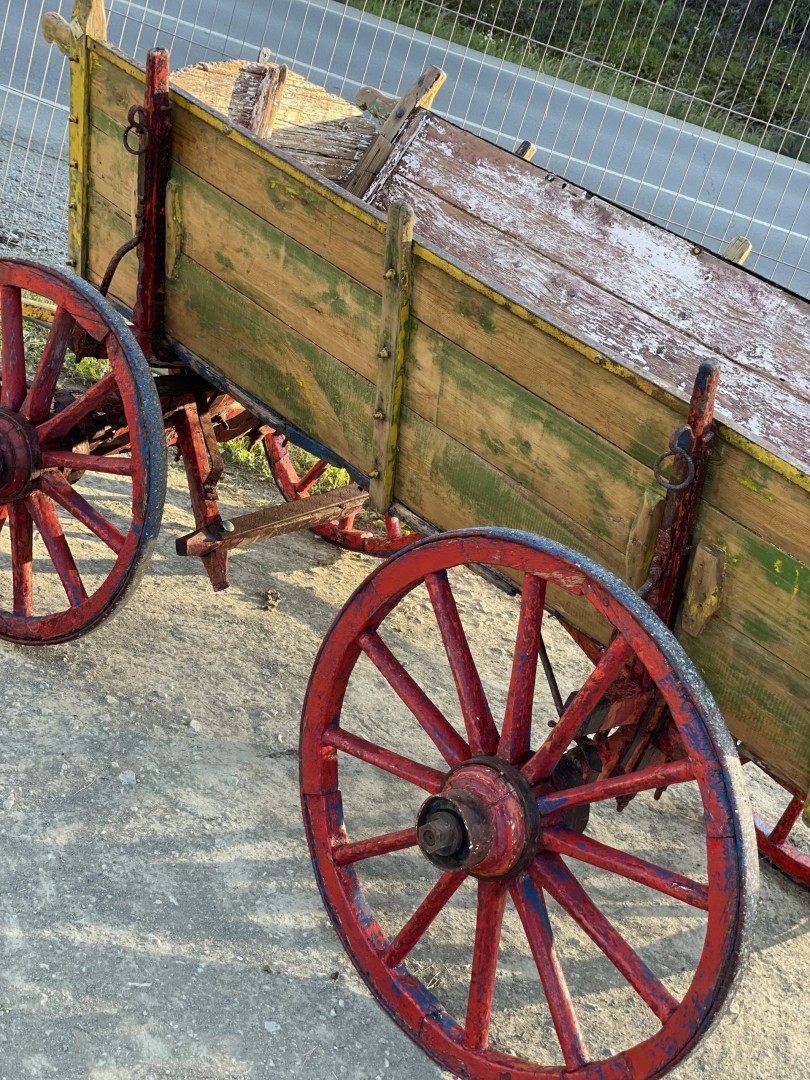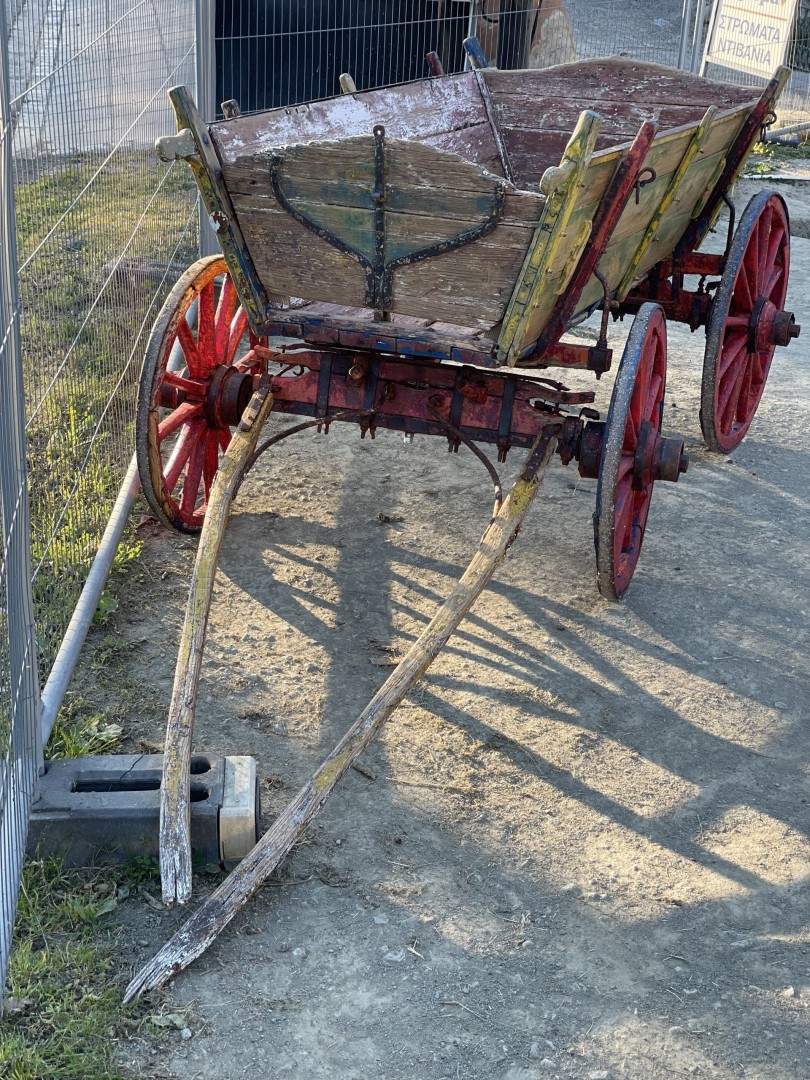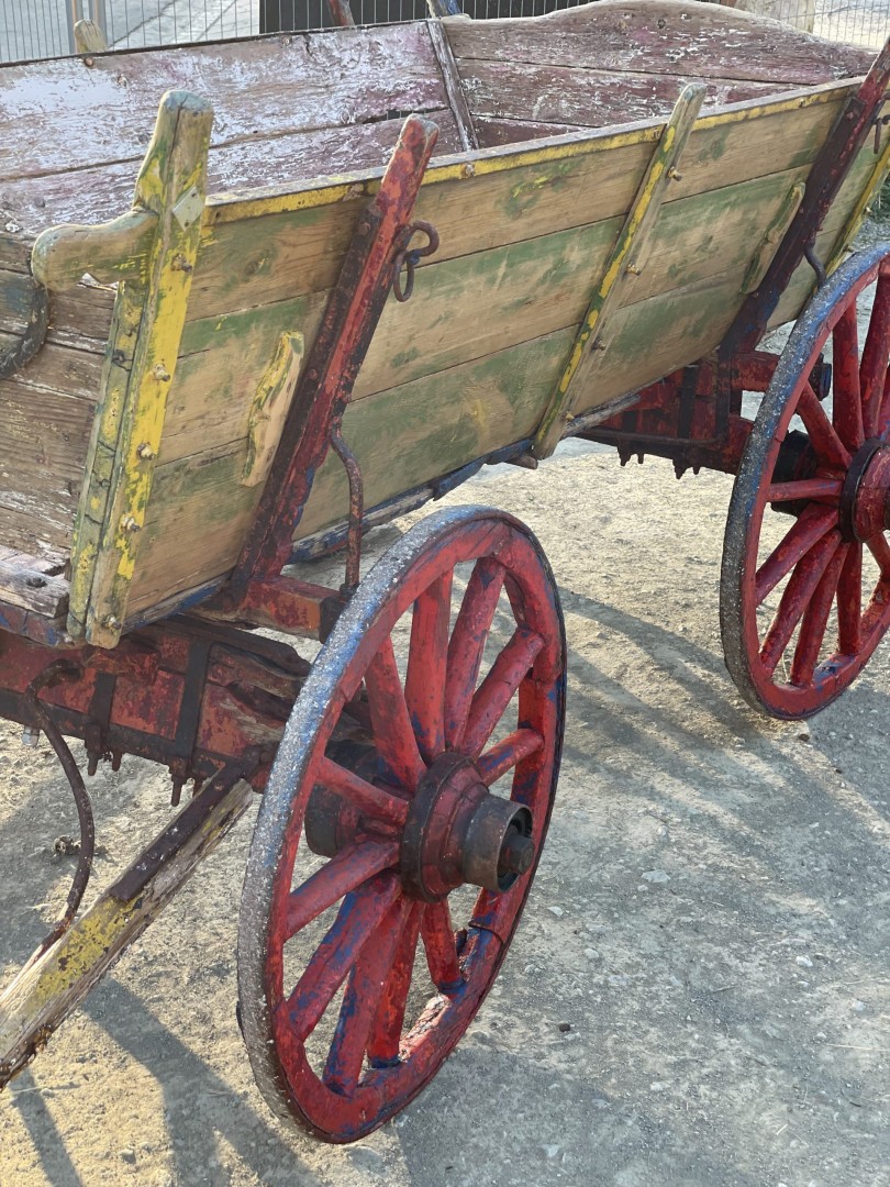 This handcrafted wooden farm wagon from the late 19th to early 20th century features original red-painted wheels and iron reinforcements. A piece of agricultural history, perfect for collectors, decorators, or restoration enthusiasts. \n \nSpecial Aspect \n \nSkilled artisans crafted this wagon by hand. Its iron-reinforced wheels and aged wooden frame preserve its authentic rustic character - a true piece of history on wheels. This antique wooden farm wagon, crafted in the late 19th to early 20th century, reflects traditional agricultural craftsmanship. Its red-painted wheels, aged wood, and original iron fittings add rustic charm. Farmers once used it to transport crops, making it a piece of history. The wagon’s naturally weathered patina enhances its authenticity. Ideal for collectors, farm-style decor, vineyards, or restoration projects. \n \nPerfect for: Antique lovers, rustic home decor, wineries, and event spaces. \n \nStorytelling: \n \nPicture this wagon rolling across open fields, carrying the harvest of hardworking farmers. Horses once pulled it under golden sunsets, turning it into a symbol of resilience and history. Now, it waits for a new chapter in your home or collection.