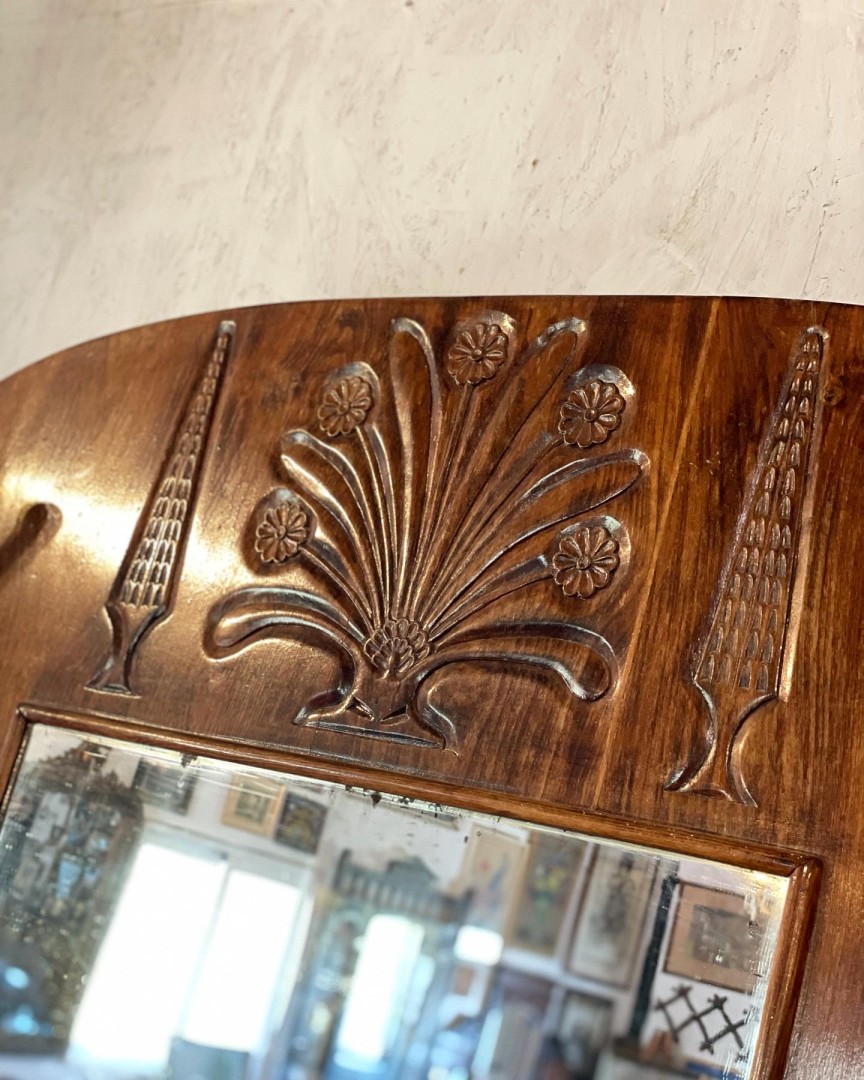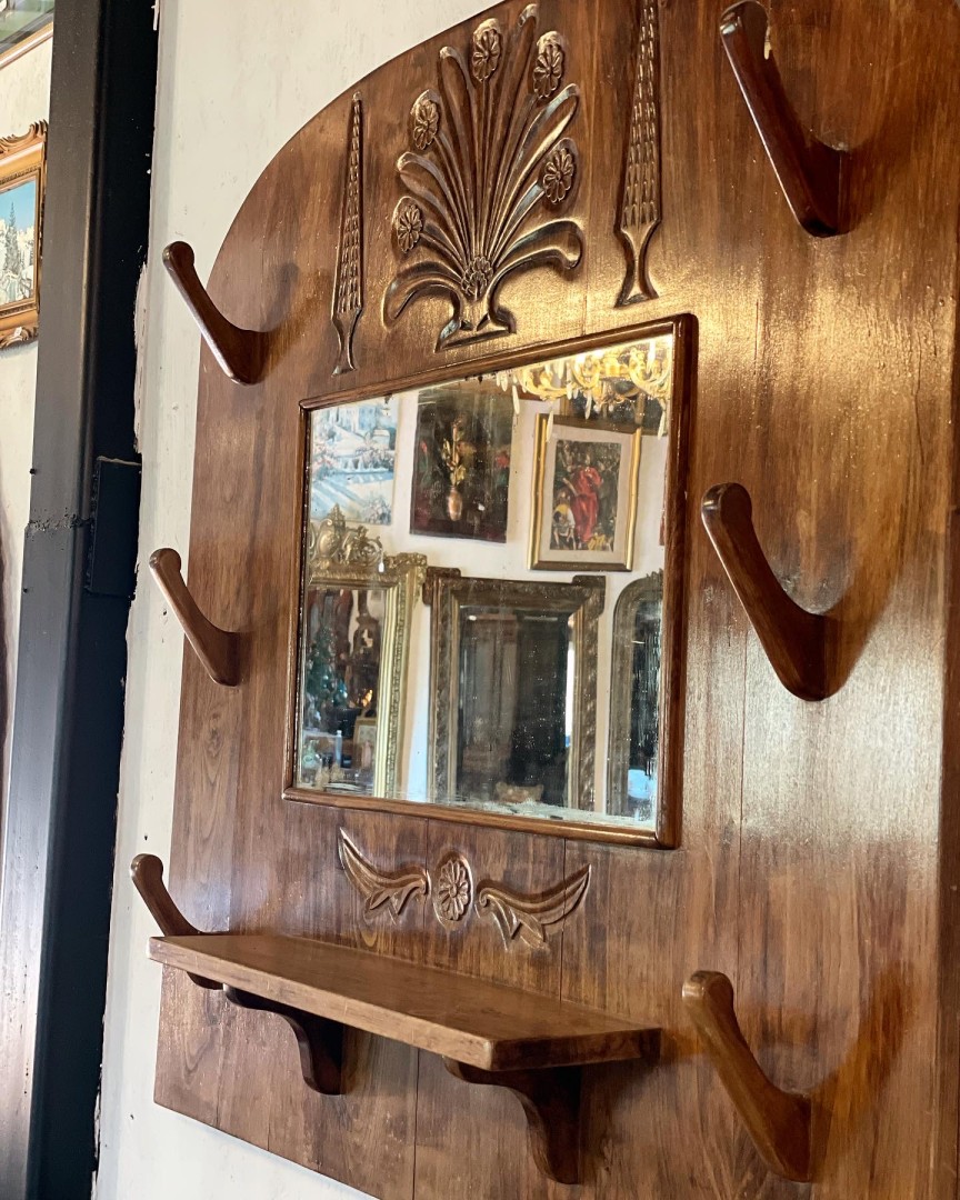 A Cypriot wooden mirror and coat rack featuring Cypriot botanical representations of cypresses and flowers.