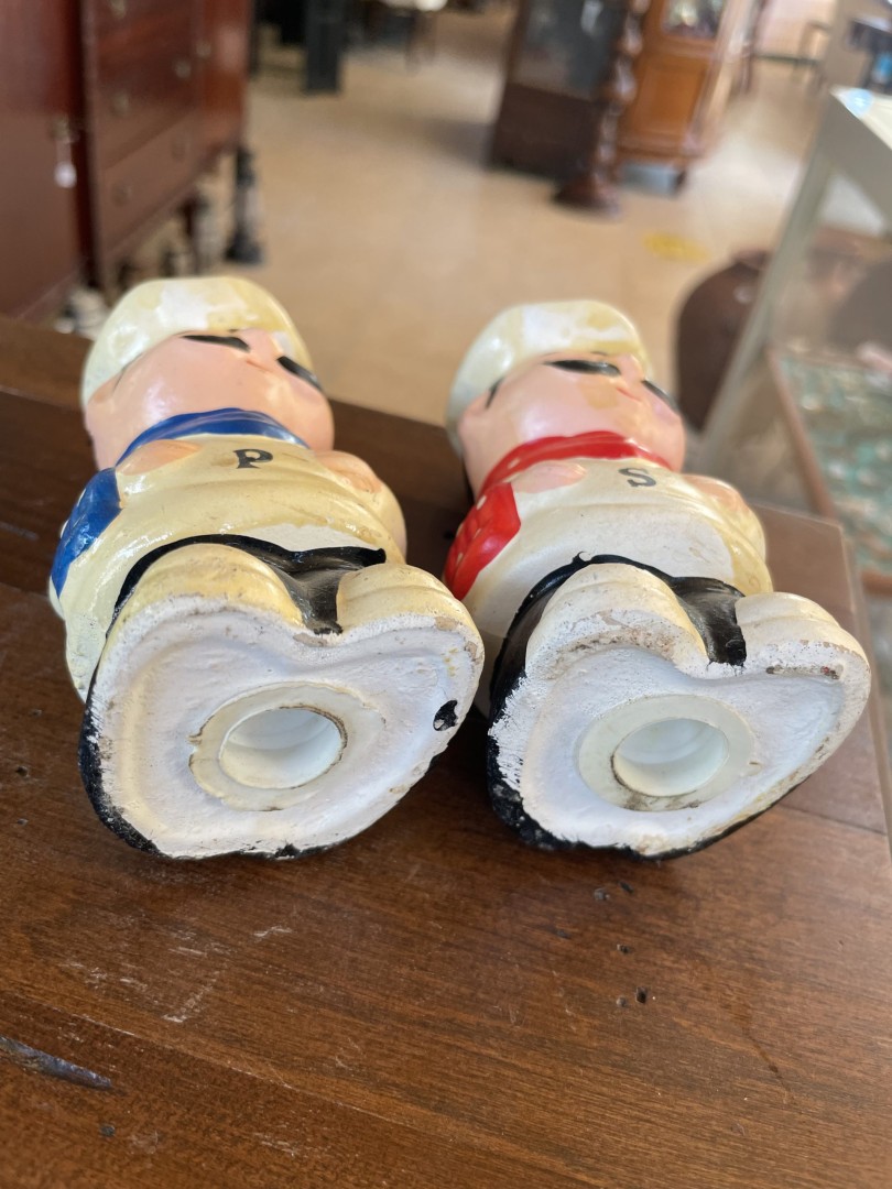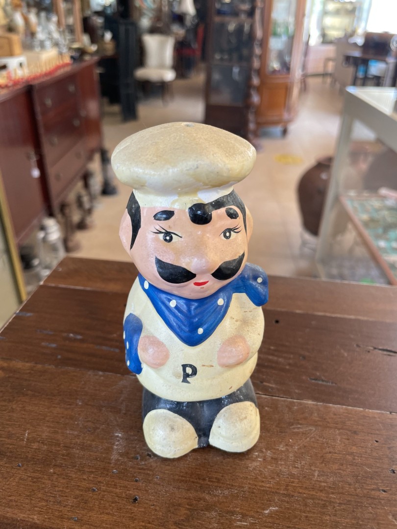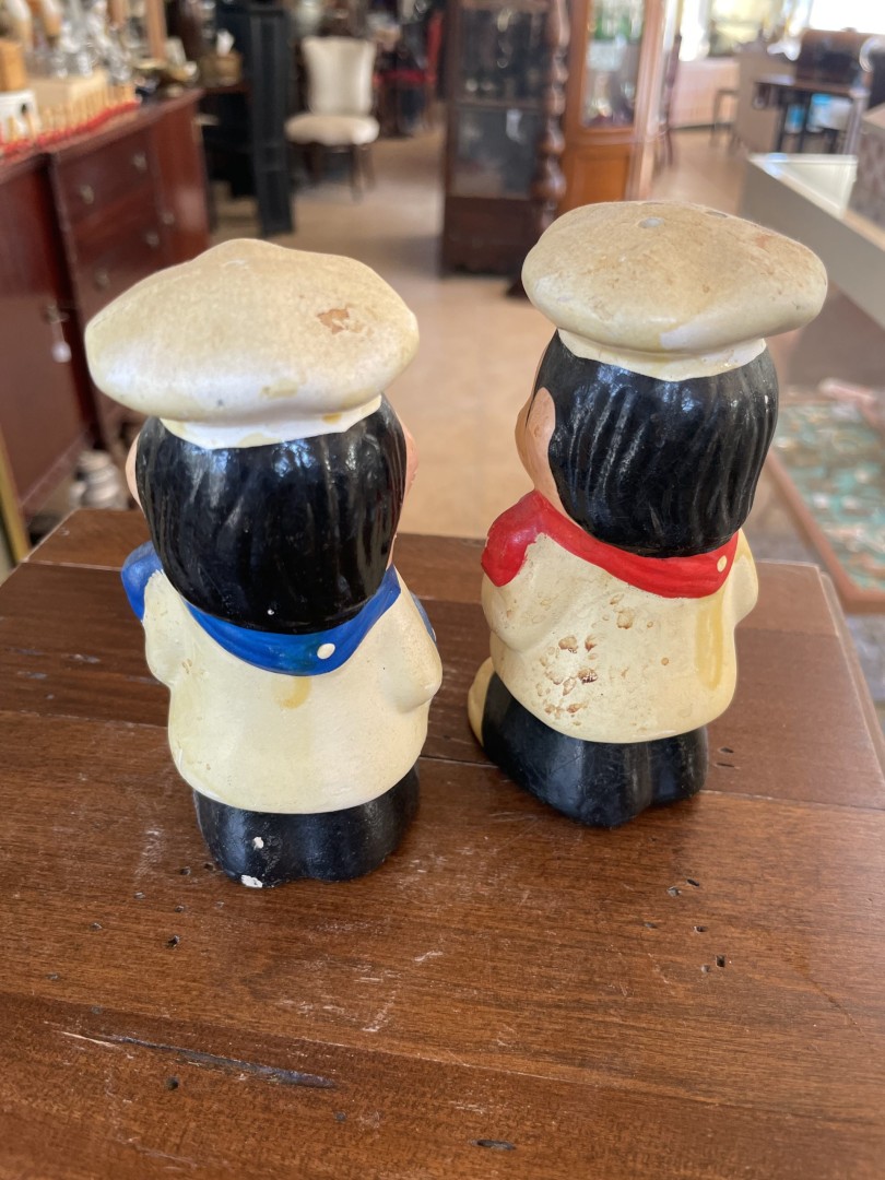 Add a touch of nostalgic charm to your kitchen with this delightful pair of vintage 1970s chef salt and pepper shakers. These ceramic shakers feature a whimsical design of two cheerful chefs, each dressed in traditional chef attire with vibrant blue and red accents. Add a touch of nostalgic charm to your kitchen with this delightful pair of vintage 1970s chef salt and pepper shakers. These ceramic shakers feature a whimsical design of two cheerful chefs, each dressed in traditional chef attire with vibrant blue and red accents. Marked with “P” and “S” for easy identification, these shakers are not only functional but also serve as a fun decorative piece for your dining table or display cabinet. Perfect for collectors of vintage kitchenware, these shakers capture the playful spirit of mid-century kitchen décor.