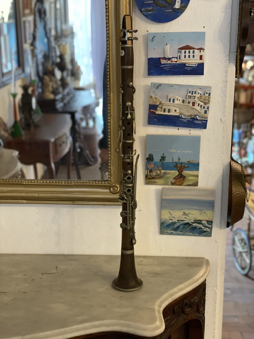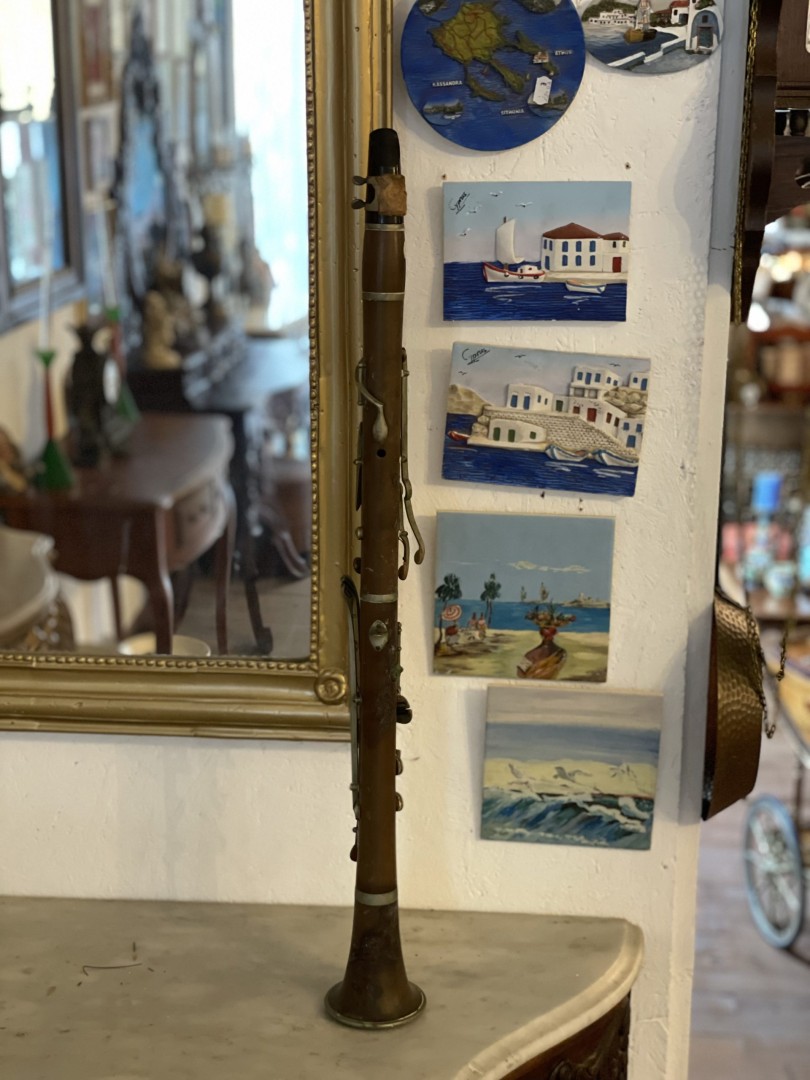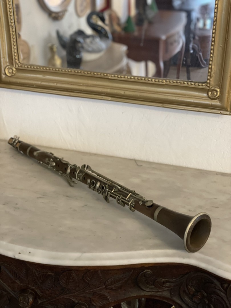 Beautiful vintage clarinet with wooden finish and silver-tone keys. A perfect addition to any music lover’s collection or vintage décor. \n \nSpecial Aspect: \n \nIts wooden finish and delicate silver-tone keys reflect exceptional craftsmanship, offering both visual and historical value. This vintage clarinet showcases a timeless design with its wooden finish and intricate silver-tone keys. While the exact era is unknown, its craftsmanship and classic appearance suggest it may belong to the mid-20th century. The clarinet features a compact and lightweight design, making it an excellent decorative item or collectible for music enthusiasts. \n \nIts rich patina and elegant structure make it a standout piece for both display and functional use. Whether you’re a musician or an admirer of vintage instruments, this clarinet adds sophistication and charm to any collection. \n \nStorytelling: \n \nImagine the music this vintage clarinet once brought to life. From intimate performances to grand orchestras, it carries stories of melodies played and moments shared. Now, it waits to find a new home to continue its journey as a cherished piece of history.