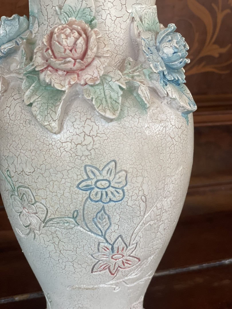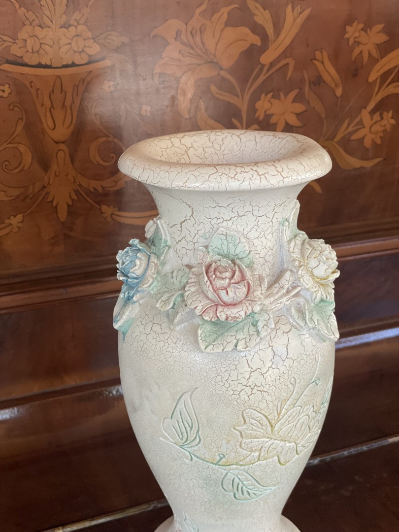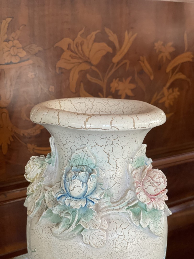 A 1950s vintage ceramic vase with crackle glaze and detailed floral reliefs in pastel tones. Ideal for romantic and country-style interiors. \n \nSpecial Aspect: \n \nThe vase features 3D hand-applied flower garlands that retain their original pastel color tones—rare for its age and condition. This stunning vintage ceramic vase, estimated from the 1950s, features a beautifully aged crackle glaze finish with an elegant pastel color palette. Around its neck, meticulously sculpted 3D floral reliefs in shades of pink, blue, yellow, and green bring the piece to life, while engraved flower motifs along the body add a delicate touch. Its soft patina and timeless design make it an ideal centerpiece for shabby chic, French country, or romantic vintage interiors. \n \nThis vase isn’t just decorative—it tells a story. Imagine it resting on a grandmother’s lace-covered table, filled with garden roses from a bygone era. It brings with it the warmth of a home once filled with love, tradition, and handmade beauty.