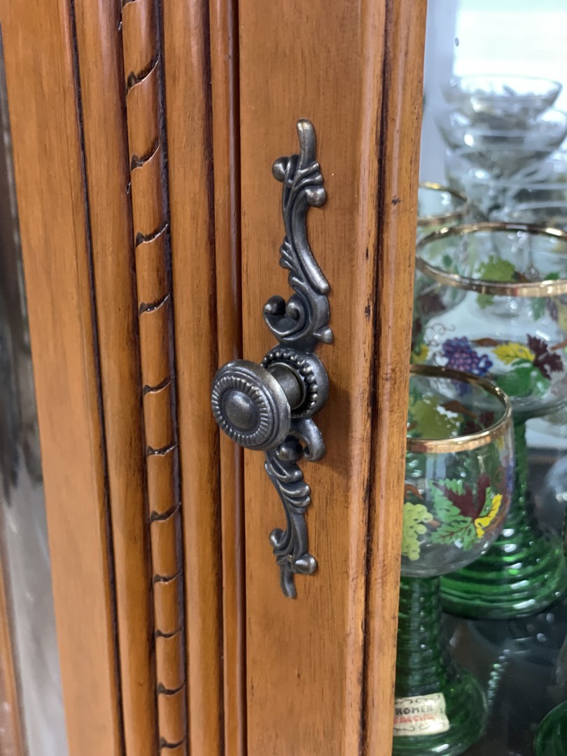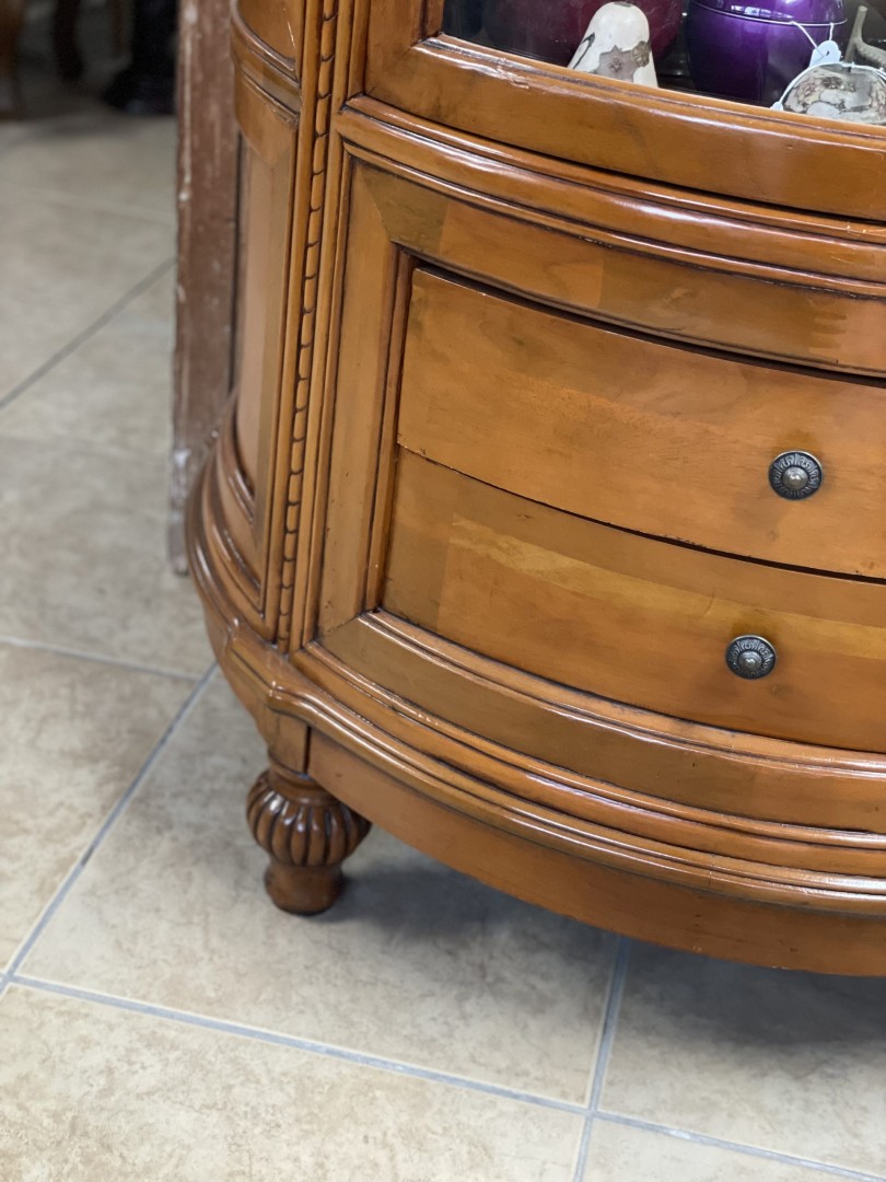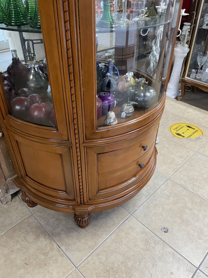 Enhance your living space with this exquisite antique curved glass display cabinet. Crafted from high-quality wood, this elegant showcase features a beautifully curved front with glass panels that allow for a clear view of your prized collectibles. Enhance your living space with this exquisite antique curved glass display cabinet. Crafted from high-quality wood, this elegant showcase features a beautifully curved front with glass panels that allow for a clear view of your prized collectibles. The cabinet includes two spacious drawers at the bottom, providing additional storage for smaller items. \n \nThis piece is perfect for displaying a variety of items, from vintage glassware and porcelain figurines to cherished mementos. Its classic design and rich wood finish make it a standout addition to any room, adding a touch of sophistication and charm.