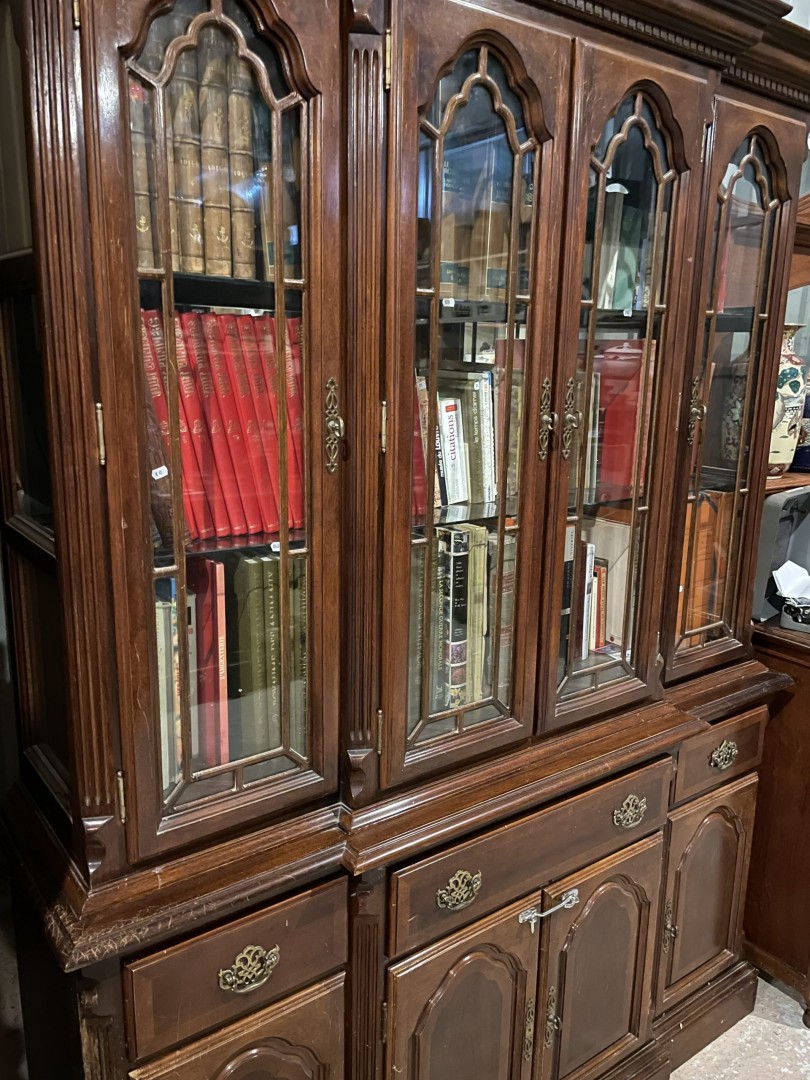 This vintage Gothic Revival glass-fronted bookcase cabinet boasts beautifully arched glass panels, intricate brass handles, and a timeless, elegant design. A perfect blend of function and style, it serves as both a display case and storage unit, ideal for books, collectibles, or fine china. \n \nSpecial Aspect: \n \nIts ornate Gothic-inspired glass doors create a striking architectural effect, making it a centerpiece in any space. A stunning vintage Gothic Revival bookcase cabinet with intricate glass doors, brass handles, and rich dark wood. This vintage display cabinet is perfect for book lovers, collectors, and antique enthusiasts. A statement piece that brings history, charm, and sophistication into any home. \n \nStorytelling: \n \nImagine this majestic bookcase standing in a grand study, filled with timeless literature and secrets of the past. Each glass-paneled door reflects decades of knowledge, while the ornate brass handles whisper of an era when craftsmanship mattered. Now, this piece awaits its next chapter-perhaps in your home, where it will house your most treasured books and heirlooms.