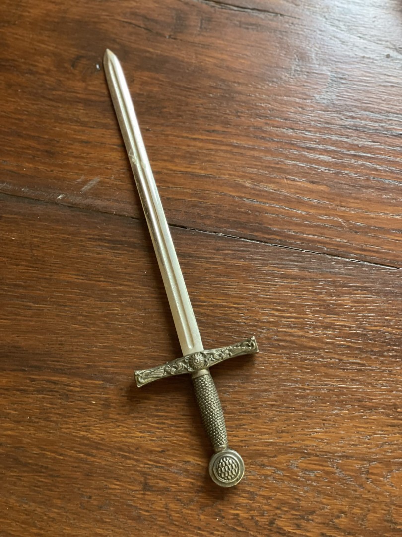 Miniature vintage Excalibur sword letter opener with ornate detail and medieval flair—perfect for desks, collectors, or fantasy fans. \n \n🌟 Special Aspect: \n \nIts knightly embossed crossguard and textured grip give it the feel of a scaled-down legendary weapon. \n \n🕰️ Estimated Era: \n \nLikely mid to late 20th century (circa 1960s–1980s) This vintage Excalibur letter opener captures the magic of medieval legend in a compact, functional design. Crafted in solid metal, it features a detailed crossguard with knightly motifs, a textured handle, and a finely shaped blade. The finish gives it a noble aged look, making it a striking collectible. \n \nInspired by the legendary sword of King Arthur, this piece adds a bold touch to any desk or study. Whether you’re slicing open envelopes or decorating a shelf, it brings a sense of heroic history to your daily routine. It’s also a perfect gift for fantasy lovers, sword collectors, or anyone who appreciates medieval-style craftsmanship. \n \n🕰️ Estimated Era: \n \nLikely mid to late 20th century (circa 1960s–1980s) \n \n💬 Storytelling: \n \nHolding this miniature sword feels like stepping into a storybook. Imagine letters arriving by horse and messenger, opened by a noble’s blade. This piece connects everyday tasks with a timeless sense of legend and adventure. It’s not just a tool—it’s a tribute to courage, imagination, and old-world charm.