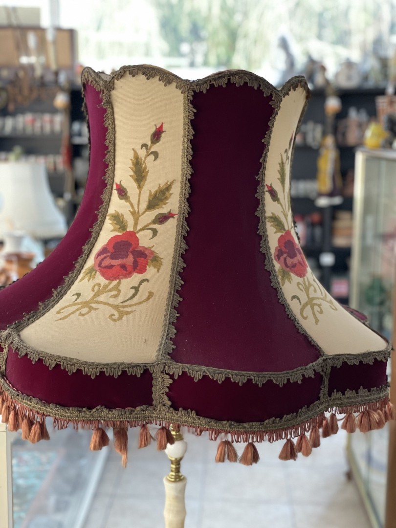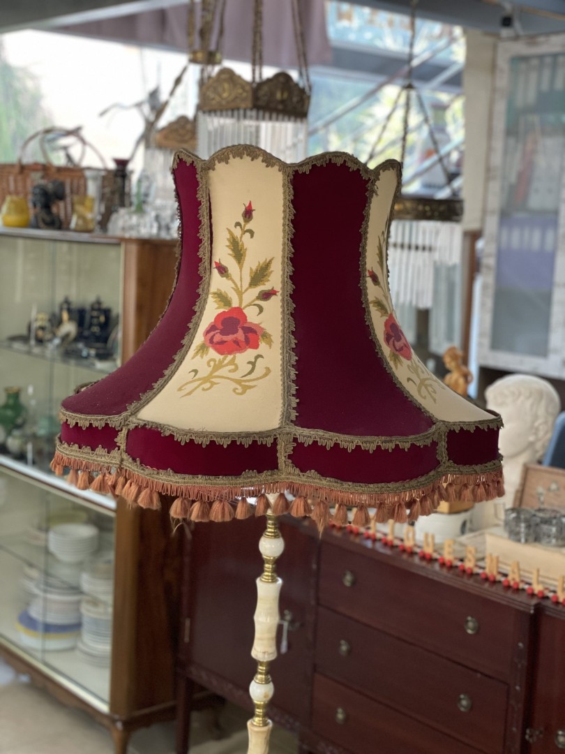 Discover this exquisite vintage floor lamp c.1970 featuring a handmade lampshade adorned with intricate floral decor. The lamp stands on a luxurious onyx base, adding a touch of elegance and sophistication to any room. Discover this exquisite vintage floor lamp c.1970 featuring a handmade lampshade adorned with intricate floral decor. The lamp stands on a luxurious onyx base, adding a touch of elegance and sophistication to any room. Perfect for antique enthusiasts and those looking to add a unique piece to their home decor.