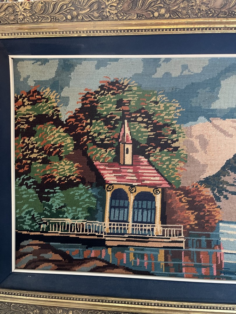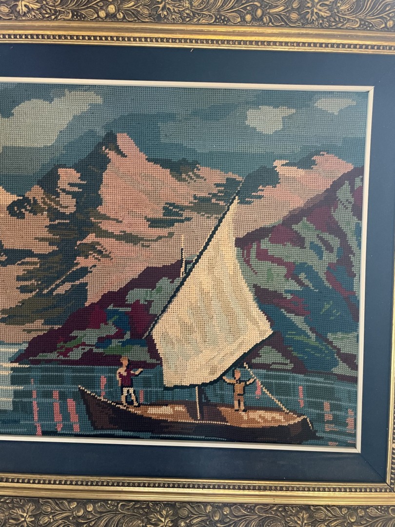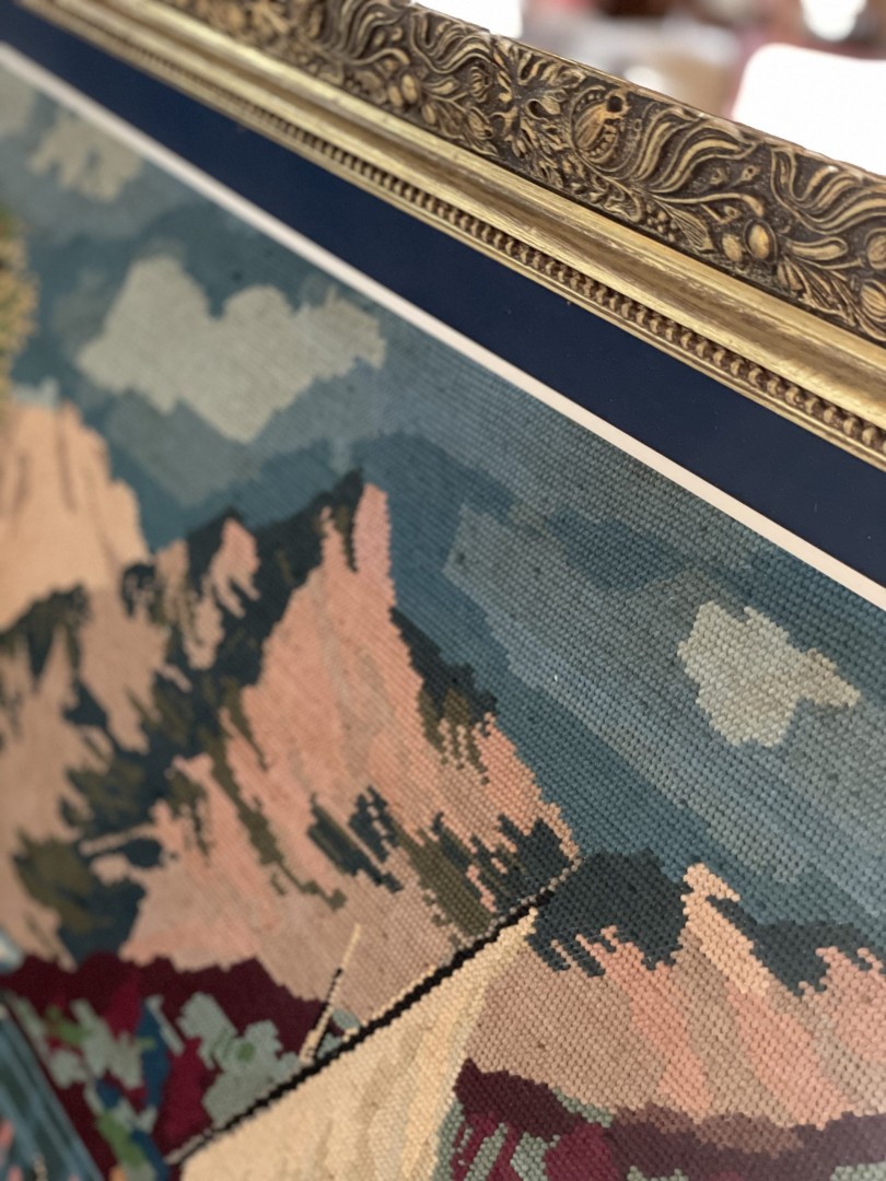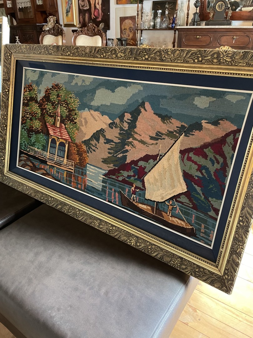 Large mid-century needlepoint tapestry of a lake scene with chapel, mountains, and sailboat, in ornate gold frame. \n \nSpecial Aspect: \n \nEntirely hand-stitched with vibrant color-blocking, framed in a richly carved gilded wooden frame that elevates its presentation. This stunning vintage needlepoint tapestry, framed in an ornate gilt wooden frame, captures a peaceful lakeside scene with alpine mountains, a small chapel, and a sailboat with two figures. The rich colors and hand-stitched detail reflect the artistry and patience of traditional needlecraft. Likely crafted between the 1950s and 1970s, this large horizontal piece brings warmth, texture, and old-world charm to any interior. A striking decorative statement for living rooms, hallways, or hospitality spaces, it evokes the serene spirit of a bygone European countryside. \n \nEstimate Era: \n \nMid 20th century (circa 1950s–1970s) \n \n Storytelling: \n \nEvery thread in this tapestry tells a story of quiet craftsmanship—of someone patiently stitching a peaceful world into being. The gentle sail gliding across calm waters, the church nestled in autumn foliage, and the grandeur of the mountains invite you to slow down, breathe, and remember the beauty of simplicity.
