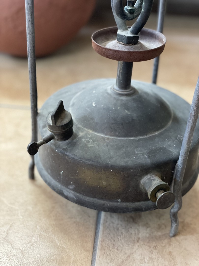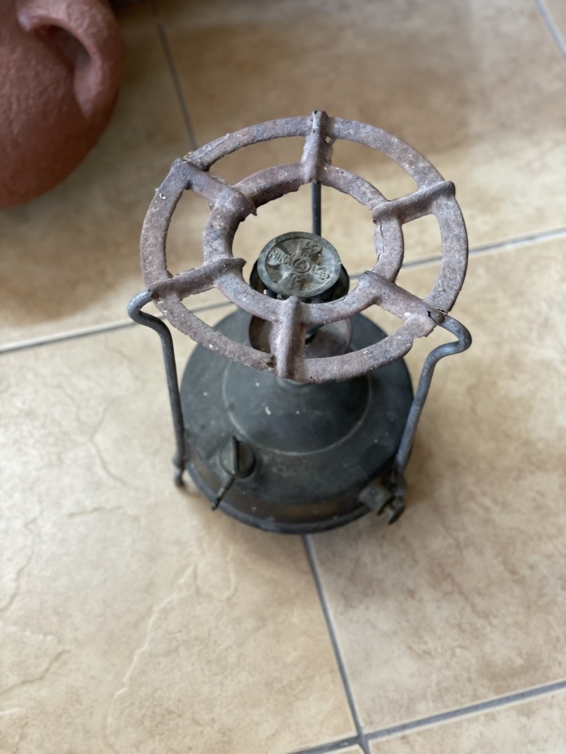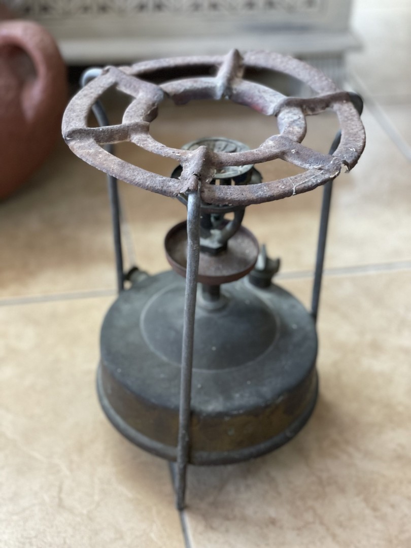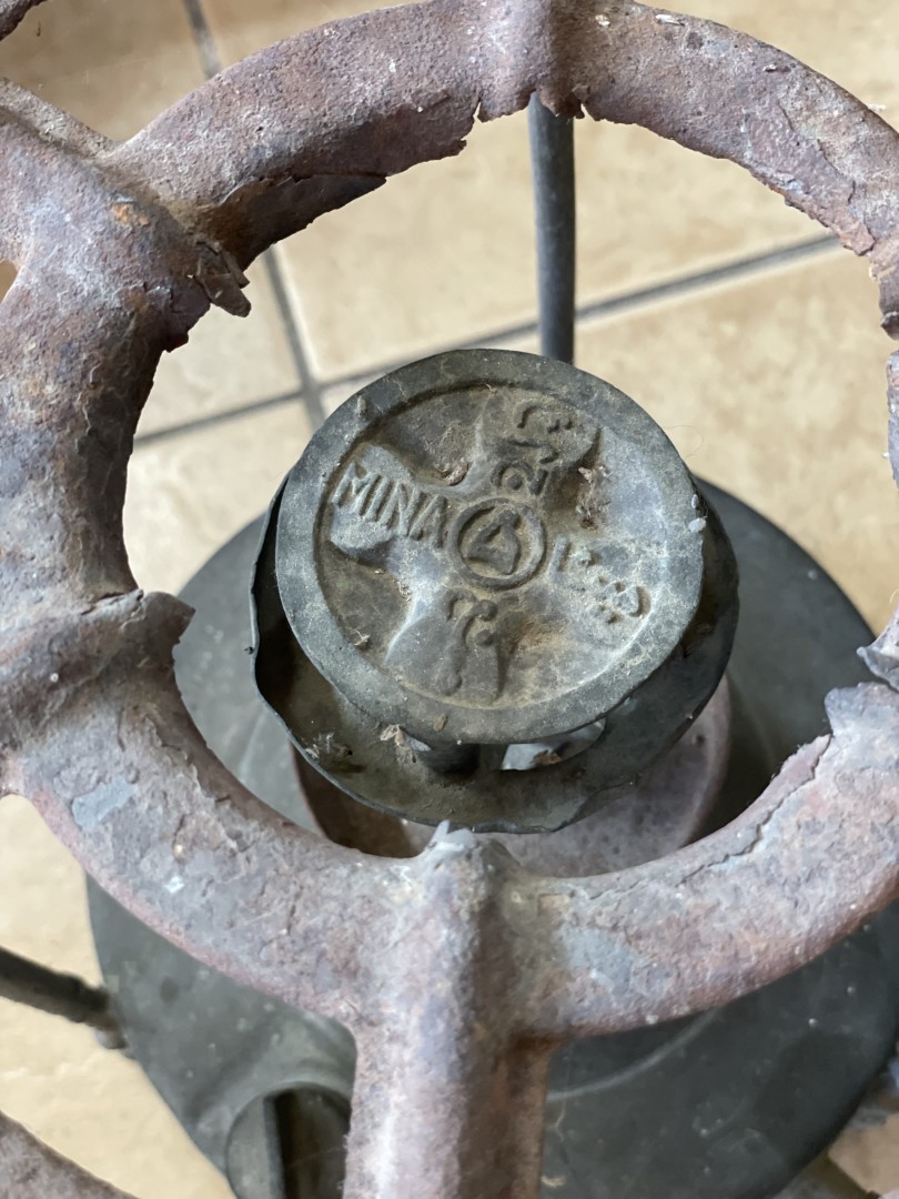 Greek-made MINA kerosene stove from the 1950s. Solid, collectible, and full of rustic charm—perfect for display or light restoration. \n \n💡 Special Aspect: \n \nThe embossed MINA logo on the burner cap adds rare authenticity and historical value. \n \n🕰️ Estimated Era: \n \nCirca 1950–1960 This vintage kerosene stove by MINA is a solid and collectible piece from the 1950s–60s. It was made in Greece and used for cooking in homes, workshops, and camps. Its strong metal structure and original burner cap with the MINA logo offer charm and authenticity. \n \nThe cast iron burner head sits on a raised post and distributes heat evenly. The round base is a fuel tank with two control valves—one for filling and one for adjusting pressure. Three curved metal rods support the burner, giving the stove a stable and practical design. \n \nCollectors value this piece for its simple mechanics and durability. You can display it in a rustic kitchen, restore it for light use, or keep it as a nostalgic artifact. Although it has age-related wear, its parts remain intact—showcasing how things were built to last. \n \n🕰️ Estimated Era: \n \n1950s–1960s \n \n💬 Storytelling: \n \nPicture a small village kitchen where this stove once cooked warm soups and handmade bread. A mother stirred a pot while children waited nearby. This stove tells stories of family meals, simple living, and the beauty of handmade tools. It brings warmth not only through fire—but through memories. \n \n👉🏼Explore more Folk art options