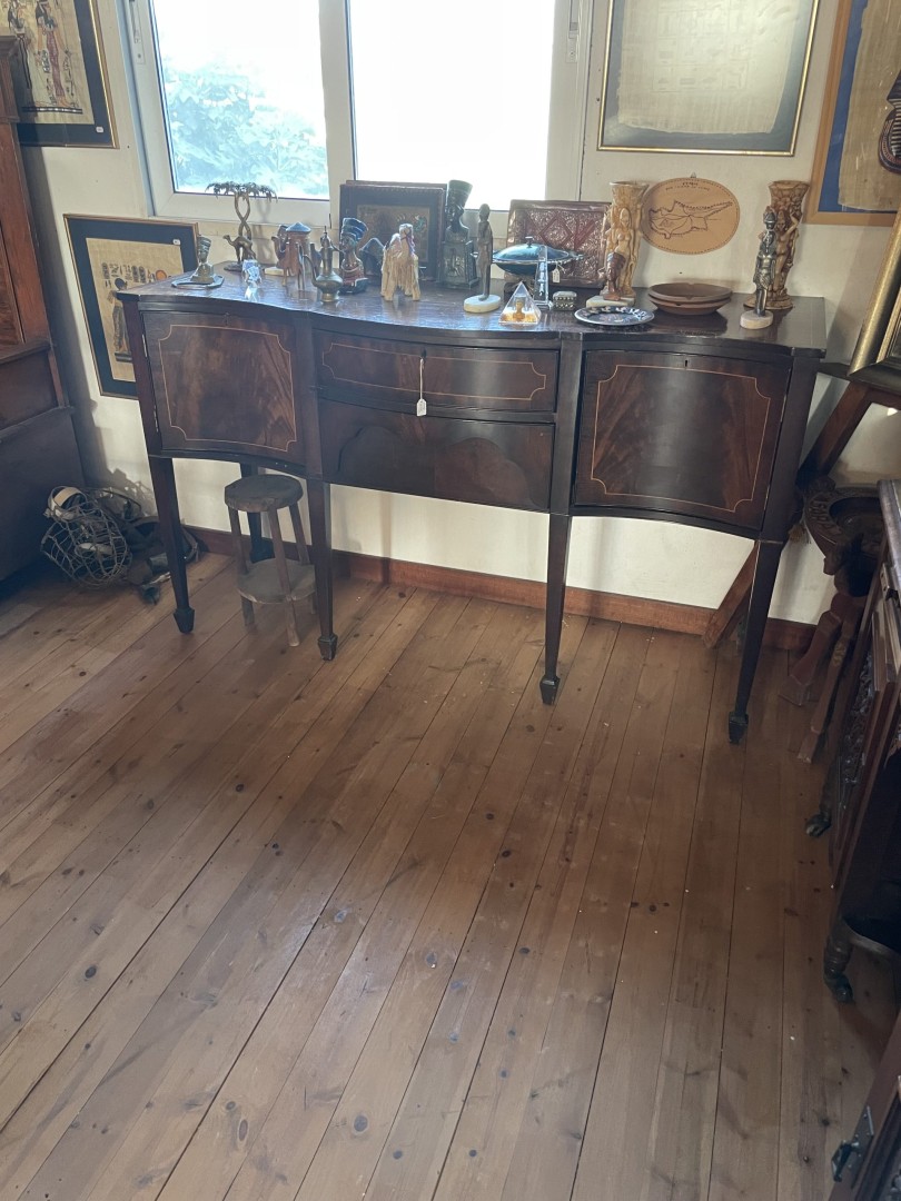 This exquisite vintage sideboard is a testament to the fine craftsmanship of yesteryear. The piece, made from rich mahogany wood, showcases stunning inlaid patterns on the doors and drawers, highlighting its elegant design. This exquisite vintage sideboard is a testament to the fine craftsmanship of yesteryear. The piece, made from rich mahogany wood, showcases stunning inlaid patterns on the doors and drawers, highlighting its elegant design. Elevated on slender, tapered legs with beautifully carved feet, this sideboard exudes both sophistication and functionality, making it a perfect addition to any antique or vintage-inspired home decor.