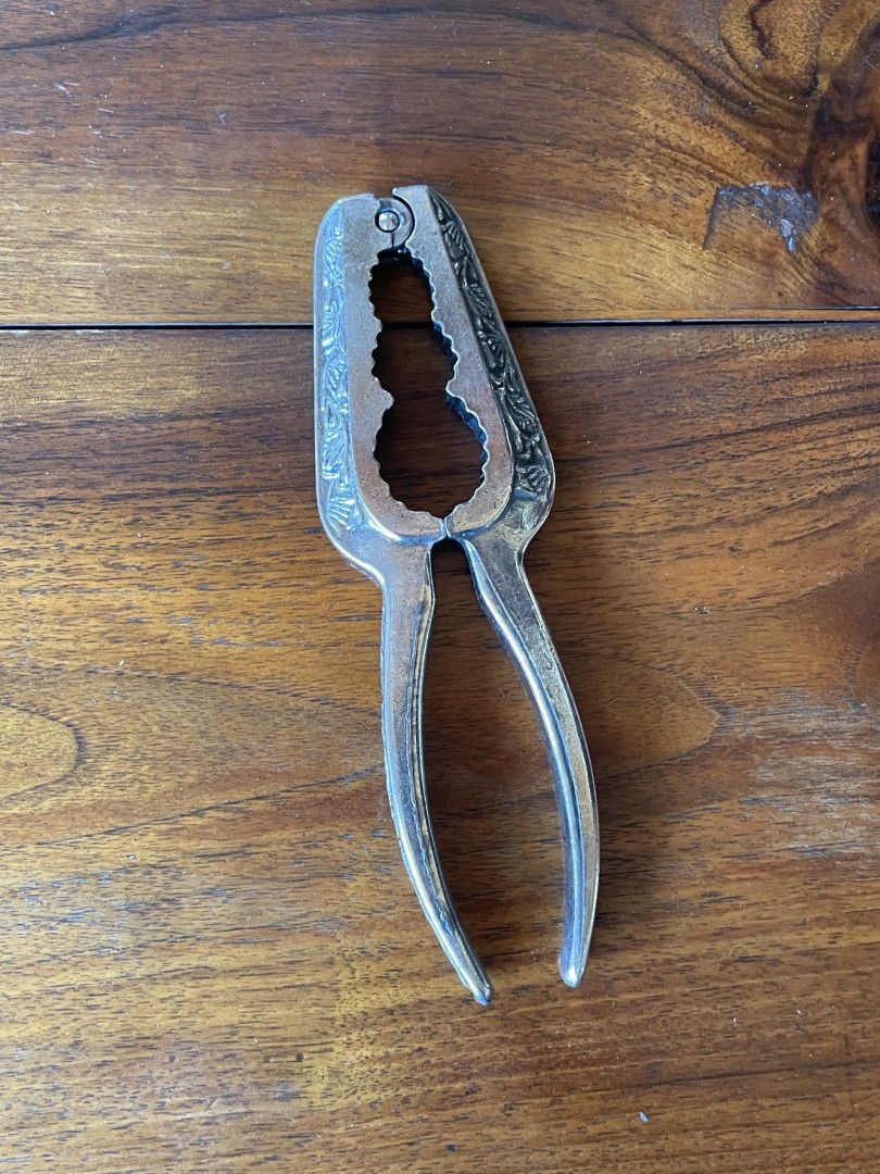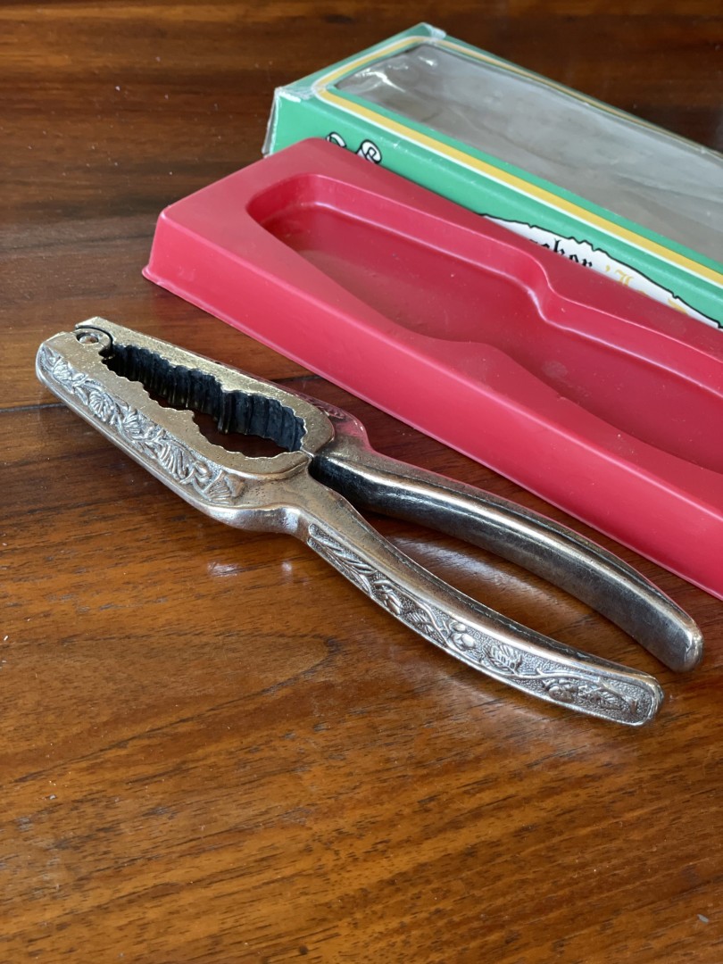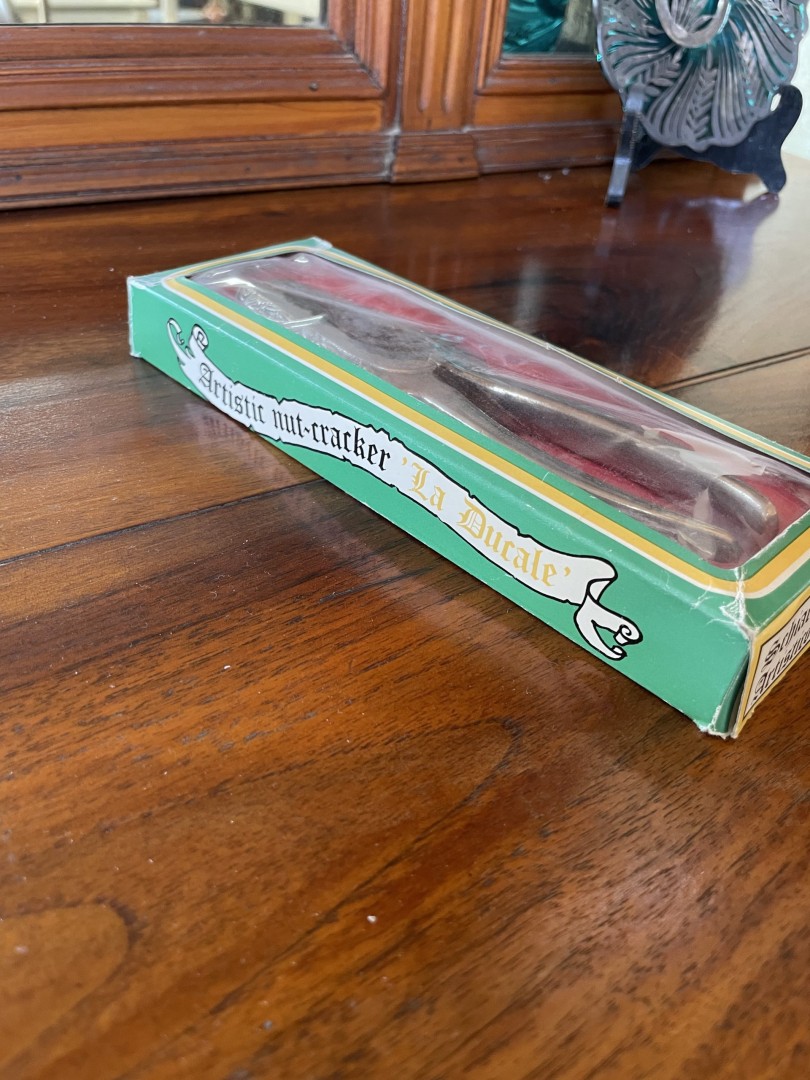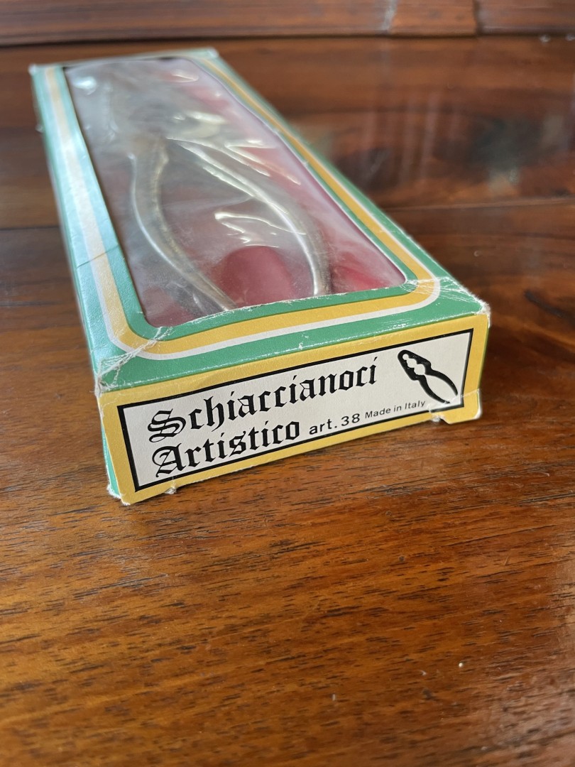 Vintage Italian nutcracker “La Ducale” with ornate floral engravings. In original box, both decorative and functional. \n \n🌟 Special Aspect: \n \nOriginal box and red molded display tray included – rare to find complete and unused. \n \n🕰️ Bra: 1970s–1980s This vintage Italian nutcracker from the “La Ducale” line is a rare blend of functionality and ornamental design. Made in Italy during the 1970s–1980s, this metal nutcracker features detailed floral engravings and comes in its original green box with a molded red tray. Designed for both everyday use and elegant presentation, it’s ideal for cracking walnuts, hazelnuts, and almonds with ease. \n \nUnlike modern plastic tools, this vintage Italian nutcracker is built from heavy-duty metal that ensures a solid grip and effortless cracking. The artistic craftsmanship shows in the engraved floral details, making it a stunning addition to any traditional or rustic kitchen decor. Whether you’re preparing festive treats or looking for a display piece that tells a story, this nutcracker makes an impression. \n \nPerfect for collectors and lovers of Italian kitchenware, the “La Ducale” nutcracker is more than just a utensil—it’s a conversation piece. It brings a nostalgic charm to seasonal celebrations and family gatherings. Kept in great condition with its original packaging, it also makes a thoughtful gift for those who appreciate vintage style and European design. Add this vintage Italian nutcracker to your kitchen, and enjoy a timeless touch of Italy in your everyday rituals. \n \n🕰️ Era: 1970s–1980s \n \nLearn more about traditional serving kitchen tools.