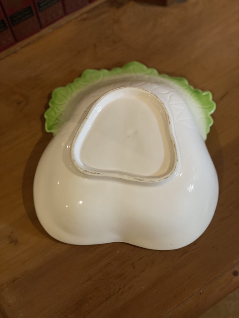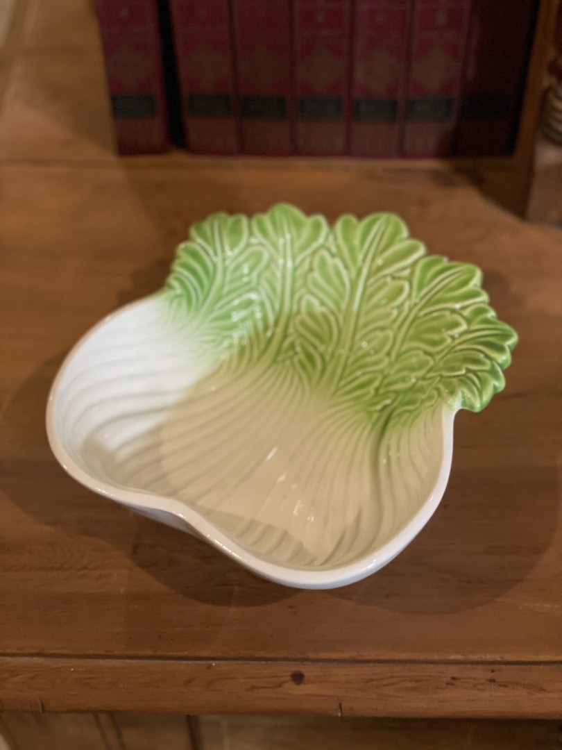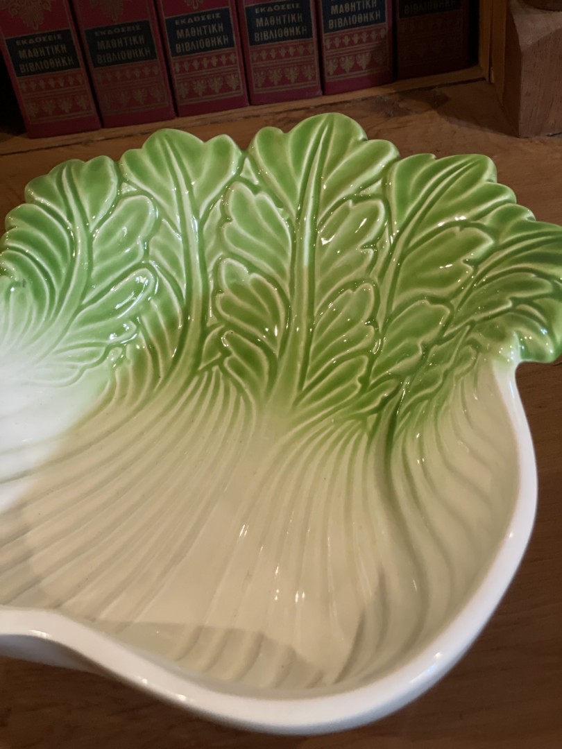 A rare mid-century hand-painted Majolica lettuce leaf dish, blending vibrant green and creamy white tones. Perfect as a functional serving dish or a decorative collectible. \n \nSpecial Aspect: \n \nThe lifelike detailing of the lettuce leaf design, paired with the hand-painted glaze, ensures every piece is uniquely charming. This stunning vintage Majolica lettuce leaf dish embodies the timeless beauty of hand-painted ceramics. The vibrant green glaze delicately transitions into a creamy white base, mimicking the organic texture of lettuce leaves. Crafted in the mid-20th century, this piece reflects the charm of vintage European artistry. Its unique design and impeccable craftsmanship make it both a functional serving dish and a collectible decor item. The bottom shows a smooth, unglazed surface, highlighting its authenticity. \n \nStorytelling: \n \nImagine serving fresh fruits or salads in this exquisite dish, elevating your dining experience. It’s not just a plate-its a journey to the mid-century era, where beauty and functionality intertwined. Owning this piece connects you to a simpler, artistic time when every object told a story.