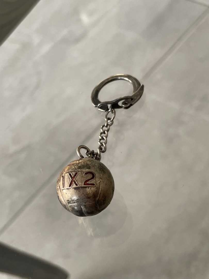 Vintage metal football keychain with “1X2” marking, symbolizing classic football betting. A nostalgic collectible for sports and football enthusiasts, likely from the 1980s. \n \nSpecial Aspect: \n \nDistinctive “1X2” marking, reflecting traditional football betting culture, perfect for sports memorabilia collectors. This vintage metal keychain, designed as a miniature football with the “1X2” marking, recalls the excitement and nostalgia of classic football betting. The 1X2 notation, commonly associated with traditional betting systems, adds a unique and historical charm to this piece. Likely dating from the 1980s or earlier, this keychain captures the thrill of sports and gaming, making it an ideal collectible for football fans and vintage memorabilia enthusiasts. Its compact design and durable metal make it a perfect keepsake that carries a piece of sports history. \n \nStorytelling: \n \nHold a piece of the past with this vintage football keychain. Every time you reach for your keys, feel the rush of anticipation as if you were at the game, predicting the outcome with the classic 1X2 bet. This small yet iconic keychain is a reminder of the passion, spirit, and suspense that football brings, making it a cherished item for any sports lover.