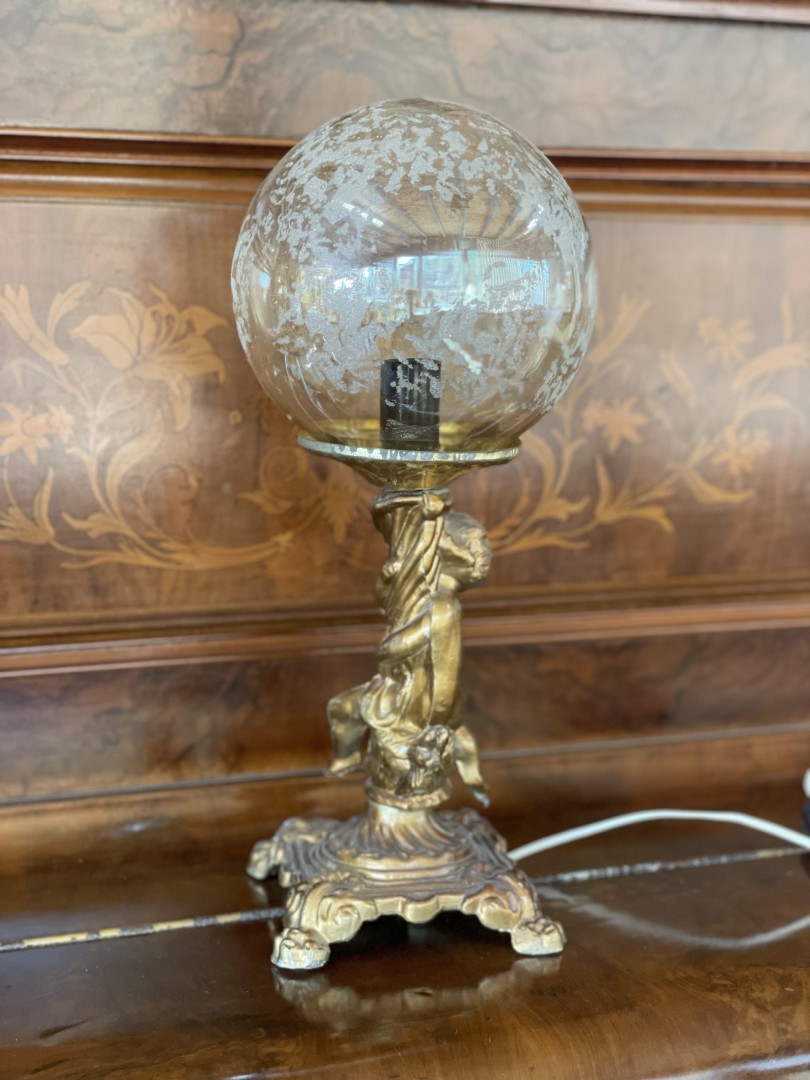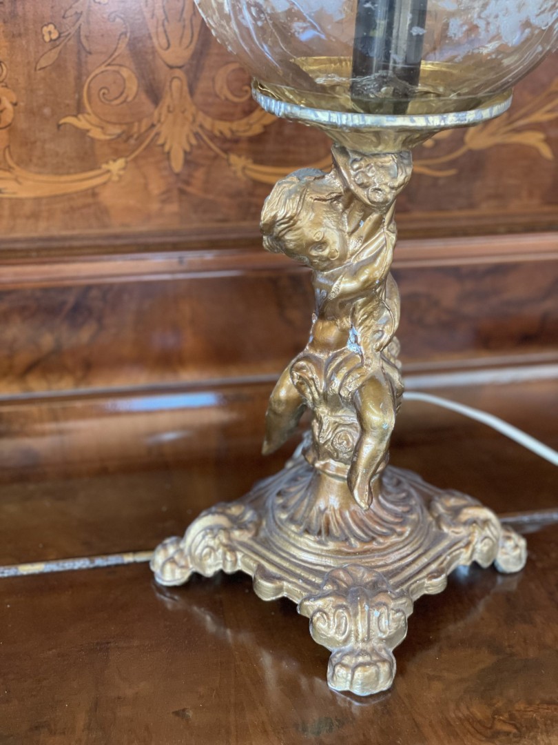Discover the charm of this exquisite vintage table lamp from the second half of the 20th century. This elegant piece features a detailed brass base showcasing a cherub design, perfectly complemented by a frosted glass globe. Discover the charm of this exquisite vintage table lamp from the second half of the 20th century. This elegant piece features a detailed brass base showcasing a cherub design, perfectly complemented by a frosted glass globe. Ideal for adding a touch of mid-century elegance to any room, this lamp is both a functional lighting solution and a stunning decorative statement. Perfect for collectors and enthusiasts of vintage decor. Shop now to elevate your home’s ambiance with this unique and timeless table lamp.