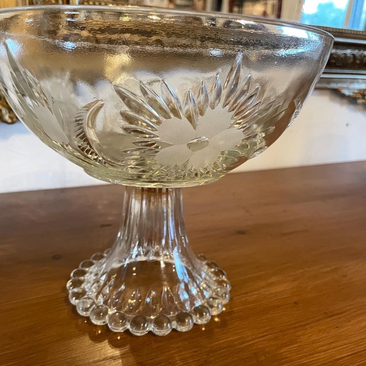 Vintage mid-century fruit bowl featuring intricate floral decor and elegant leg. Crafted with attention to detail, this timeless piece adds a touch of retro charm to any space.
