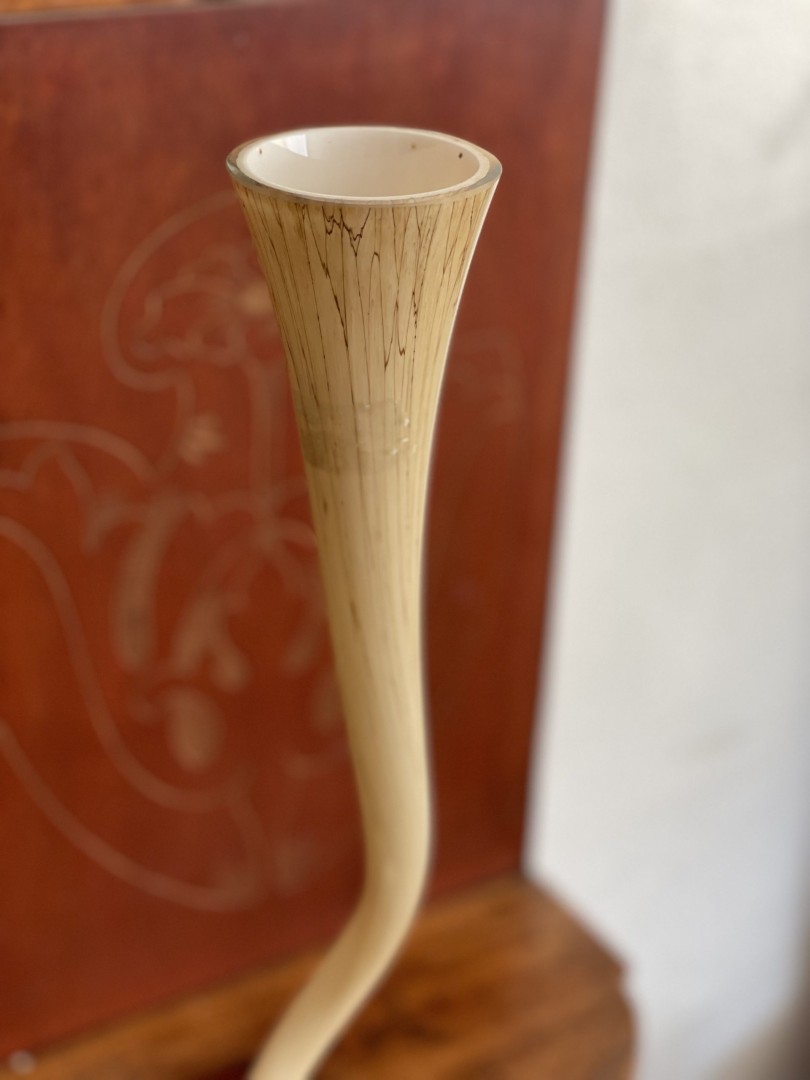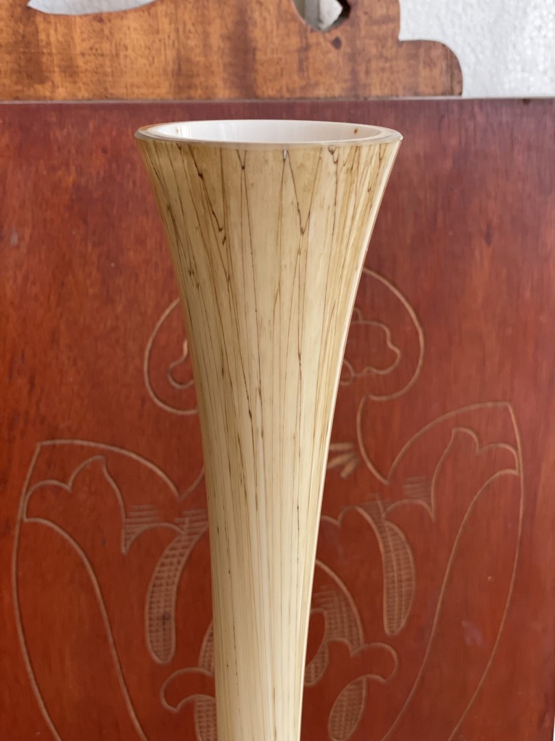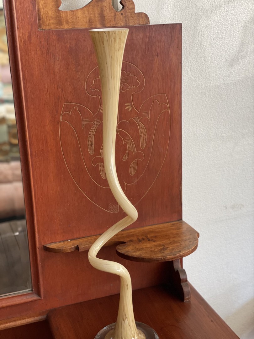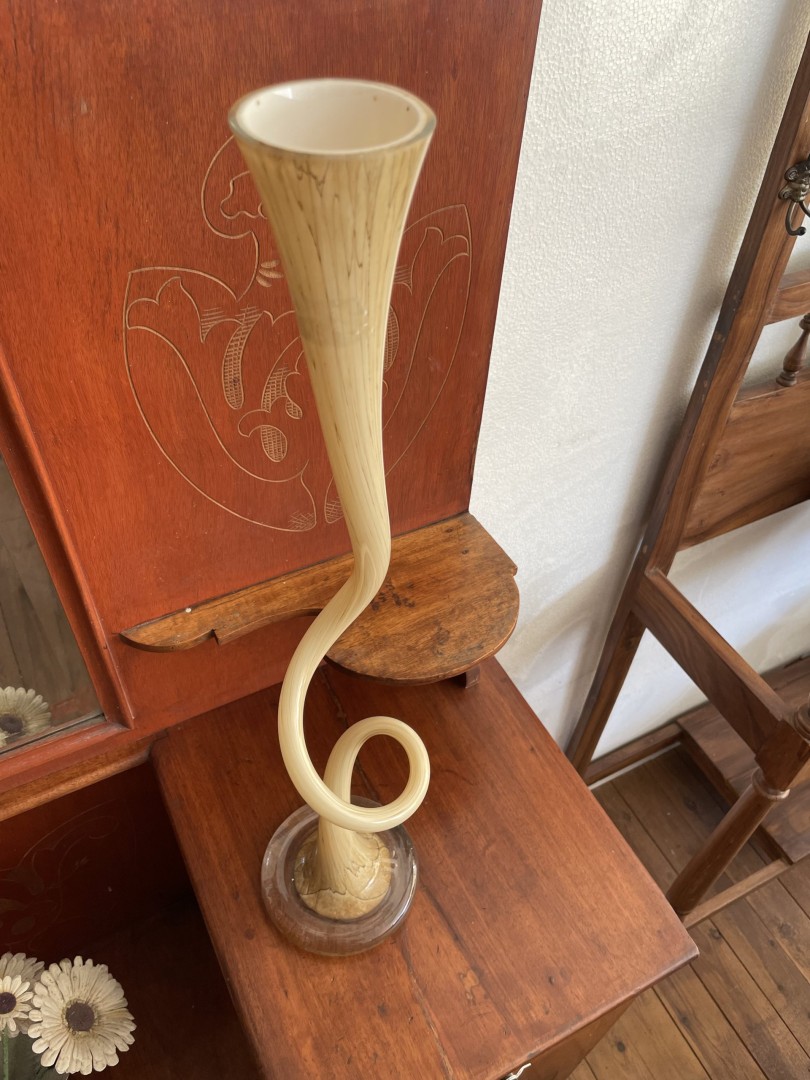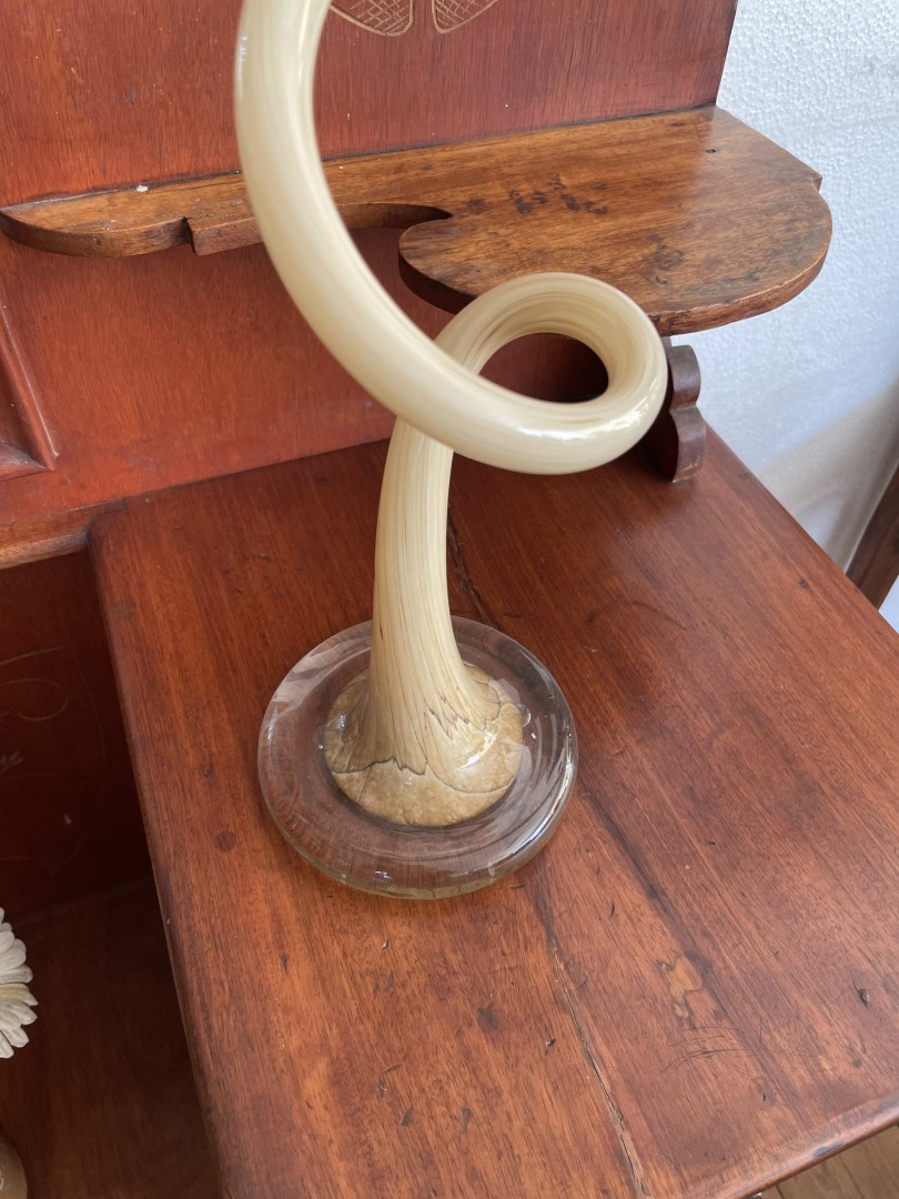 A captivating mid-century art glass vase from the 1960s-70s, featuring a stunning hand-twisted design and warm beige tones. A timeless piece that combines mid-century craftsmanship with sculptural elegance, perfect for collectors and home decor enthusiasts. \n \nSpecial Aspect: \n \nThe flowing, twisted design captures the spirit of mid-century modern artistry, making it an iconic addition to any space. This exquisite mid-century art glass vase showcases a gracefully twisted design with soft, earthy beige tones. Set on a clear glass base, its sculptural elegance makes it a standout piece for any vintage or contemporary decor. A true testament to mid-20th-century craftsmanship, this vase is perfect for collectors or anyone seeking a unique, timeless centerpiece. \n \nEra: 1960s-1970s \n \nStorytelling: \n \nPicture this vase in a serene corner of a 1970s home, its flowing curves reflecting the light and inspiring admiration. Crafted with precision and care, its organic design tells a story of an era when artistry met functionality. Now, this piece awaits to bring its sculptural charm and history into your home.