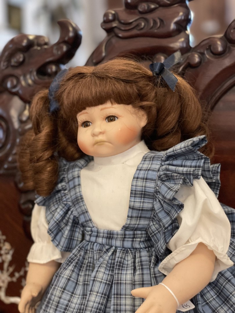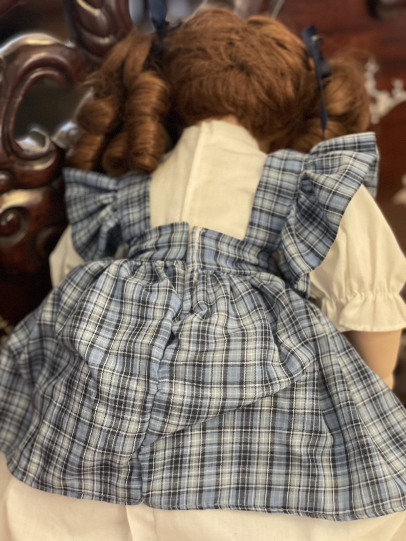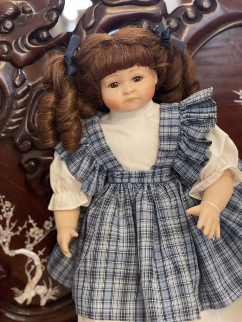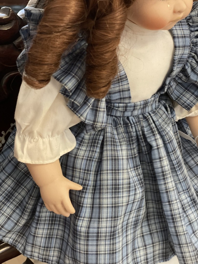 Porcelain doll from the 1980s–1990s with blue plaid dress and hand-painted sad expression. A collector’s dream and a sweet nostalgic touch. \n \n🌟 Special Aspect: \n \nHer unique facial expression adds rare emotional depth and charm—something most dolls don’t offer. \n \n🕰️ Estimated Era: \n \n1980s–1990s This charming porcelain collector’s doll comes from the late 20th century (1980s–1990s) and brings warmth to any vintage collection. Her lifelike expression, hand-painted features, and deep auburn curls make her stand out. The doll has soft glass eyes, rosy cheeks, and a gentle, nostalgic look. \n \nShe wears a beautiful blue plaid pinafore dress, layered over a crisp white blouse with matching bloomers. Navy ribbons tie her curly pigtails, and her little white shoes complete the classic look. Every detail feels handcrafted with care. This doll is perfect for display on shelves, in nurseries, or among collectible pieces. She brings vintage charm to any space. \n \n🕰️ Estimated Era: \n \n1980s–1990s \n \n💬 Storytelling: \n \nShe doesn’t just look vintage—she feels like a memory. You can picture her resting quietly in a childhood room, always present during bedtime stories or quiet moments. Her wistful face reminds us of the magic of innocence and the comfort of home. Bringing her into your space means keeping a small piece of the past close to heart.