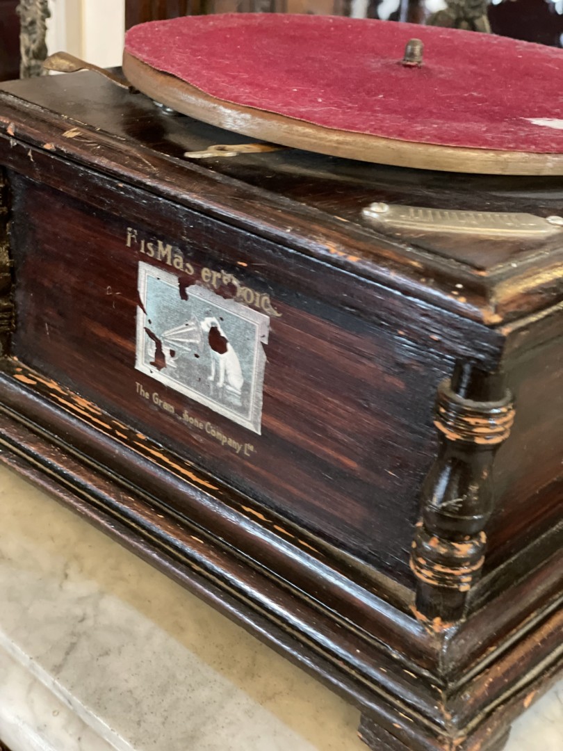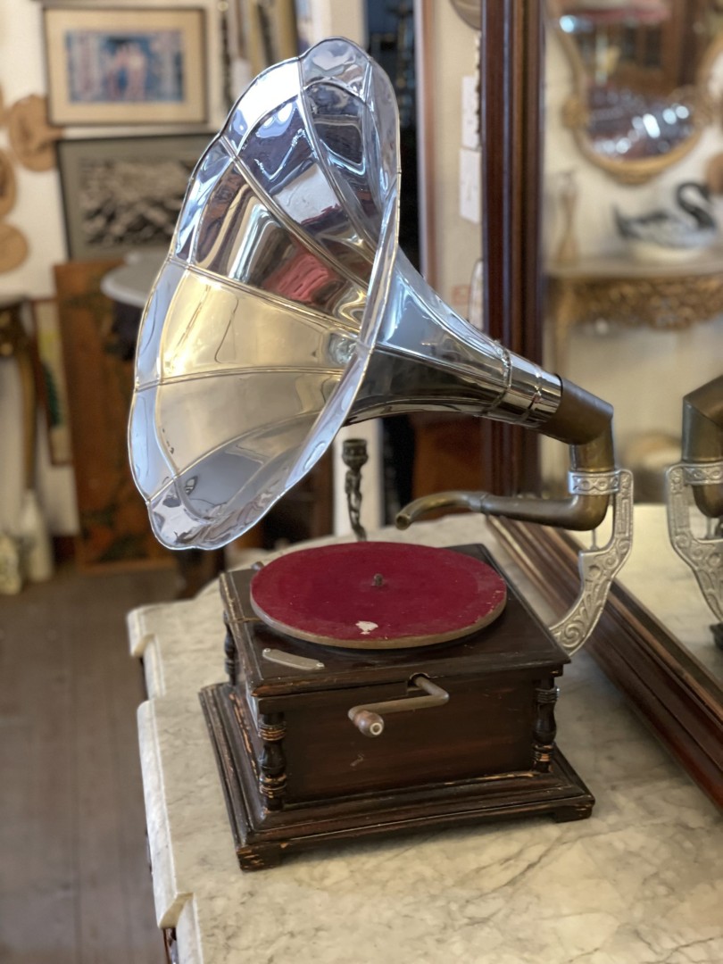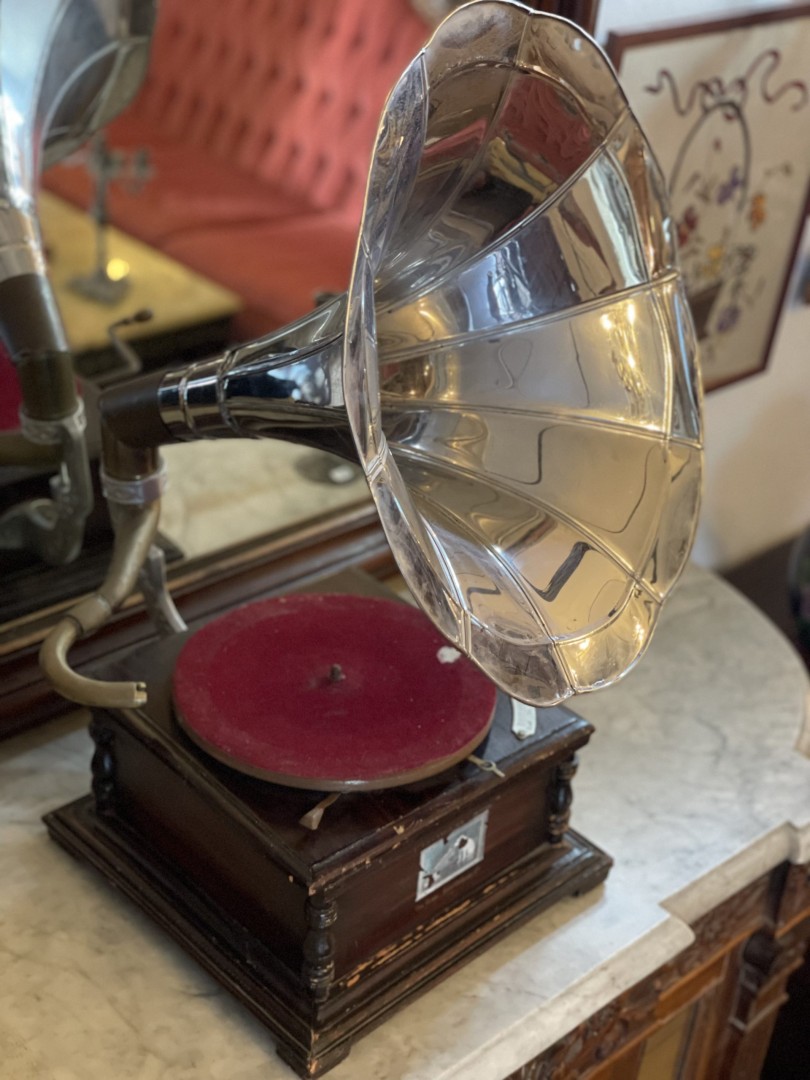 A vintage mid-late 20th century gramophone with a striking chrome horn and rich wooden base. Inspired by classic phonographs, this stunning piece brings nostalgia and elegance to any space. A perfect collectible for vintage lovers and music enthusiasts. \n \nSpecial Aspect: \n \nThe polished chrome horn adds a luxurious and unique touch, making this gramophone stand out as a statement décor piece. Step back in time with this vintage gramophone from the mid-late 20th century, a stunning blend of old-world charm and timeless craftsmanship. Featuring a beautifully polished chrome horn, a rich wooden base with elegant carved details, and a classic red felt turntable, this piece is both an eye-catching display and a functional conversation starter. Inspired by the original designs of early 20th-century gramophones, this model captures the nostalgia of a bygone era while adding a touch of elegance to any space. \n \nThe His Master’s Voice-style emblem on the front further enhances its collectible appeal, making it a perfect addition for vintage enthusiasts, music lovers, or those looking to bring a nostalgic aesthetic into their home, office, or retail space. Whether placed in a study, living room, or antique shop, this gramophone stands as a statement piece of retro luxury. \n \nEra Estimate: Mid to Late 20th Century (c. 1960s-1980s) \n \nStorytelling: \n \nImagine the soft crackle of an old vinyl record spinning, the rich sound filling the room as you sip your evening tea or unwind with friends. This gramophone is more than just a decorative item—it’s a portal to an era when music was felt, not just heard. Each detail, from its handcrafted wooden base to the gleaming chrome horn, evokes a sense of nostalgia and romance. Let it transport you to a time when melodies told stories, and every note was a cherished experience.