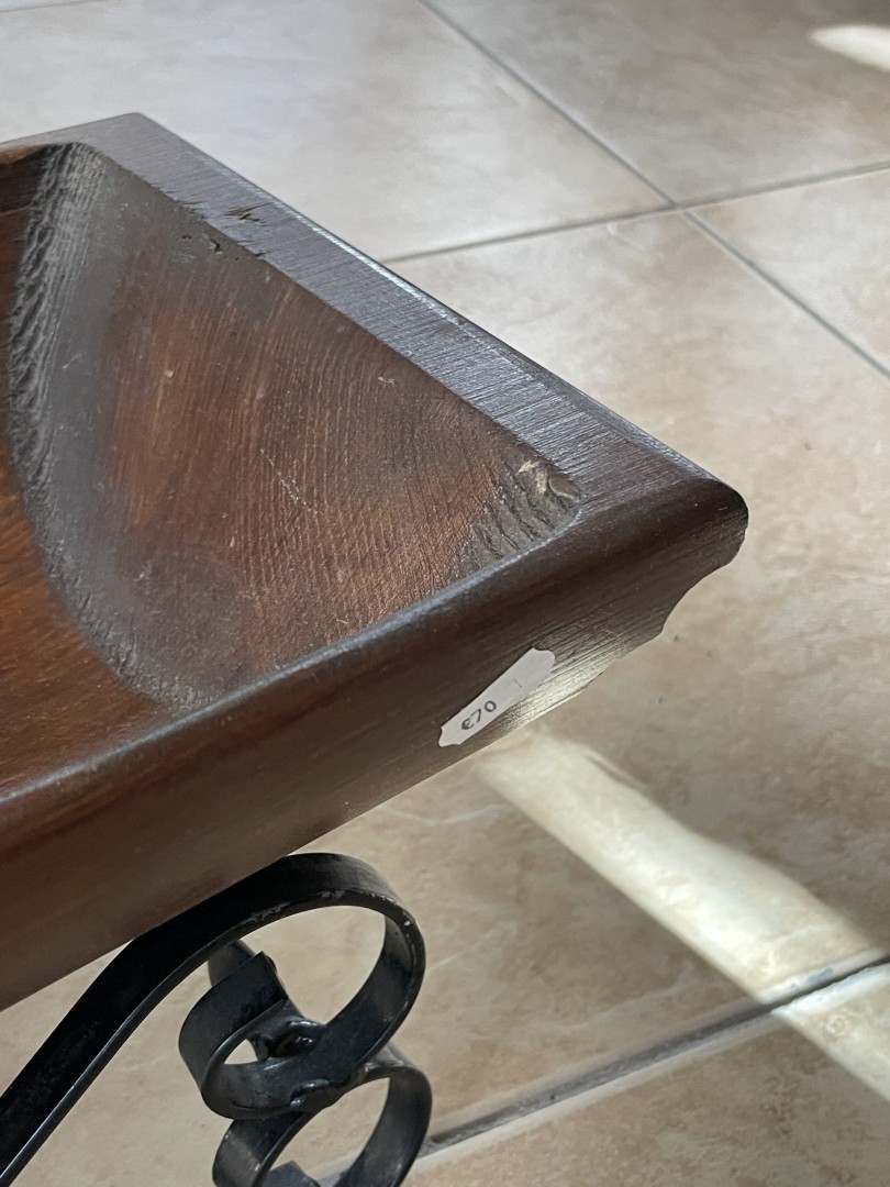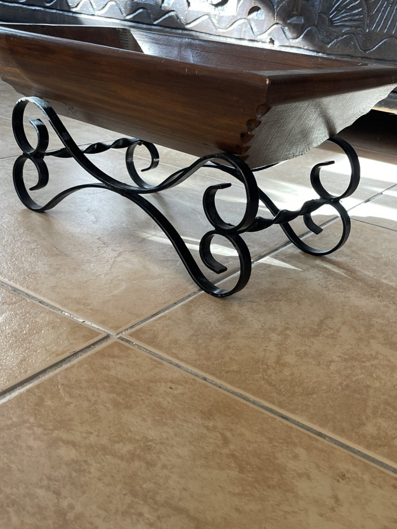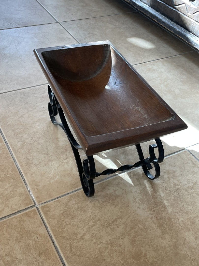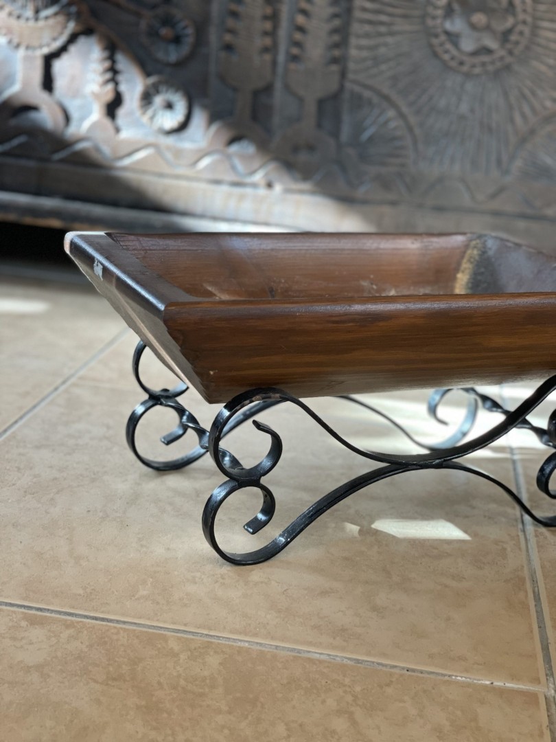 This unique vintage wooden bowl with an elegant wrought iron base combines rustic charm with artistic craftsmanship, perfect as a centerpiece or decorative accent. \n \nSpecial Aspect: \n \nIts sculpted wooden basin paired with hand-bent wrought iron legs creates a harmonious blend of nature and craft — no two pieces are ever identical. Discover the timeless elegance of this mid-20th century handcrafted wooden bowl, beautifully set on a black wrought iron scroll stand. Likely made around the 1960s–1980s, this piece reflects rustic Mediterranean craftsmanship with its smooth carved edges, warm wood tone, and hand-forged iron base. Ideal for displaying dried flowers, fruits, potpourri, or as a statement centerpiece in a traditional or boho-styled home. Its balanced proportions and natural patina give it a distinct character and warmth, making it more than just a decorative object — it’s a piece of living history. \n \nStorytelling: \n \nImagine this bowl sitting in an old Mediterranean home, filled with seasonal fruits, catching the warm light of a sunny morning. It carries stories of shared meals, laughter, and tradition — ready to bring that same heartfelt warmth into your space.