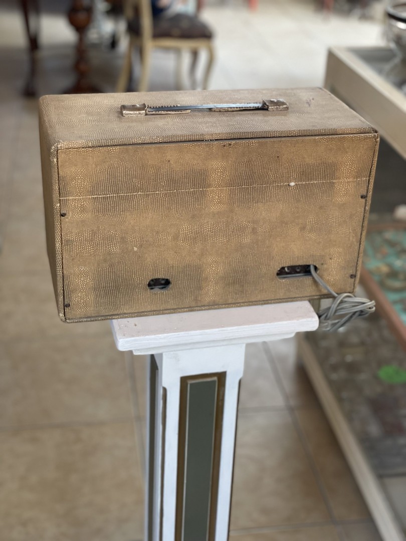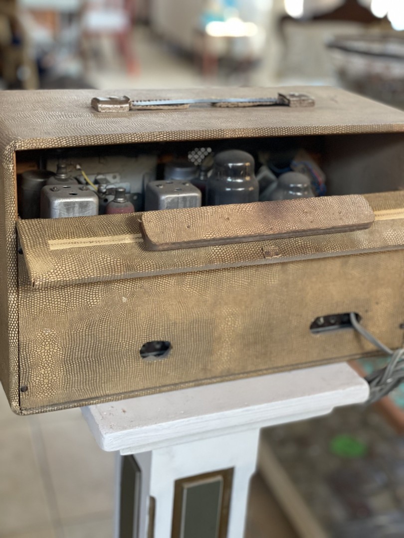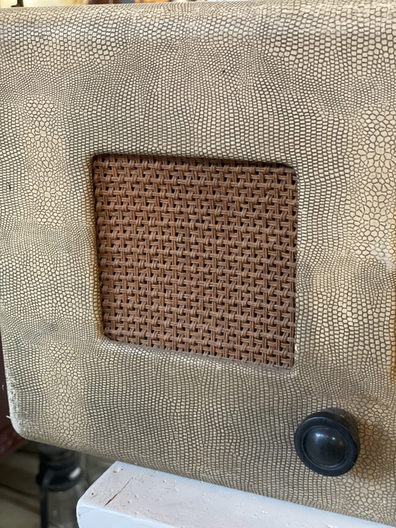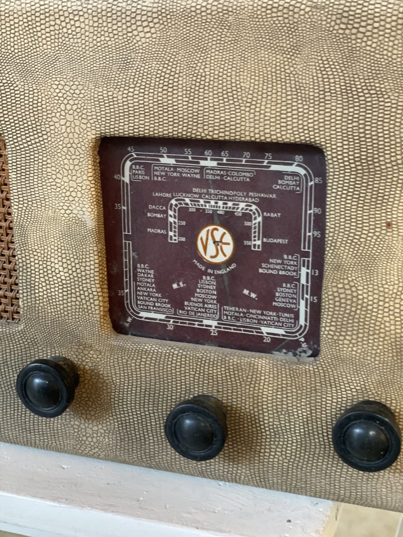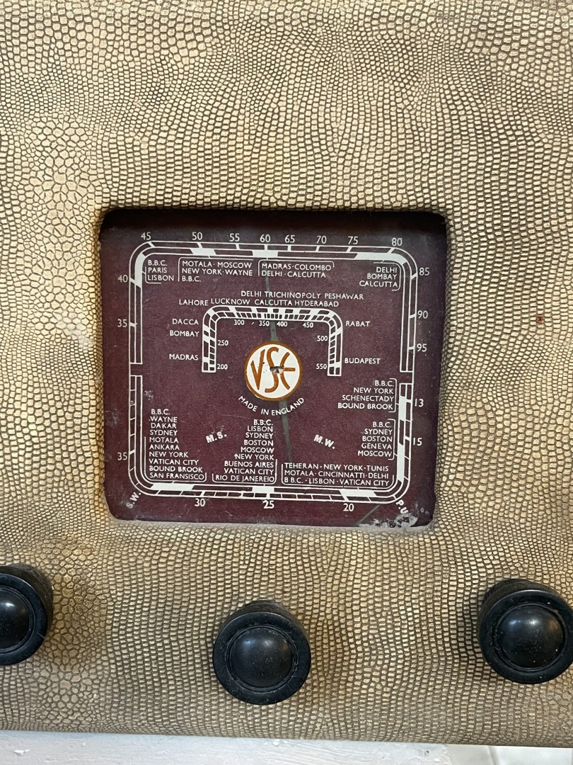 A 1940-1950s vintage VSE tube radio with a textured faux snakeskin exterior, maroon tuning panel, and classic black knobs. Made in England, this piece is untested and ideal for collectors or as a decorative display. This vintage VSE tube radio, made in England, is a rare and captivating piece from the 1940-1950s. It features a distinctive faux snakeskin textured exterior, giving it a stylish mid-century appeal. The maroon front tuning panel proudly displays radio stations from global cities such as New York, Moscow, and Paris. With classic black control knobs and a retro speaker grille, this radio embodies the design and craftsmanship of the era. While its internal tube components remain intact, the operational status of the radio has not been tested, making it an ideal display piece or restoration project for collectors of vintage electronics. \n \nEstimate Era: 1940-1950s \n \nStory follows: \n \nImagine gathering around this radio in the 1950s, tuning into broadcasts from distant cities like New York or Moscow. This VSE radio, with its elegant faux snakeskin finish, was once a centerpiece of home entertainment. Its vintage charm endures, even as its functionality remains untested, making it a perfect candidate for restoration or as a nostalgic display piece in a modern home.