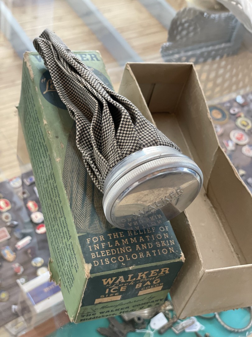 Authentic 1950s Walker ice bag with original box. A nostalgic American medical collectible, ideal for vintage display or retro decor themes. \n \n🌟 Special Aspect: \n \nIncludes the original printed box with period advertising and intact metal cap — a rare find in this condition. This rare Walker “Leek-Pruf” Ice Bag from the 1950s is a striking example of mid-century medical design. Manufactured in the U.S.A. by The Walker Company, Middleboro, Mass., it comes in its original box with classic vintage typography and graphics. \n \nOriginally intended for relief from inflammation, bleeding, and skin discoloration, this item is now offered strictly as a decorative piece — a nostalgic tribute to early 20th-century healthcare and design. The plaid-patterned fabric bag, paired with its embossed metal cap and aged cardboard box, makes this an excellent display item for vintage collectors, medical history enthusiasts, or retro-themed interiors. \n \nIdeal for curio cabinets, apothecary-style shelves, barber shops, or themed decor installations. \n \n🕰️ Estimated Era: \n \nCirca 1950s \n \n💬 Storytelling: \n \nOnce used for healing and comfort in homes and clinics, this little piece of history now brings vintage charm to your shelf. It tells a quiet story of care and design from a time when even medical tools carried a touch of character.