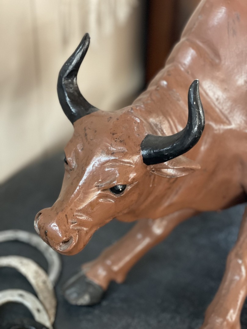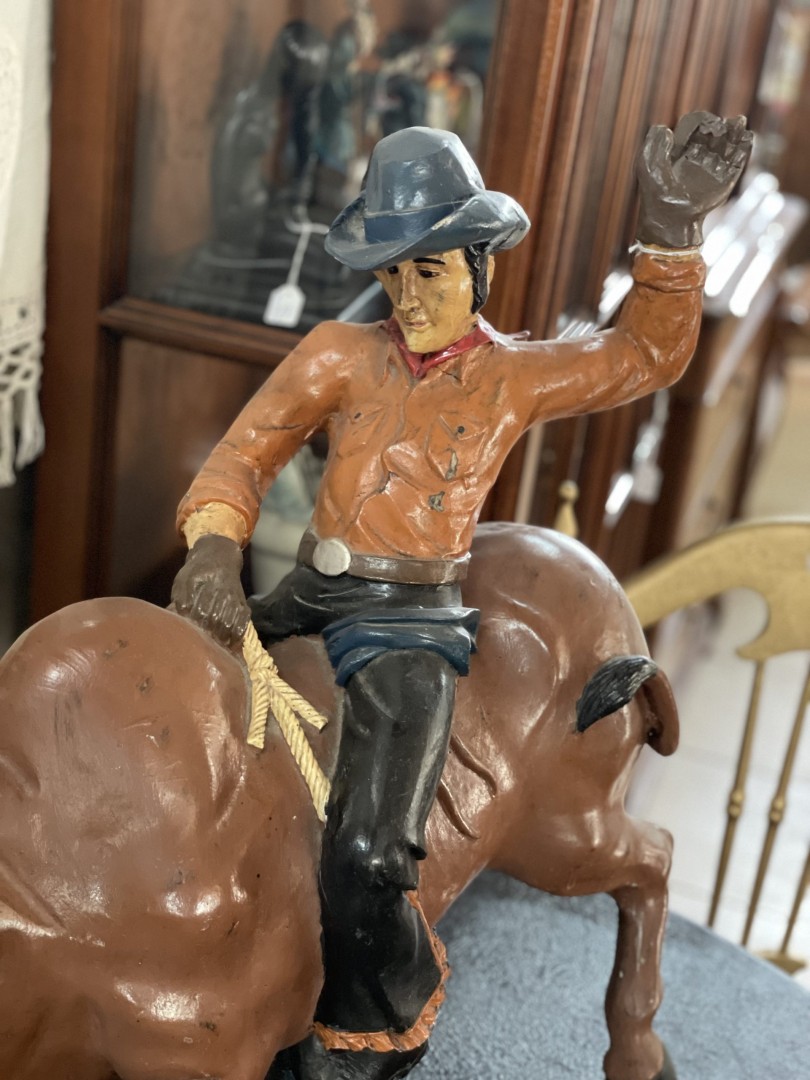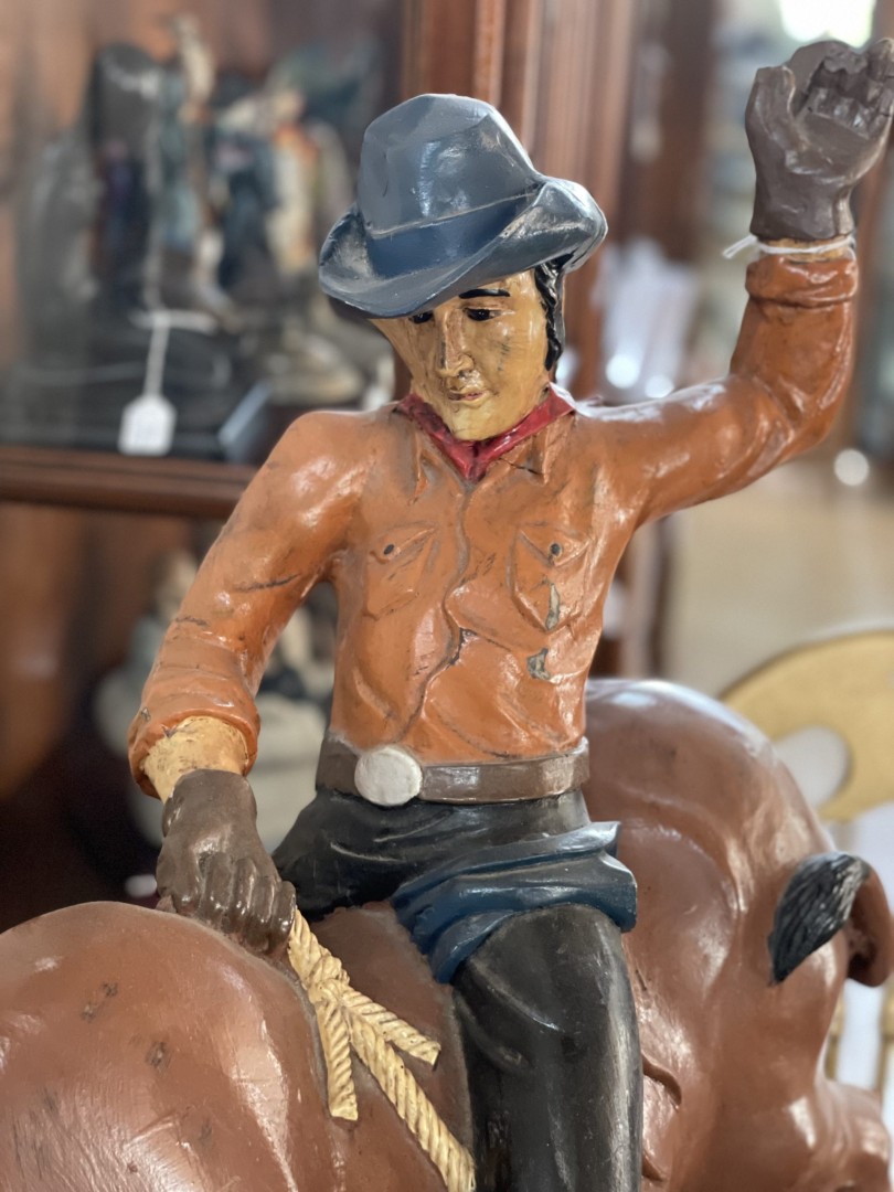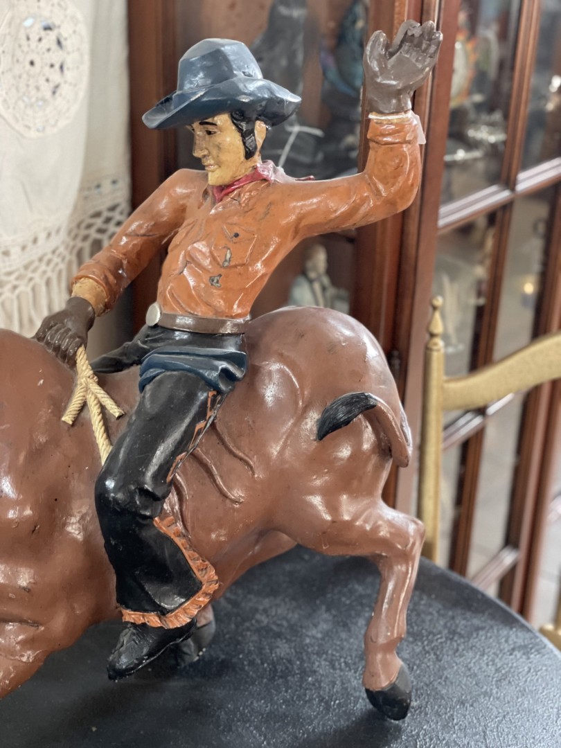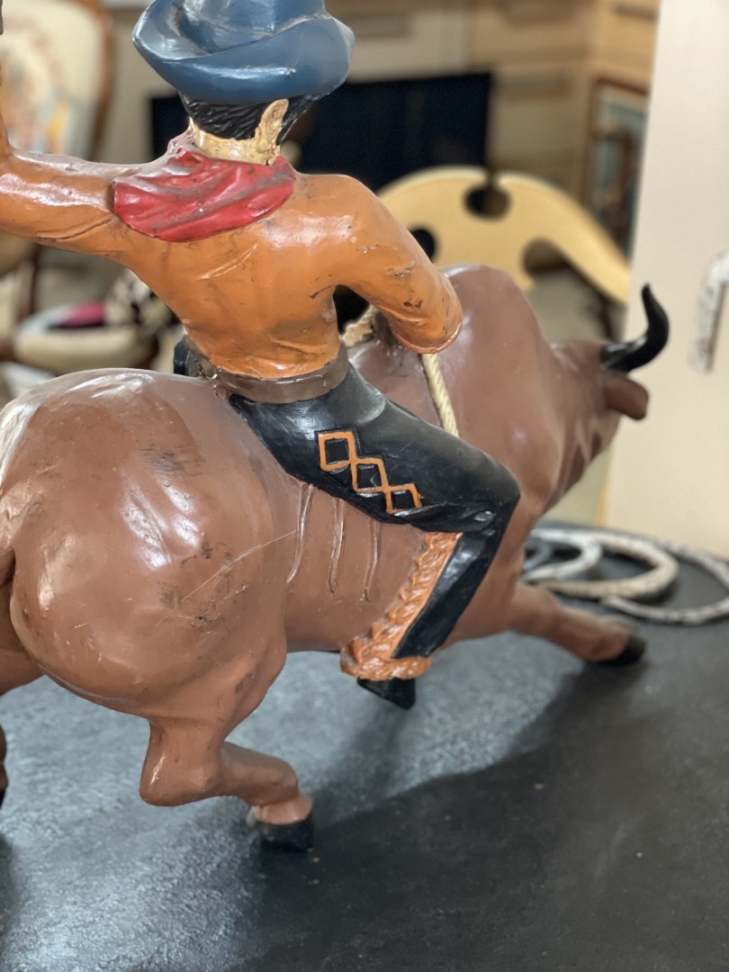This unique vintage figurine captures the spirit of the Wild West with a hand-painted sculpture of a cowboy riding a bull. The detailed craftsmanship showcases the cowboy’s attire, complete with a blue hat, orange shirt, and black chaps, as he holds onto the bull’s rope with one hand raised high in a classic rodeo pose. This unique vintage figurine captures the spirit of the Wild West with a hand-painted sculpture of a cowboy riding a bull. The detailed craftsmanship showcases the cowboy’s attire, complete with a blue hat, orange shirt, and black chaps, as he holds onto the bull’s rope with one hand raised high in a classic rodeo pose. The bull is depicted in a dynamic stance, highlighting its powerful form and motion. This collectible piece is perfect for enthusiasts of Western decor, cowboy memorabilia, or rodeo history. \n \nThe figurine appears to be in a style popular in the mid-20th century, particularly between the 1950s and 1970s. This era saw a fascination with Western themes, which were widely depicted in both popular culture and home decor items.