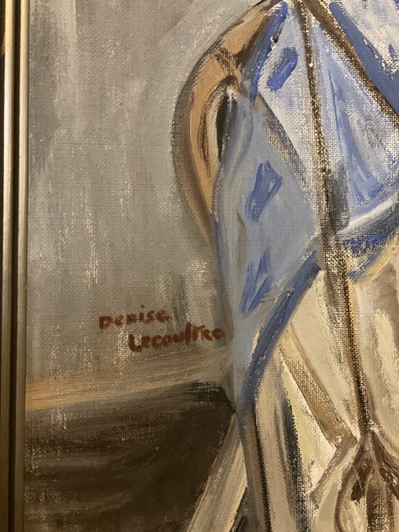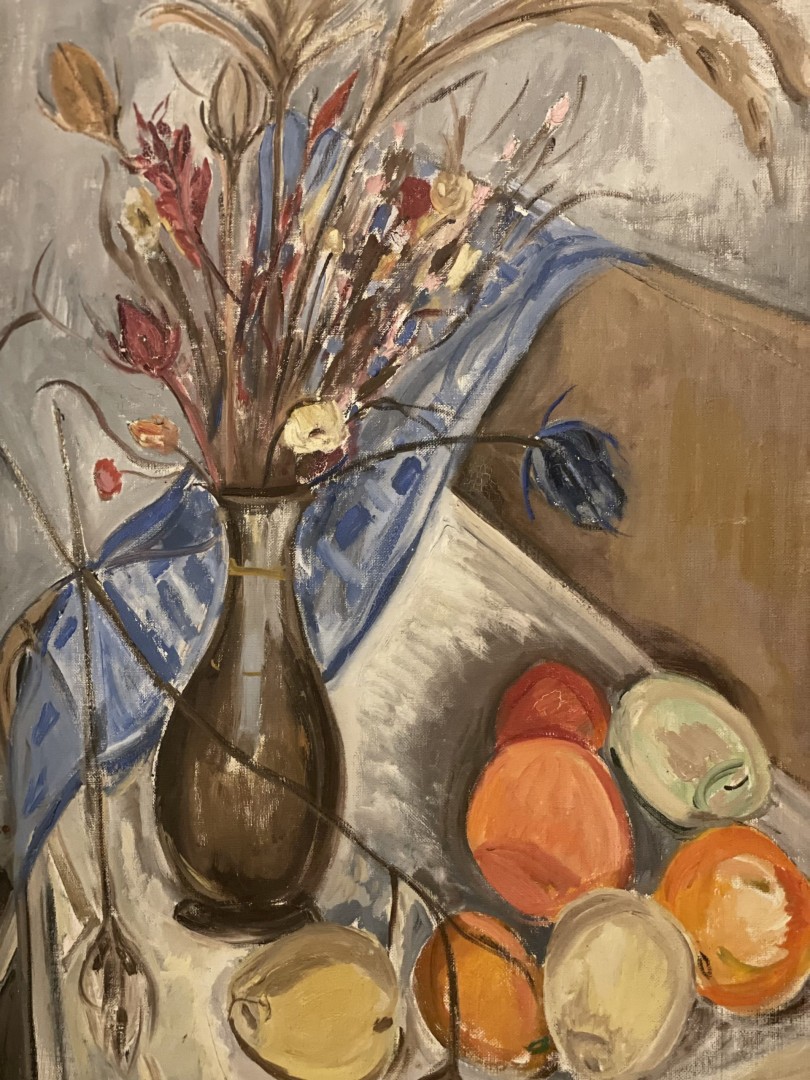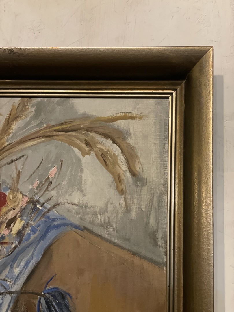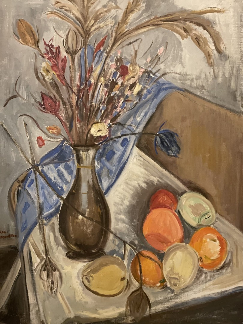 A vintage still life painting by Denise Lecoultre from the 1950s-1960s. This vibrant artwork features dried flowers, colorful fruits, and a rustic table, framed in an elegant gilded wood frame. \n \nSpecial Aspect: \n \nThe signature of Denise Lecoultre and the detailed depiction of dried flowers and fruits make this painting a unique example of mid-century French art. Own a piece of history with this vintage still life oil painting signed by Denise Lecoultre, created in the 1950s-1960s. The painting depicts a rustic table adorned with dried flowers and colorful fruits, enhanced by a blue-patterned fabric. The artist’s bold brushstrokes and harmonious color palette bring life and depth to the composition. Framed in a gilded wood frame, this artwork is ready to enrich any room with its charm and character. This piece reflects the beauty of mid-20th-century French artistry, perfect for collectors or art enthusiasts. \n \nStorytelling: \n \nPicture a serene French countryside home, where life feels simple and peaceful. This painting invites you to experience the warmth of a quiet afternoon, where vibrant flowers and fresh fruits capture the joy of everyday moments. Add this artwork to your space and create your own timeless story.