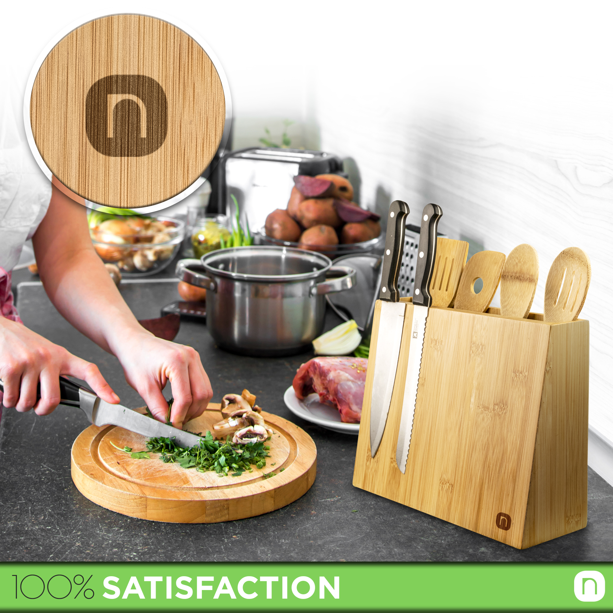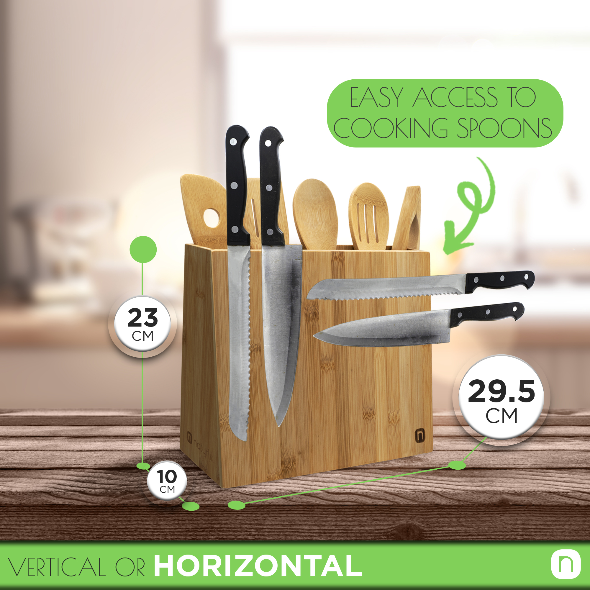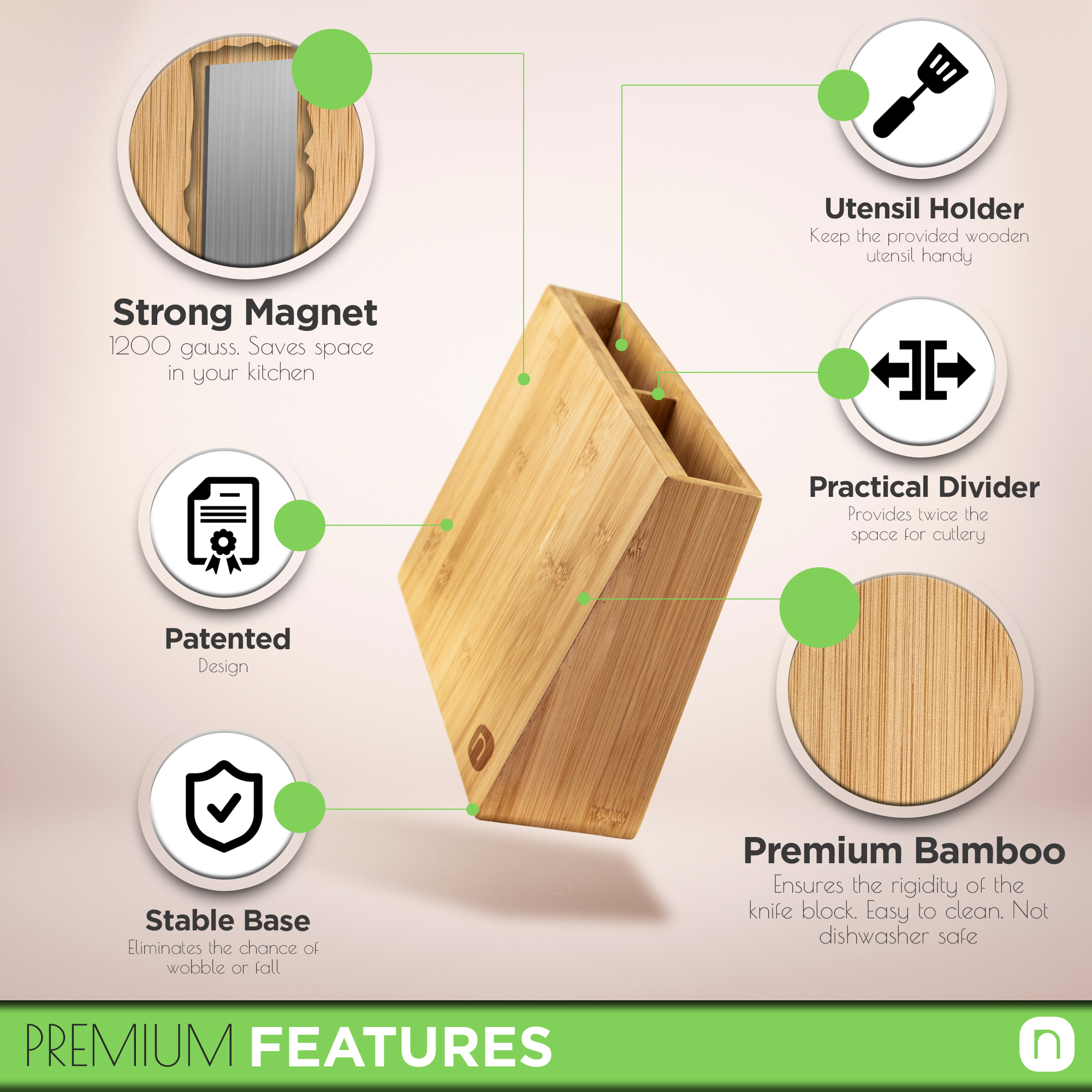 The set includes the naturlik magnetic knife block and 5-piece bamboo utensil set. Knives shown are for illustration only.