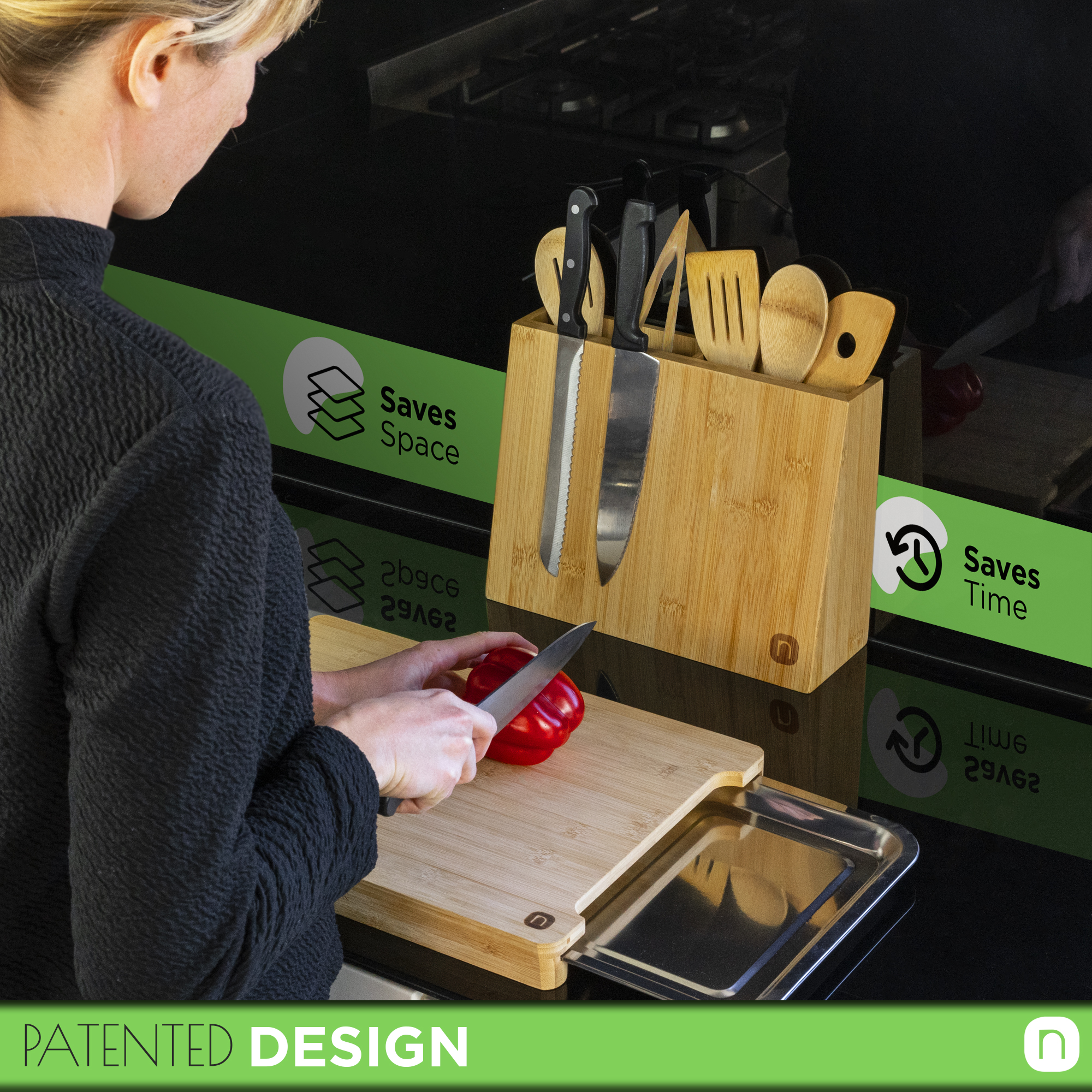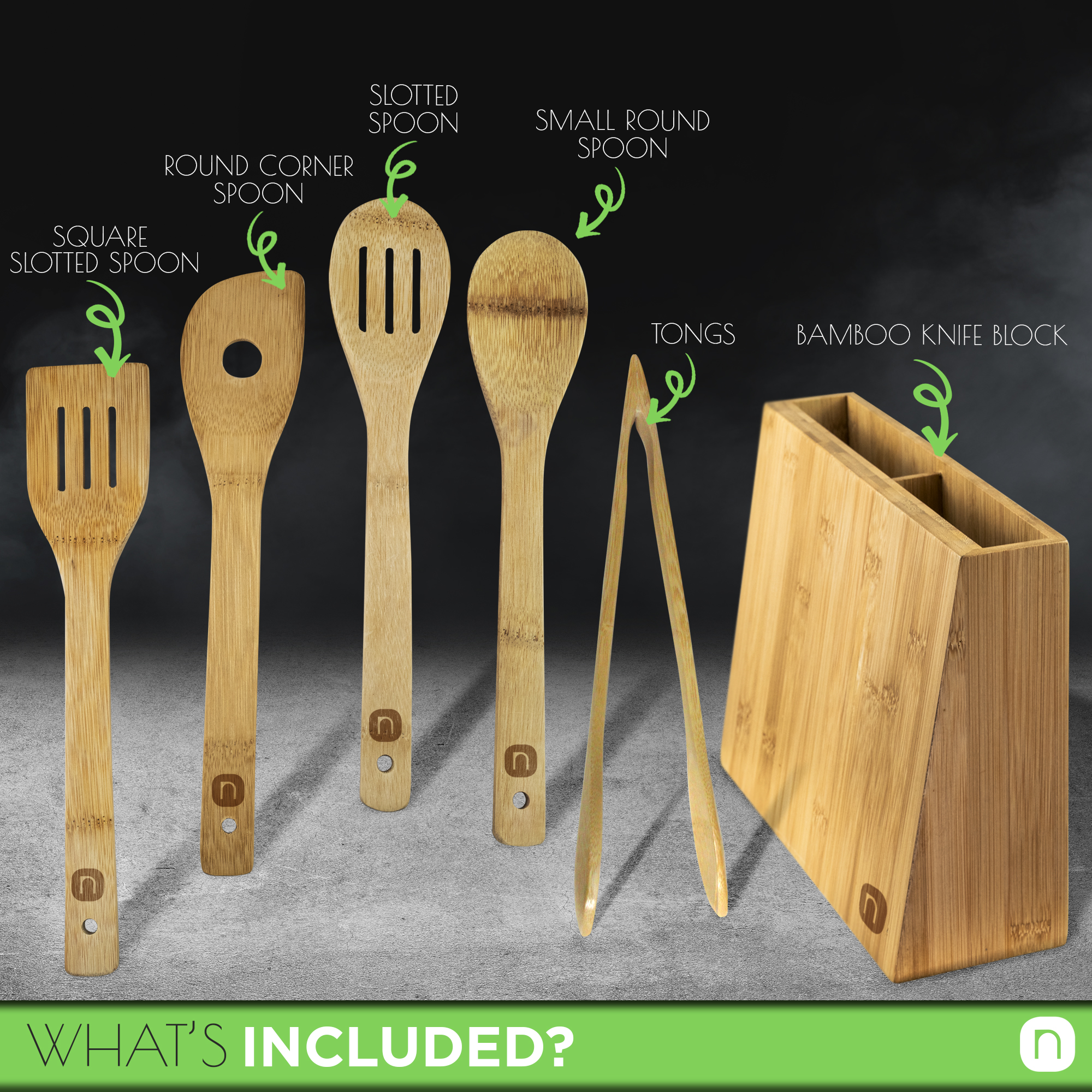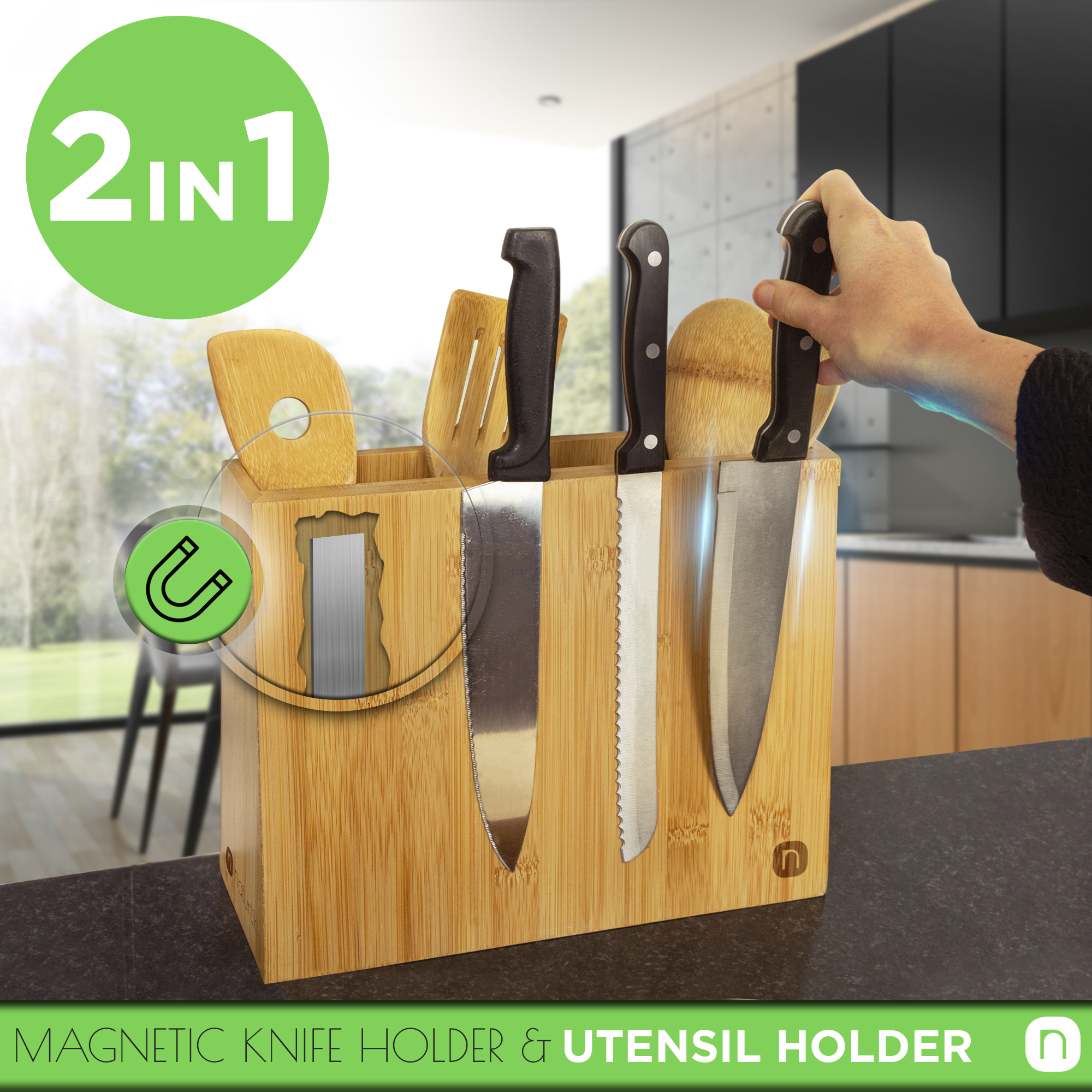The set includes the naturlik magnetic knife block and 5-piece bamboo utensil set. Knives shown are for illustration only.