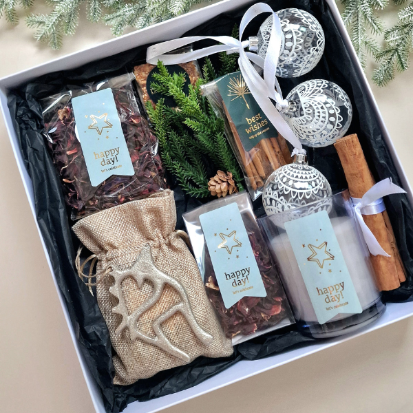 Box includes a hand-picked collection of Christmas-themed items in an elegant presentation white box (29 x 29 x 8 cm).