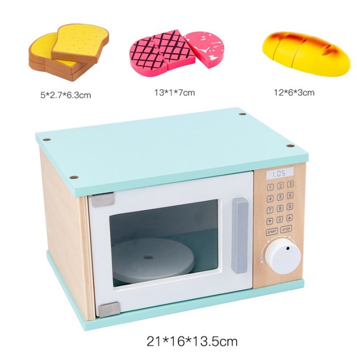 Φουρνάκι κλασικού στύλ φτιαγμένο απο ξύλο απο μη τοξική μπογιά σε παστέλ χρωματισμό. Η πόρτα του ανοίγει και κλείνει, ο δίσκος μέσα στο φουρνάκι περιστρέφεται δια χειρός και το κουμπί μπορεί να περιστραφεί διαθέτοντας ένα διακριτικό ήχο "κλικ"! Συνοδεύεται με φιλικά προς το περιβάλλον όμορφα ξύλινα αξεσουάρ: τρεις φέτες ψωμί, μπριζόλα, μπαγέτα και ψαράκι τα οποία μπορούν να κοπούν με το ενσωματομένο παιχνίδι μαχαίρι και να ενωθούν εκ νέου μιας και έχουν μαγνητάκια. Αυτό το σετ παιχνίδιού προωθεί την φαντασία, δημιουργηκότητα και το ενδιαφέρον των παιδίων μας στις καθημερινές ασχολείες προσφέροντας ποιοτικό χρόνο μεταξύ γονέων και παιδιών. Classical style wooden oven from non toxic paint in pastel color. The door opens and closes, the inner plate of the oven rotates by hand and the button can be turn right or left creating a "click" sound! Assorted with eco friendly wooden accessories: three slices of bread, steak, baguette and fish which can be cut into pieces with the assorted wooden knife and combined back together as they have magnets. This role Pretend Toy Set exercise Social Skills, hand – eye coordination, imagination, creativity, interesting of our children in our daily routine byenjoying our Parent-Child time. Suitable Ages: Over 3 years old Product Dimensions: As shown on picture