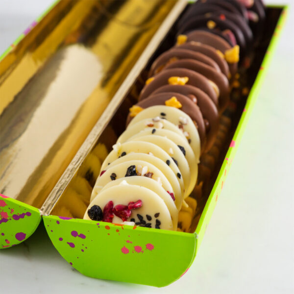 Our new mendiants box is the perfect gift to impress your friends, collegues or loved ones. Our prestigious gift box complements our artisanal mendiants, to perfection. Each mendiant is handcrafted with delicate precision, making every bite a fresh experience. Treat yourself or someone close to you with a gift of mouth watering mendiants.