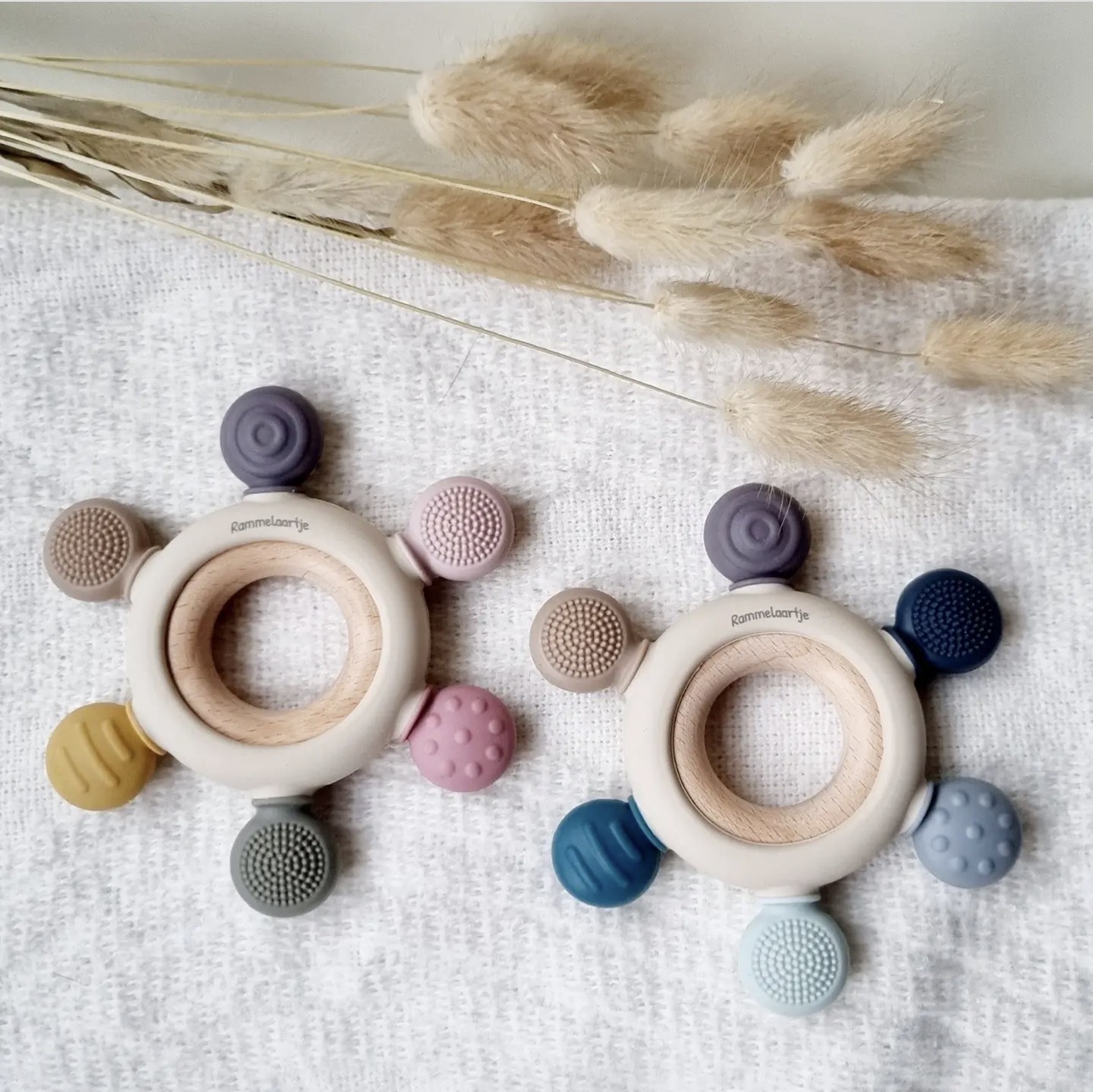 This sturdy teething ring is really a must-have! It is made of a beech wood ring and 100% baby-safe silicone. This makes it flexible, easy to grip and very nice to bite on. The relief keeps it interesting and massages the gums.
