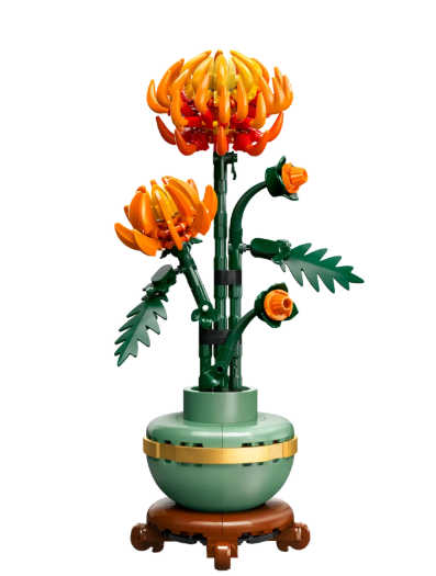 The LEGO Icons Chrysanthemum (set 10368) is a delightful addition to the LEGO Botanical Collection. This set features a detailed replica of a chrysanthemum with posable leaves and petals, showcasing the vivid orange flower in various stages of bloom. The set includes a chrysanthemum in full bloom, one blossoming, and two budding. It comes with a pastel-green flowerpot decorated with a golden band and set on a wood-effect plinth. This zero-maintenance faux flower makes an elegant home or office décor piece.