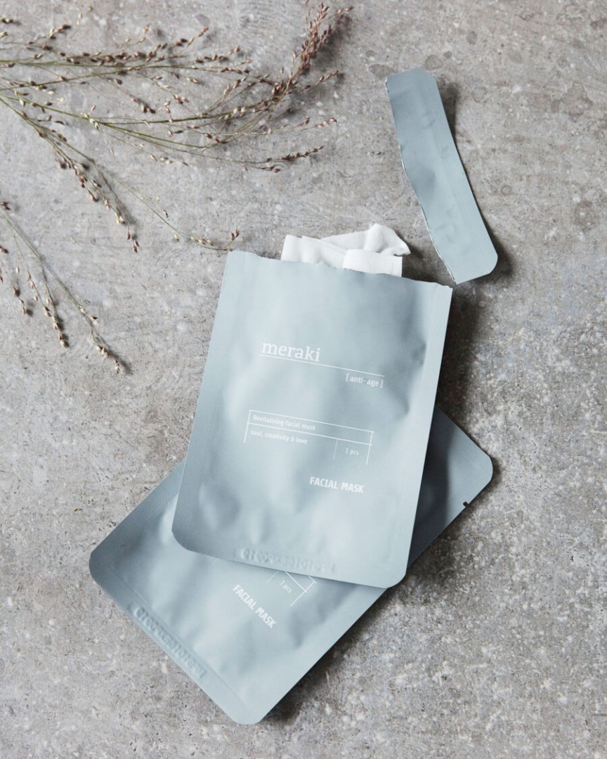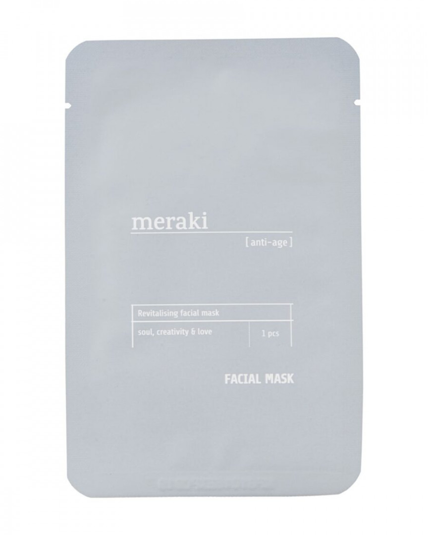 FACIAL MASK, ANTI-AGE Treat yourself to a refreshing facial treatment at home. Meraki’s anti-age facial mask is intense yet mild. It is full of active ingredients and antioxidants that give moisture and strengthen your skin’s elasticity and firmness. Make this facial mask a regular part of your weekly skincare routine, and your skin will feel more awake and firm than ever. Put your facemask on cleansed skin and let it sit for 20-30 minutes. Remove the mask gently. Massage the remaining cream into your skin. Avoid direct contact with your eyes. Suitable for all skin types. Each package contains one mask.