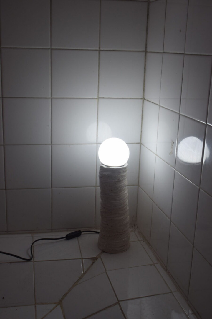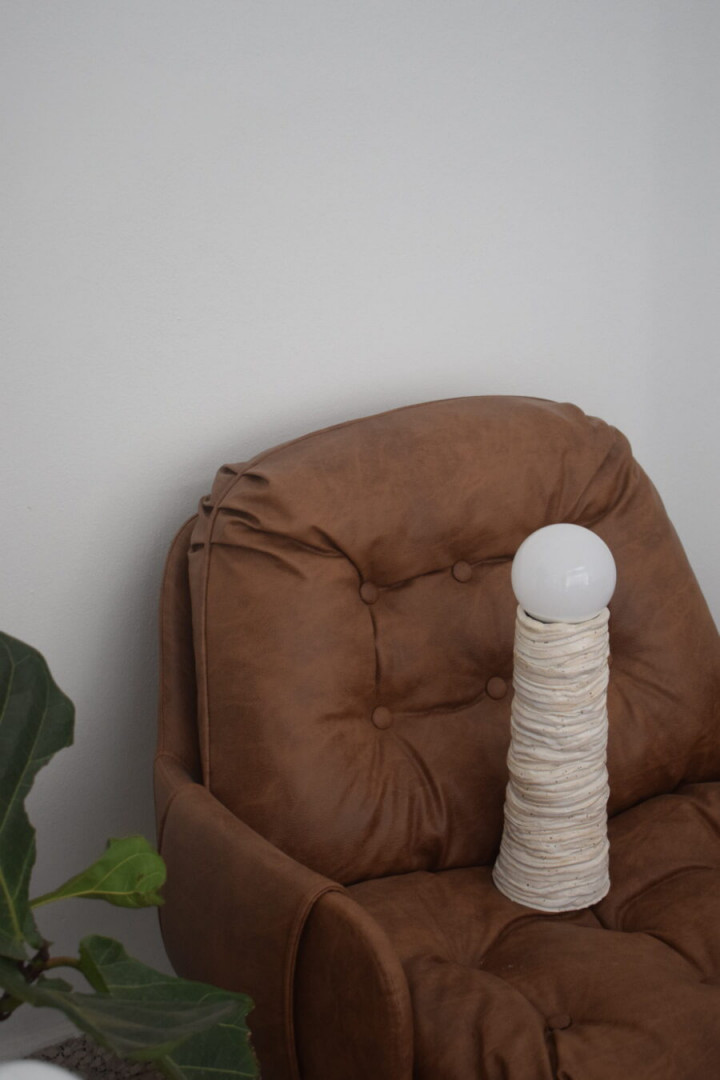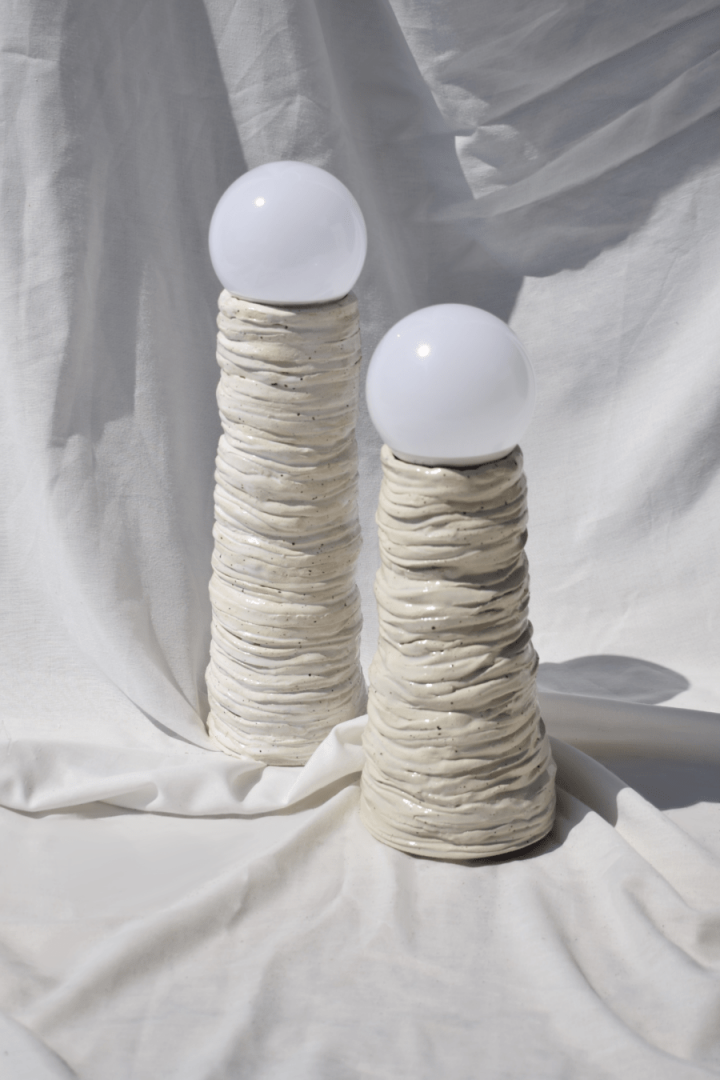 LAYERING TABLE LAMP / WHITE H 39cm X W 10,5 cm Handmade layering table lamp, created layer by layer by Kedros design studio. Made with love using stoneware clay, it has a unique abstract and wobbly shape and it adds a minimal & fun aesthetic to your bedroom and living room decor. You can decorate it on your bedside table to create a cozy atmosphere. All of our handmade products have a unique form and shape, therefore they are one of a kind pieces.