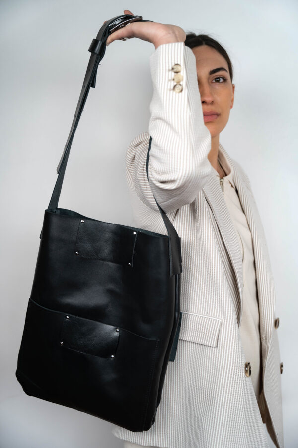 h 42 x l 36cm Black color Handmade authentic leather bags. Made by MA FIL brand. Designed and produced in Greece.