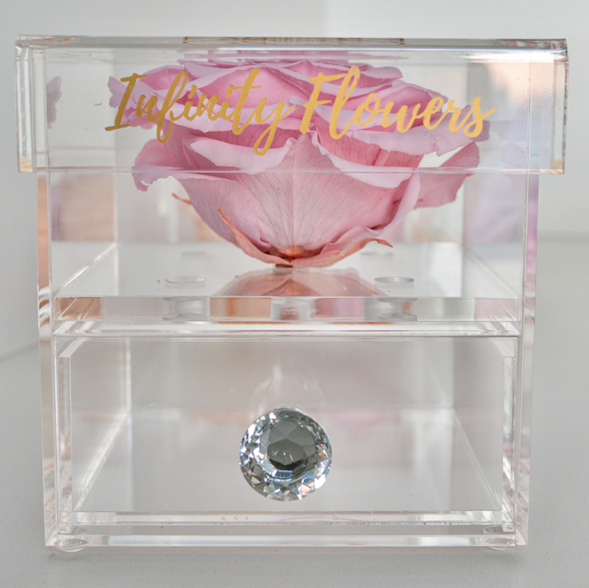 El Ideal Soltero features a stunning big infinity rose in a transparent plexi glass box with drawer that protects the rose while enhancing its beauty.