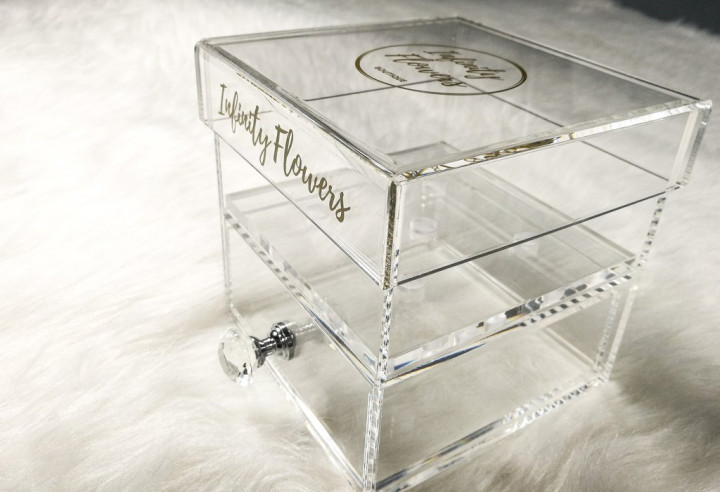 El Ideal features 4 stunning infinity roses in a transparent plexi glass box with drawer that protects the roses while enhancing its beauty.