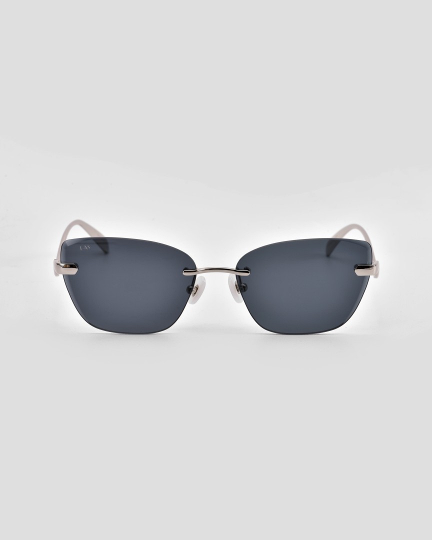 The Spark sunglasses bring a daring lightness to the collection with their rimless cat-eye silhouette, a design that feels both refined and boldly futuristic. From the front, the frame is minimal and sleek, while the temples reveal a sculptural 3D curve, catching the eye with a graceful play of form and movement.