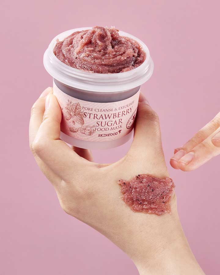 SKINFOOD Strawberry Sugar Food Mask is a brightening, vitality recharging, exfoliating facial scrub. Contains 36% of mineral-rich black sugar to make the skin super smooth while exfoliating the dead skin cells and removing the excessive sebum effectively.
